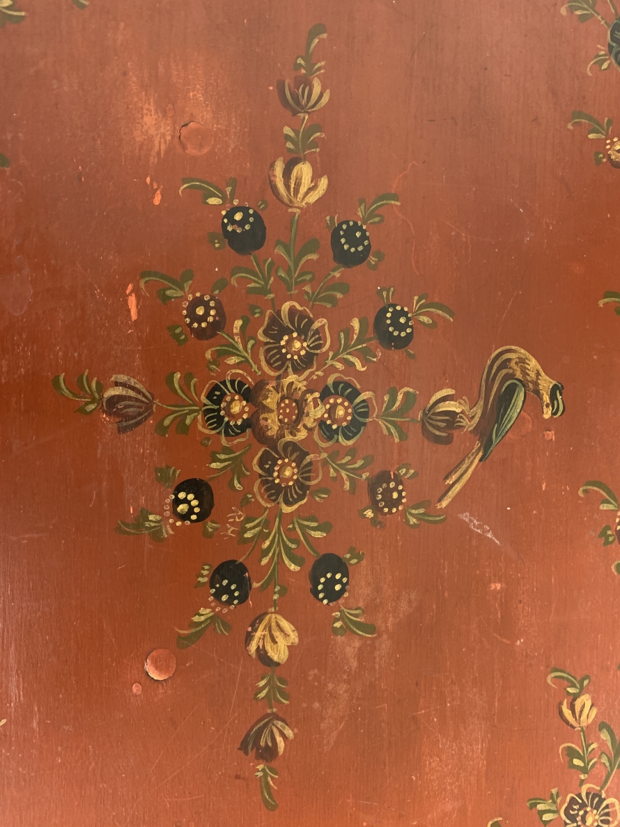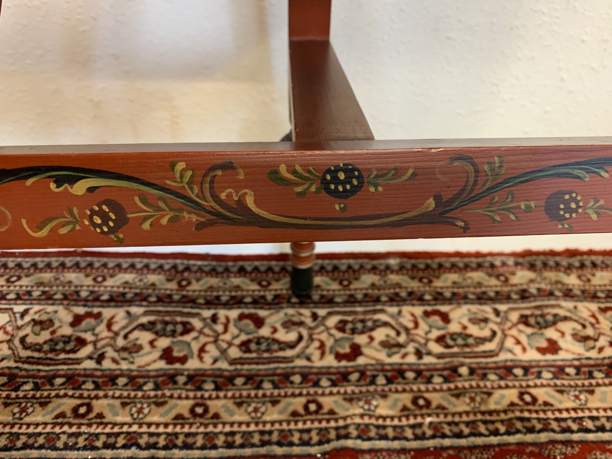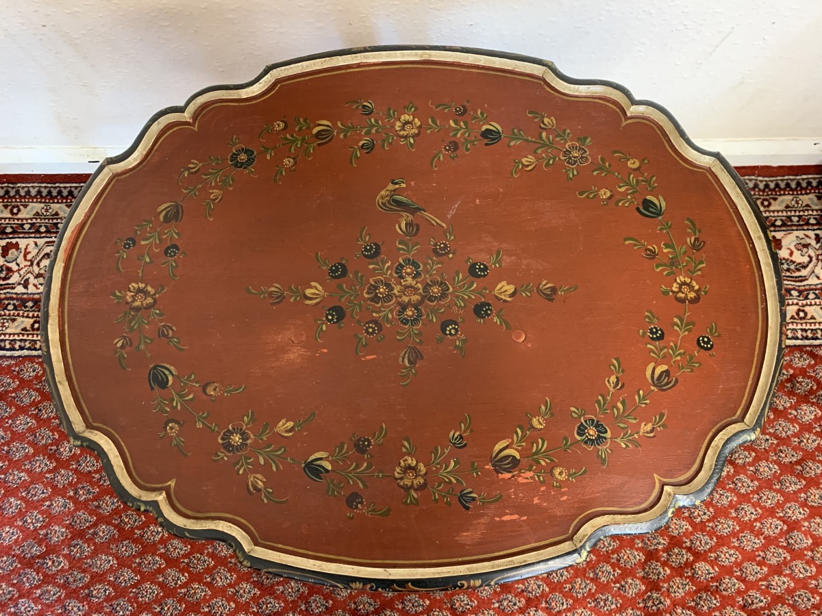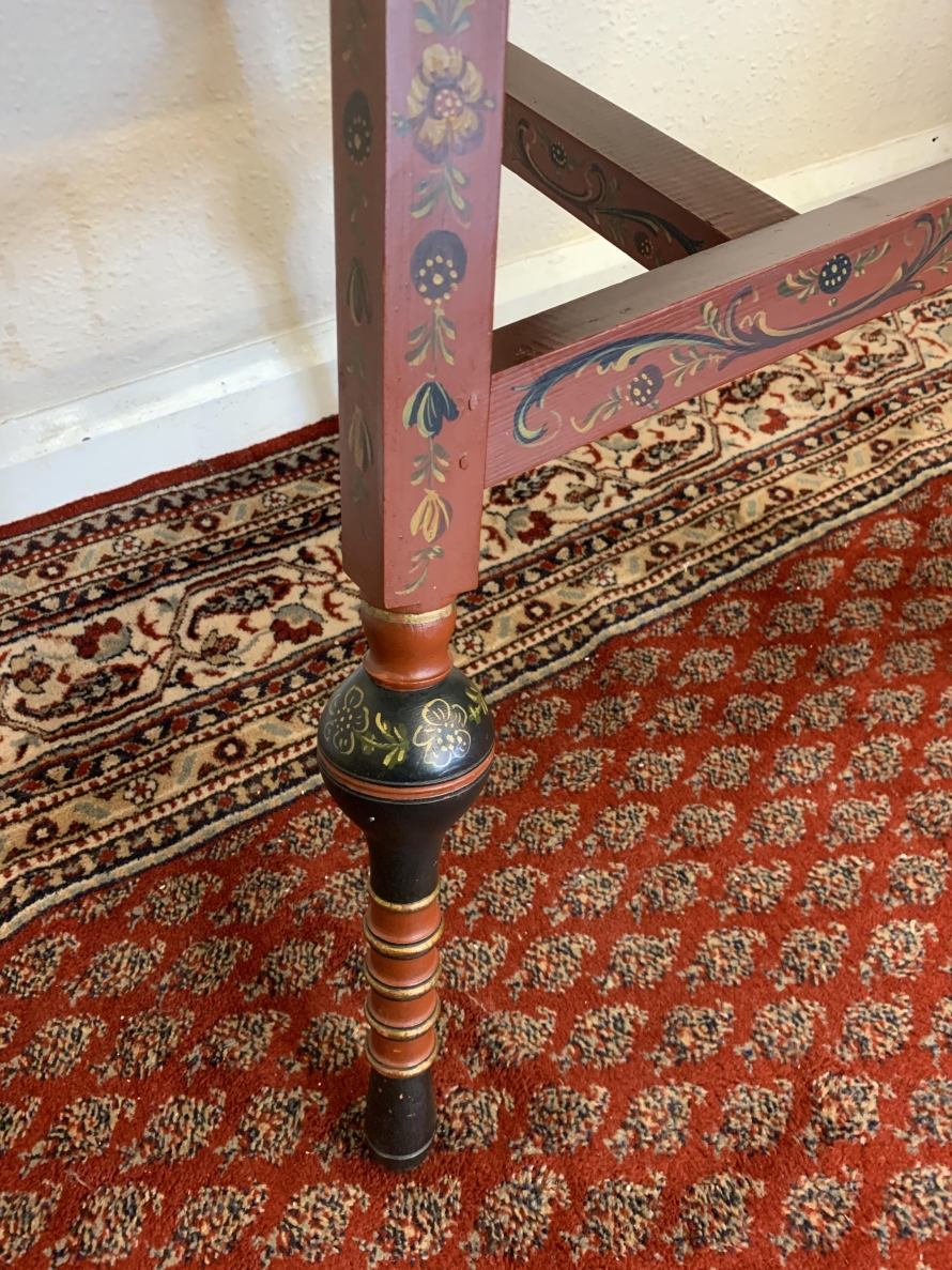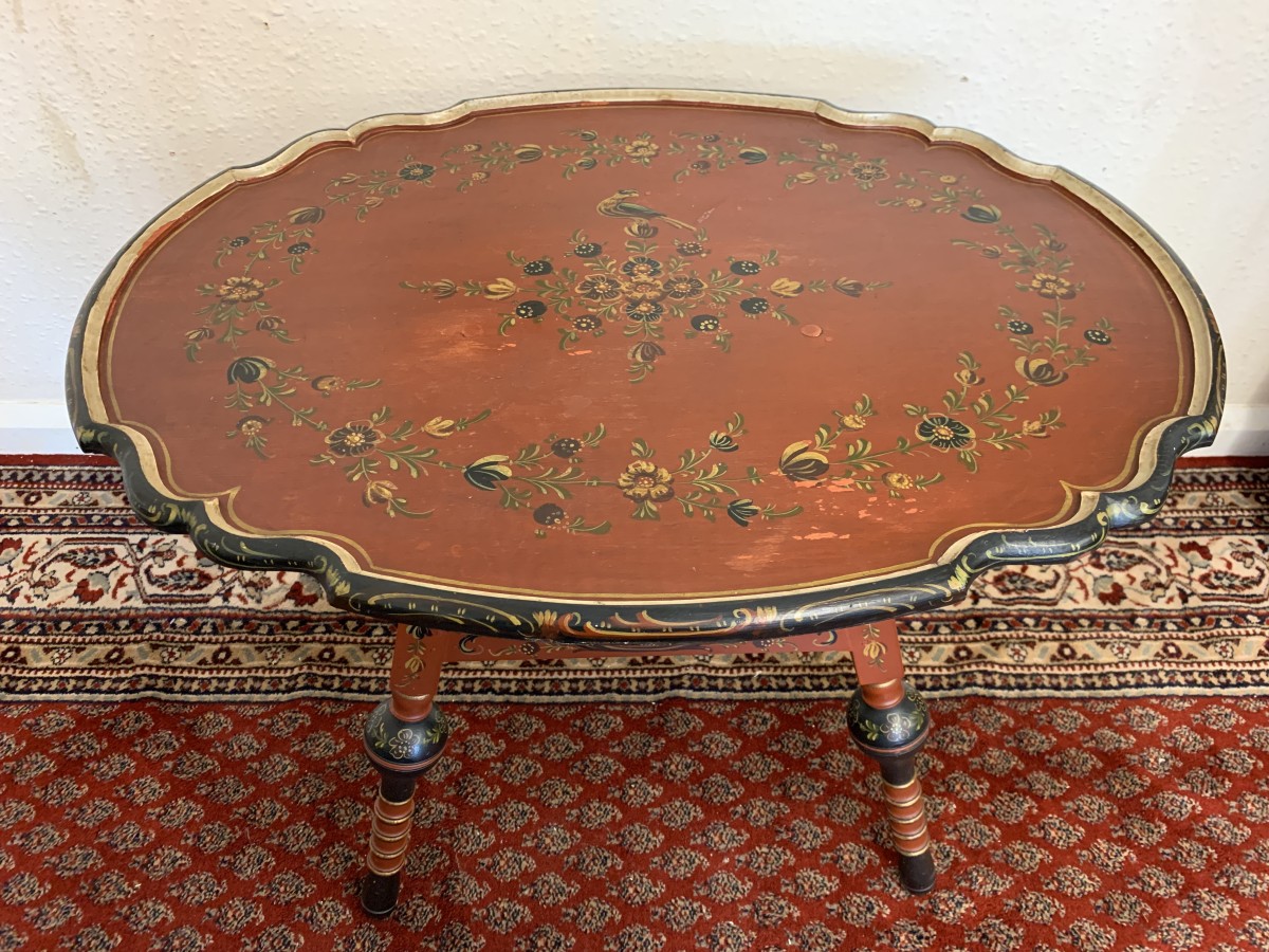 The shaped top having a black and gilt edging with hand painted floral decoration to the top. Three fabulous painted turned legs with painted stretcher supports.