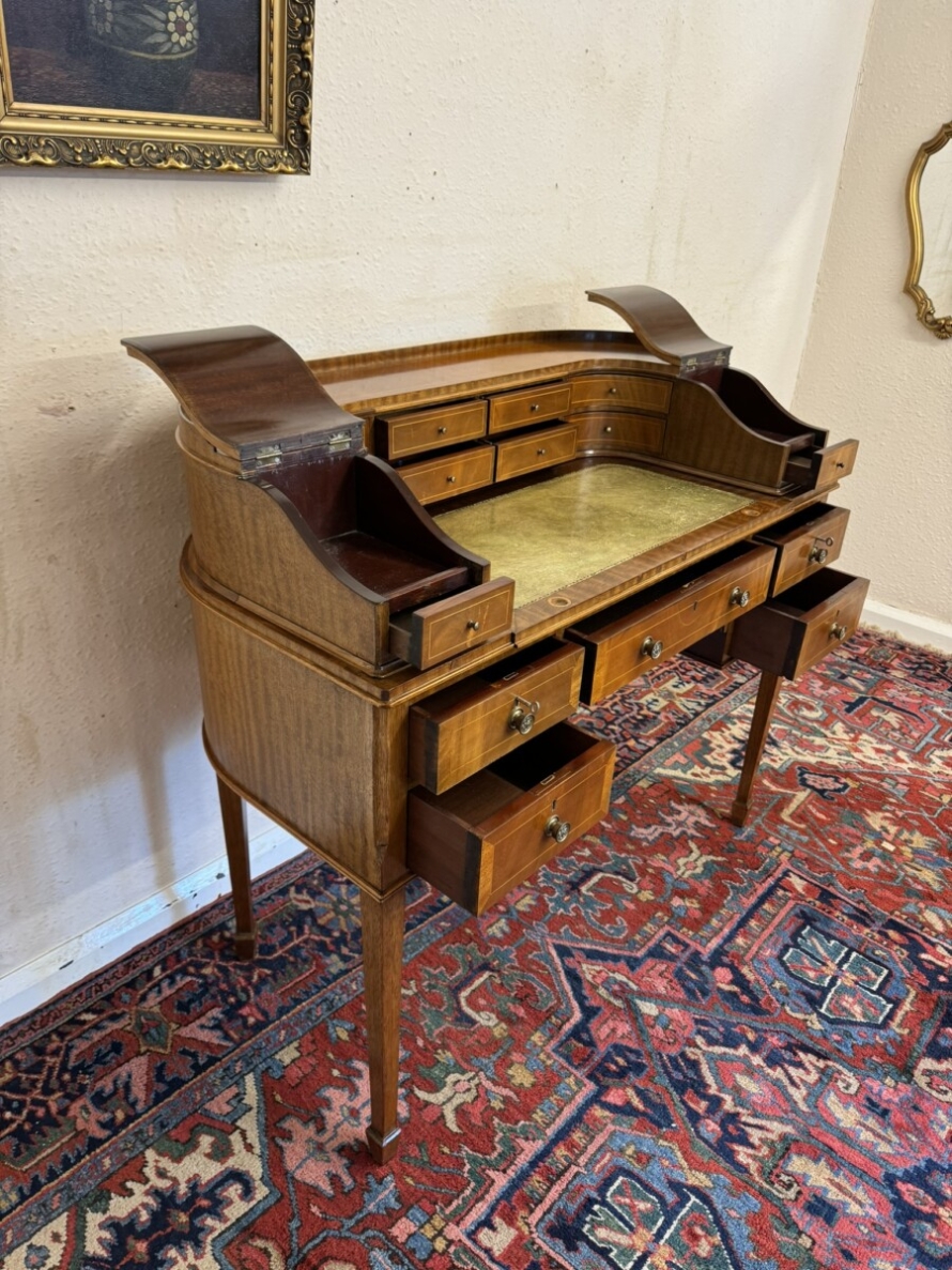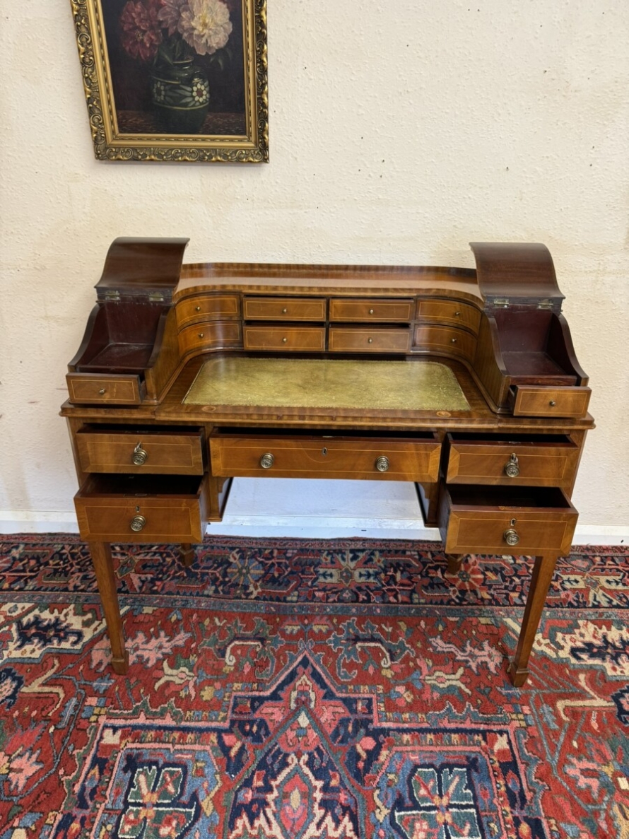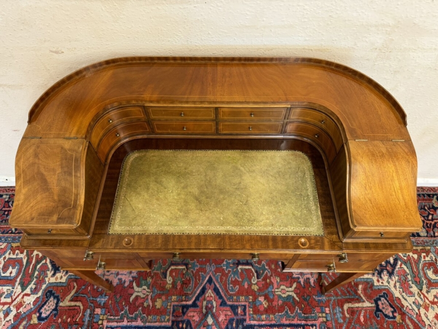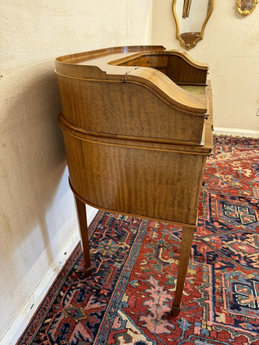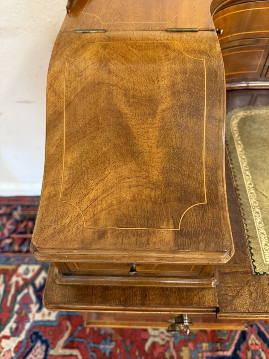 A truly stunning desk. The curved top has eight drawers at the back, curved lift up lid compartments with a drawer to the front. The leathered top slides forward to offer more workspace. Lockable knee hole drawer below is flanked by a pair of lockable drawers. This fabulous desk sits on tapered legs on block feet.