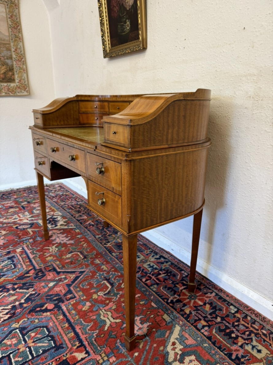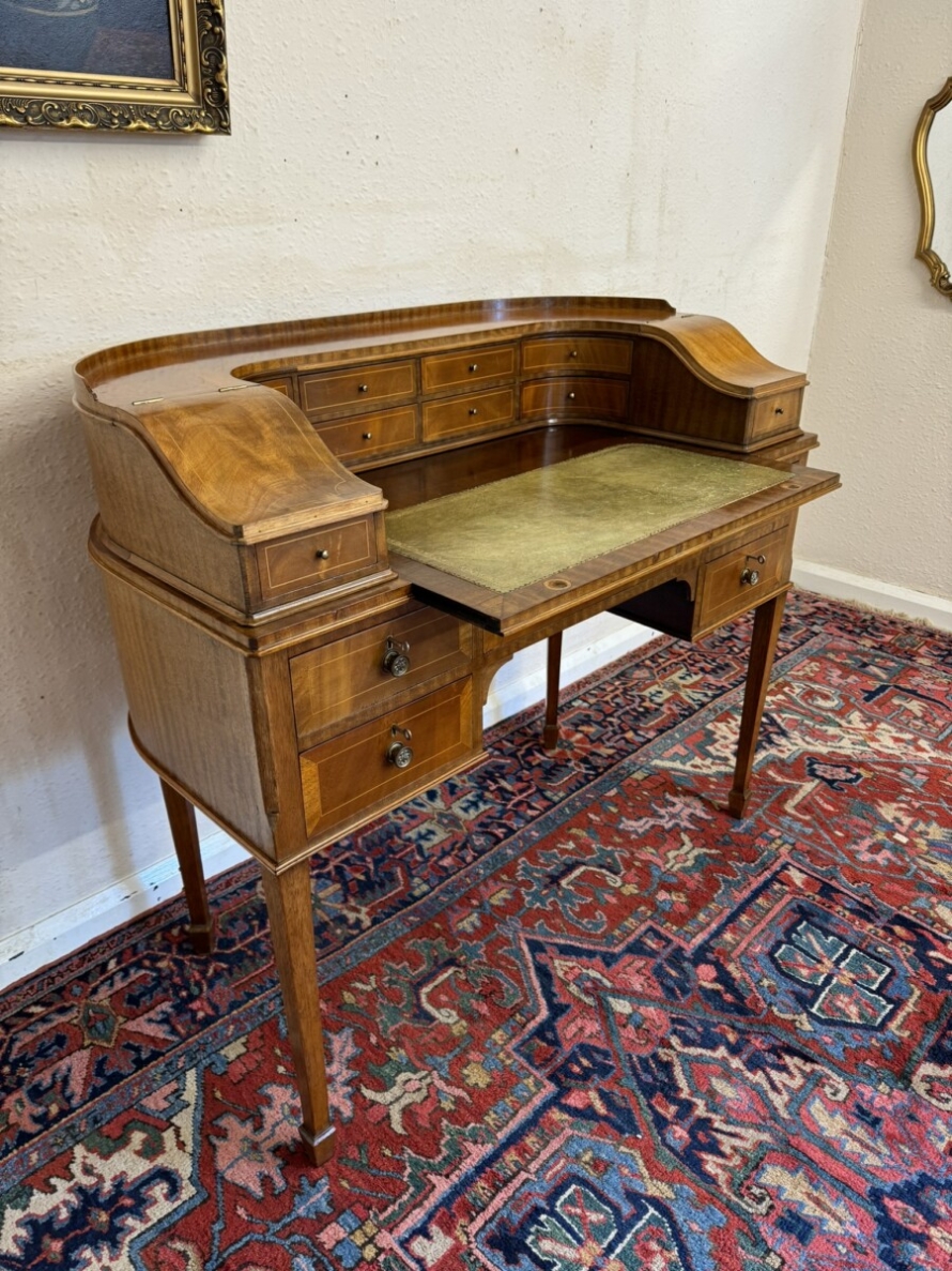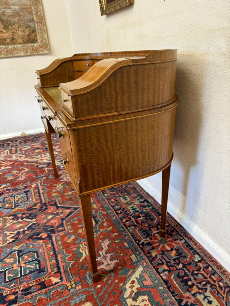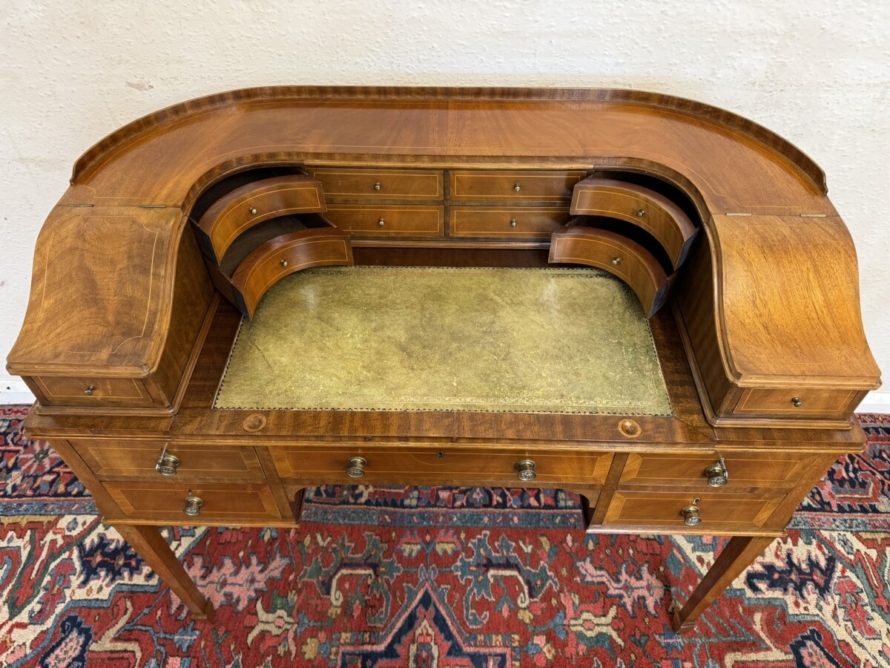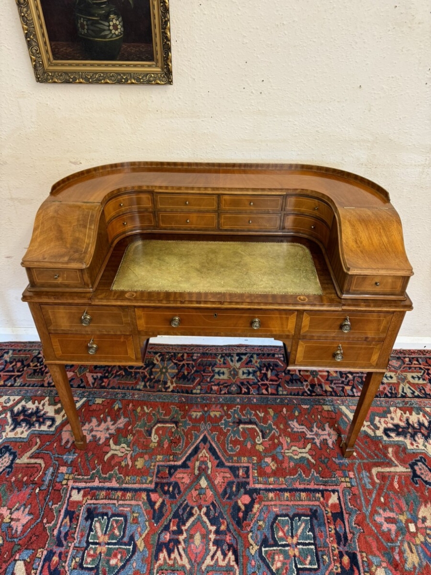 A truly stunning desk. The curved top has eight drawers at the back, curved lift up lid compartments with a drawer to the front. The leathered top slides forward to offer more workspace. Lockable knee hole drawer below is flanked by a pair of lockable drawers. This fabulous desk sits on tapered legs on block feet.