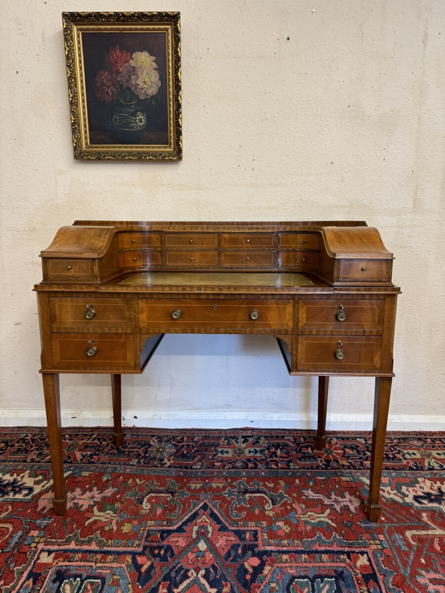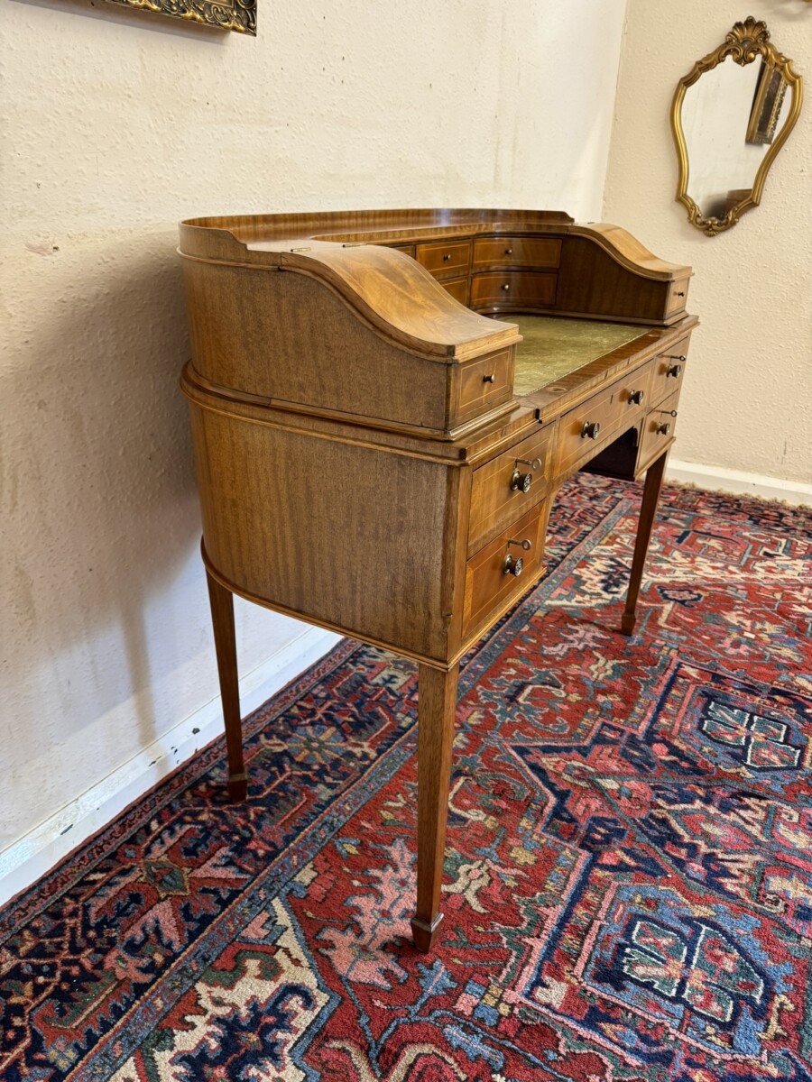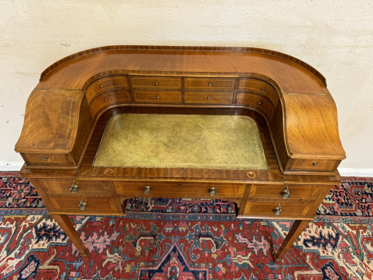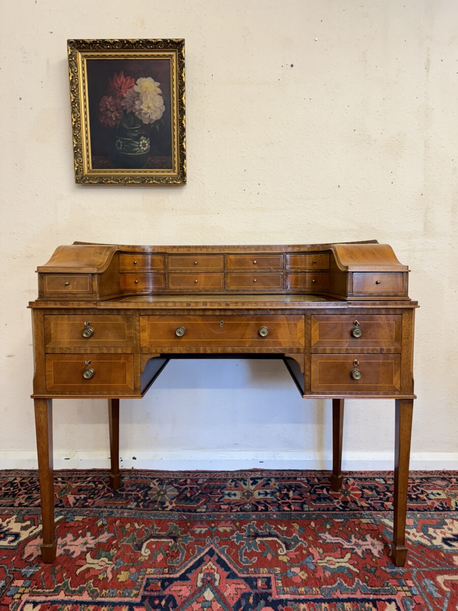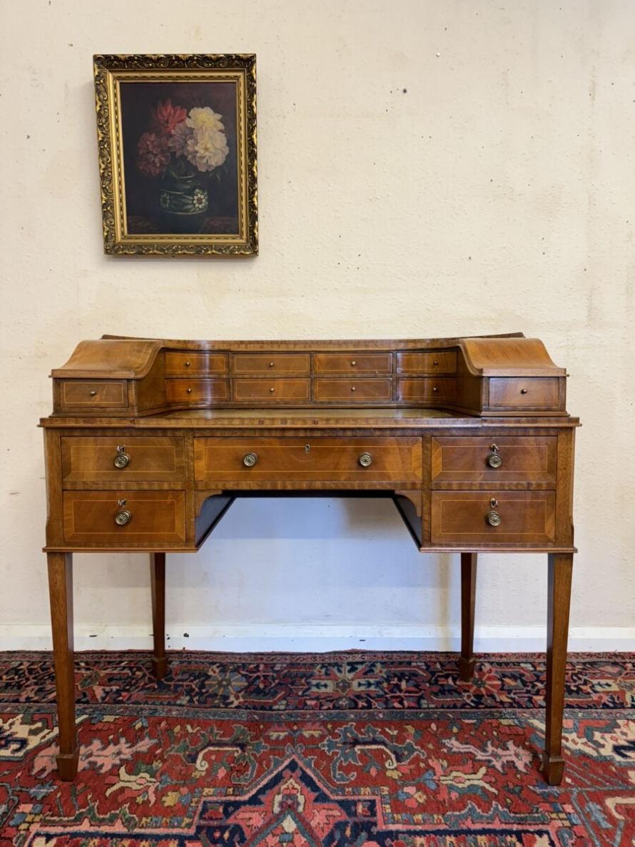 A truly stunning desk. The curved top has eight drawers at the back, curved lift up lid compartments with a drawer to the front. The leathered top slides forward to offer more workspace. Lockable knee hole drawer below is flanked by a pair of lockable drawers. This fabulous desk sits on tapered legs on block feet.