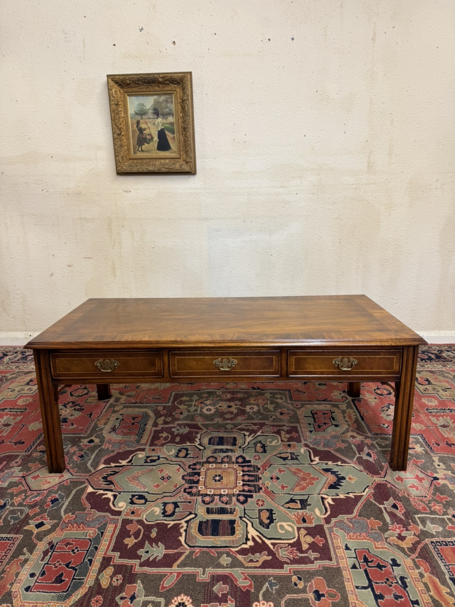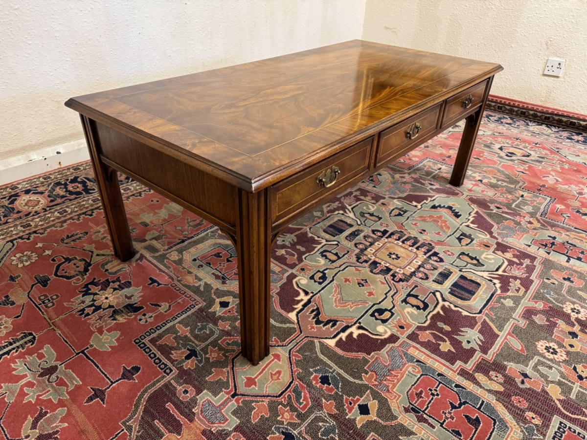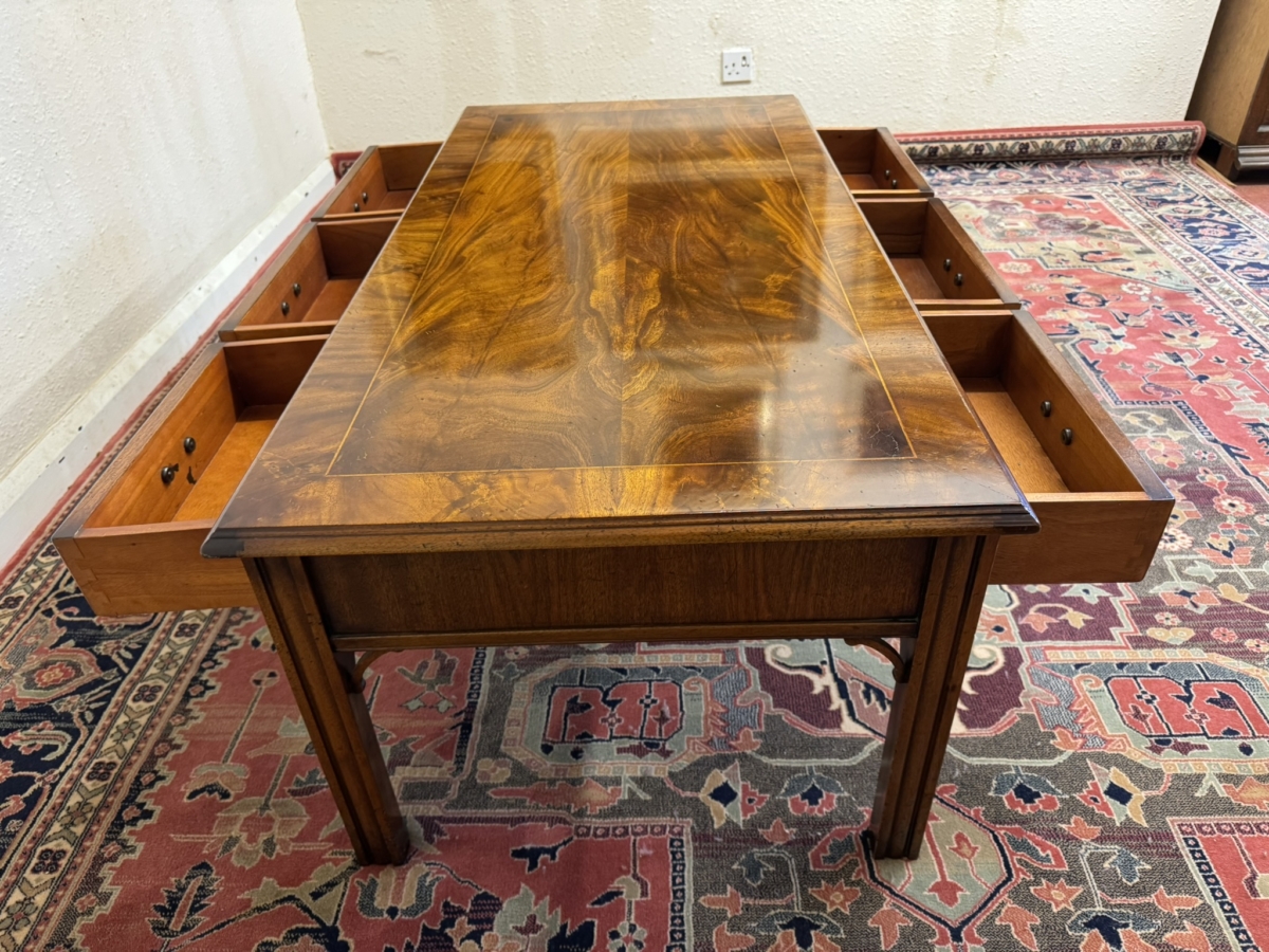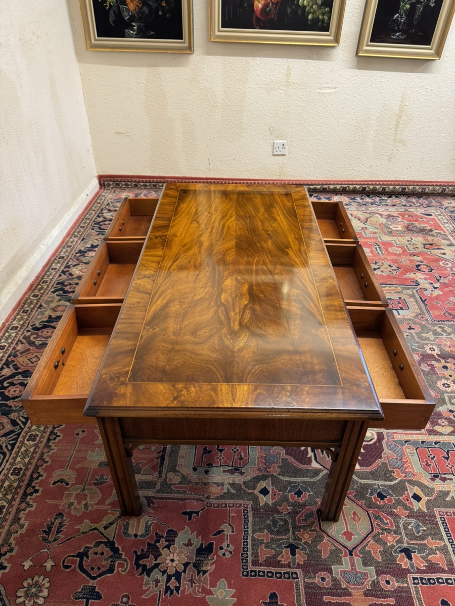 The table is made in striking mahogany. The top has a cross banded edging and string inlay decoration. There are six drawers, each drawer having inlaid decoration and a brass drop handle. This fabulous coffee table sits on four reeded legs.