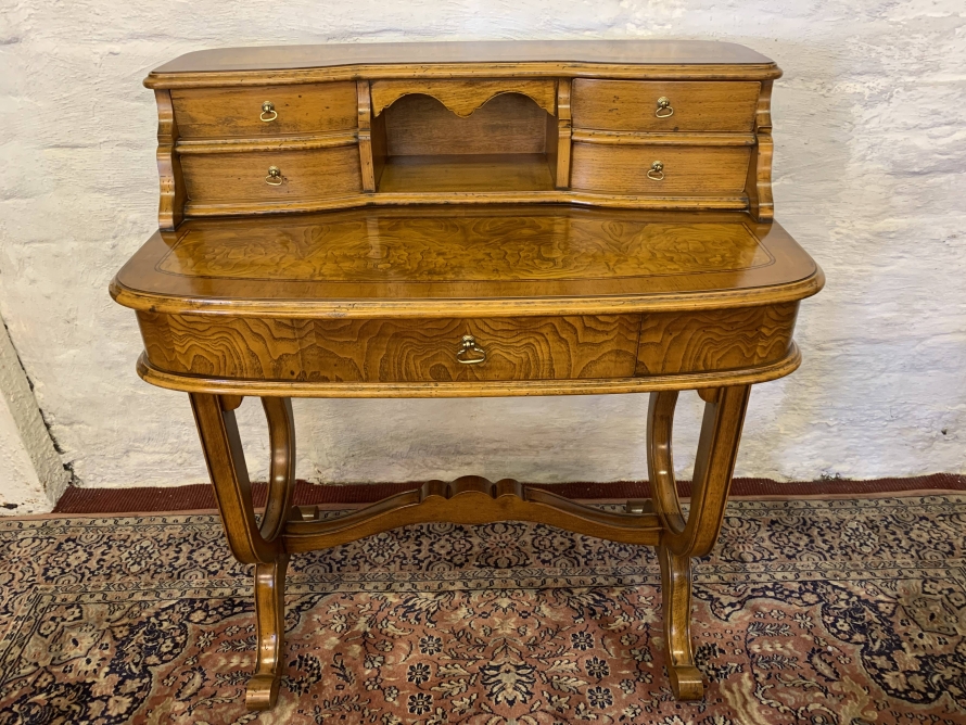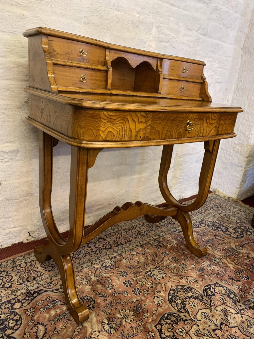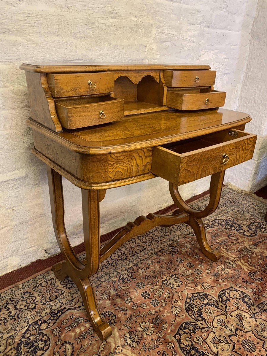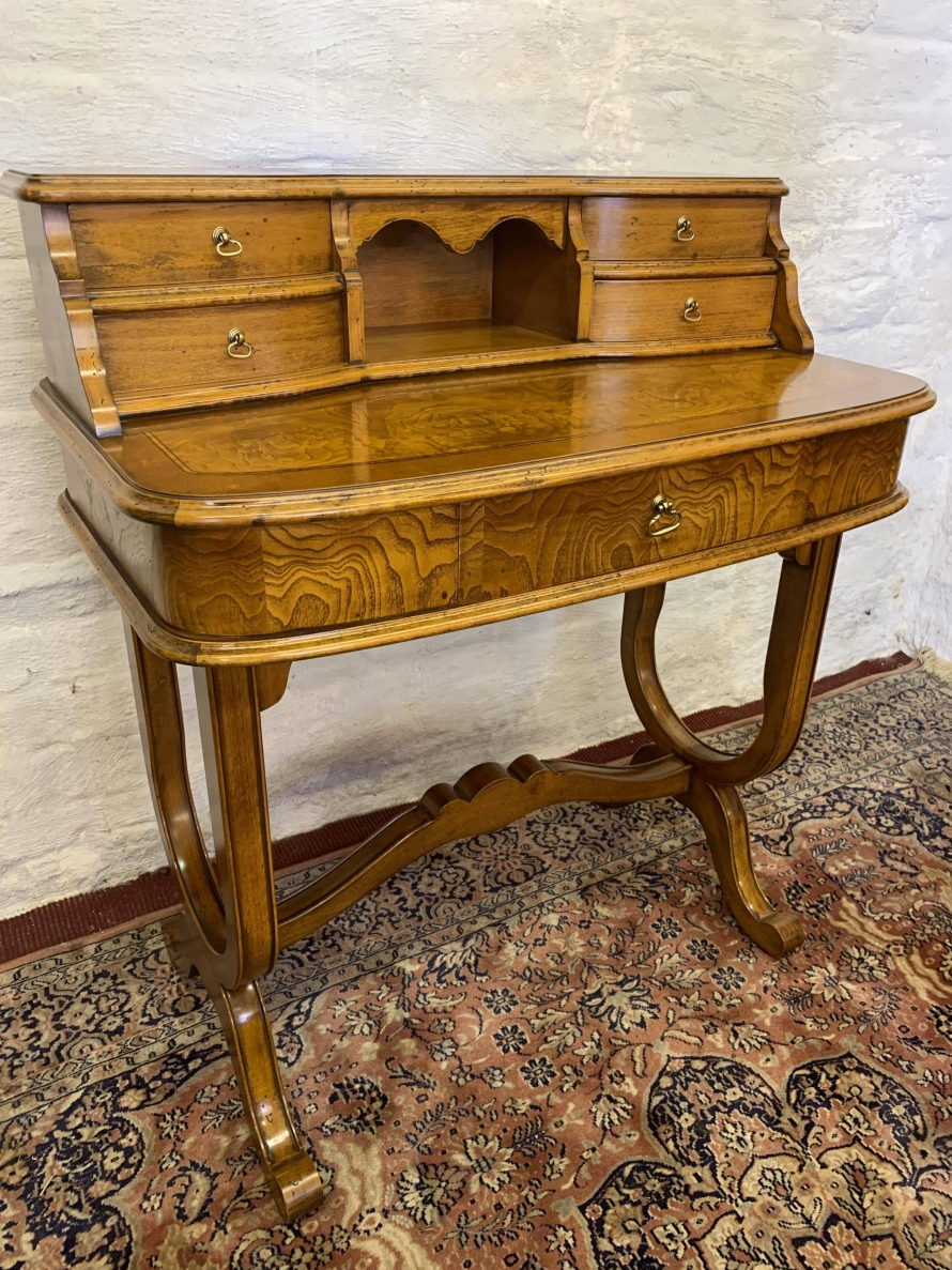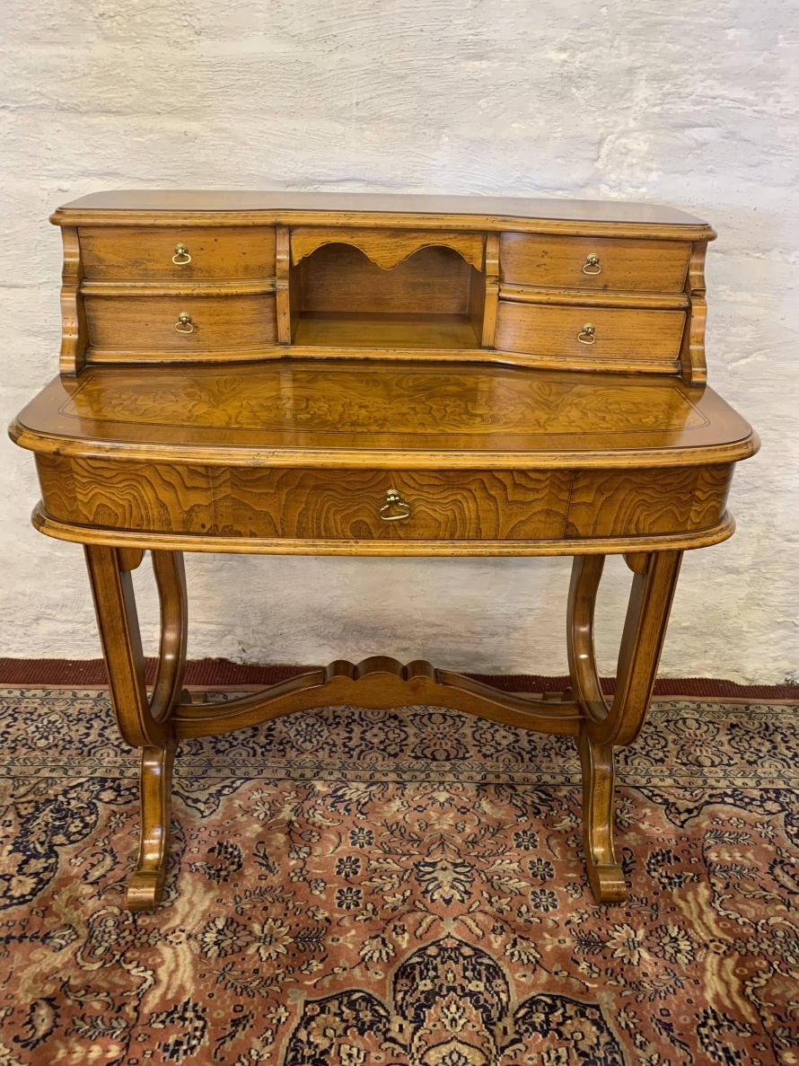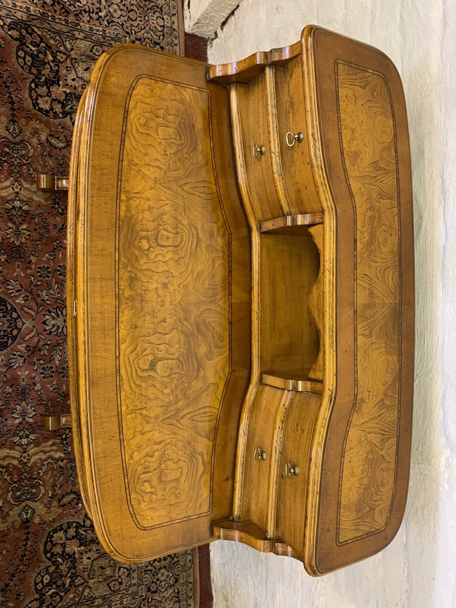 This fabulous ladies desk is in excellent condition. Having burr walnut decoration through out, the shaped top sits above an open section which is flanked by a pair of drawers, each drawer having a brass handle. Having a drawer to the front this fabulous desk stands on stylish shaped supports on four shaped legs.