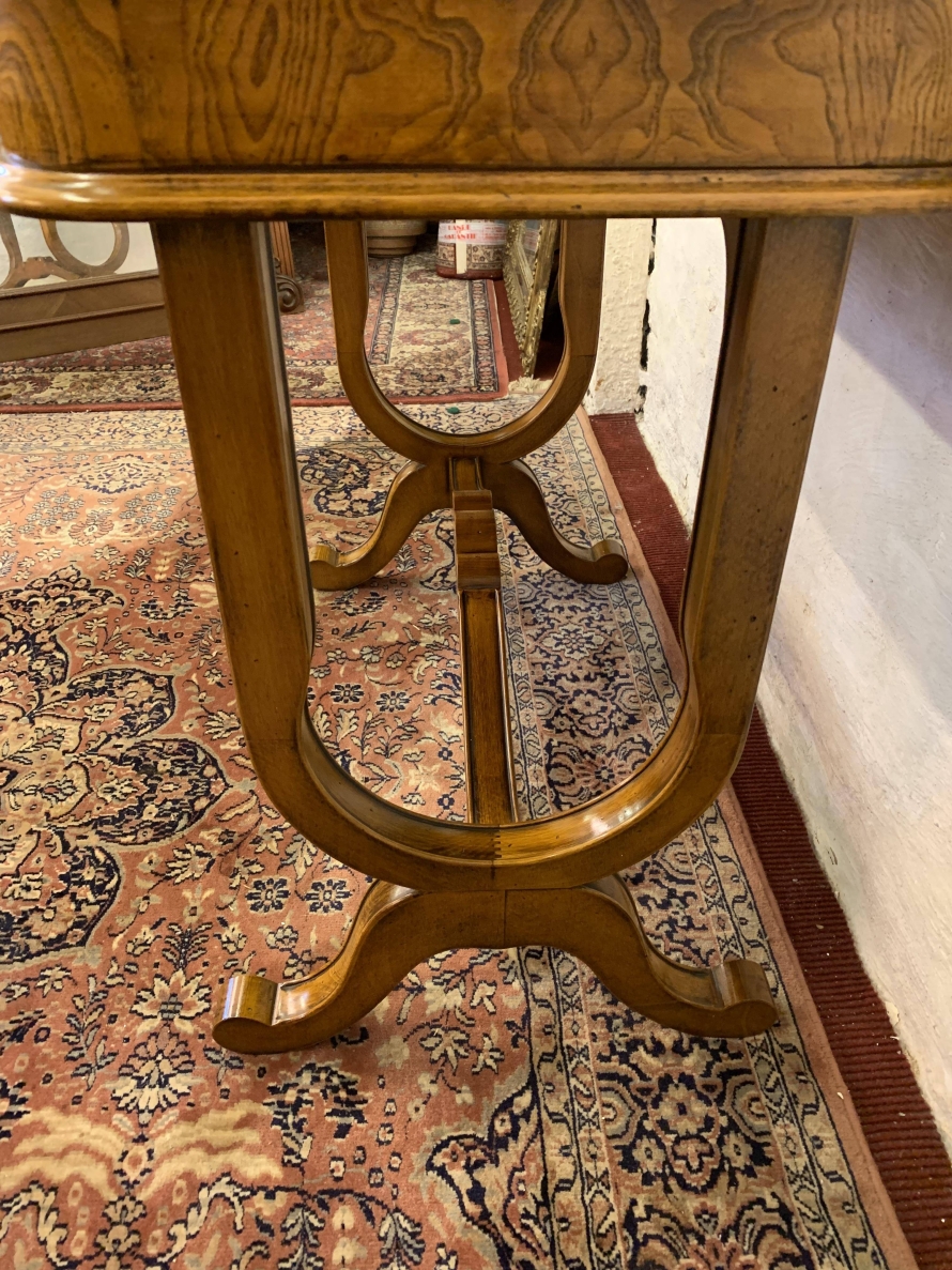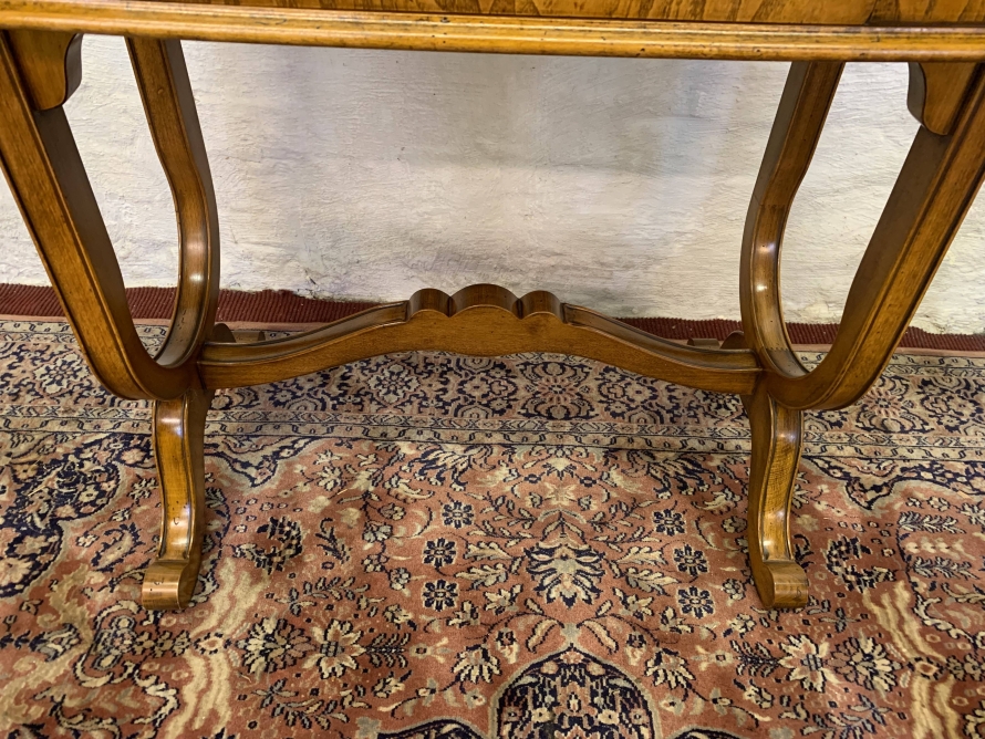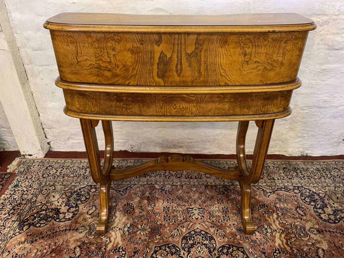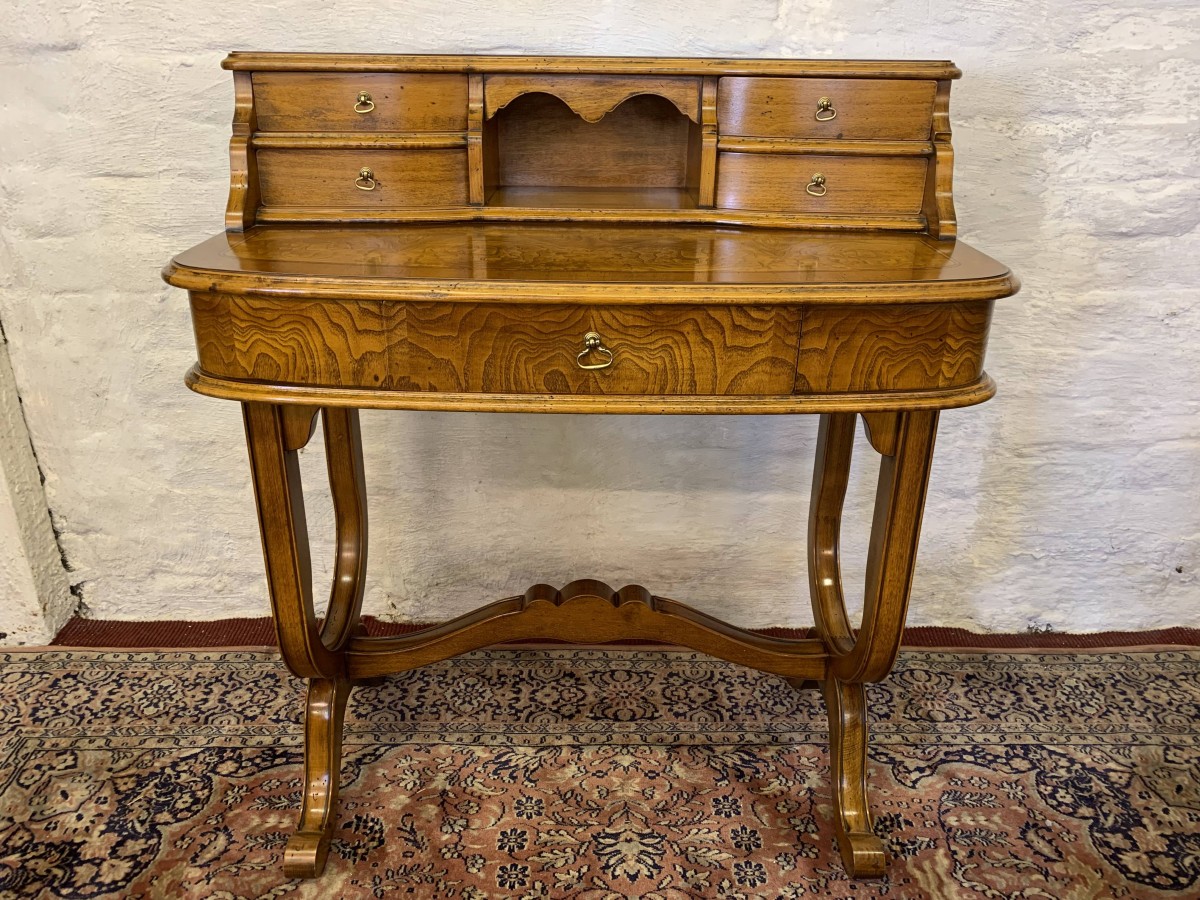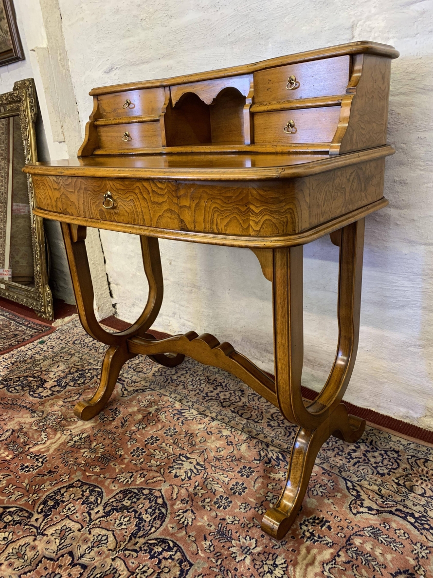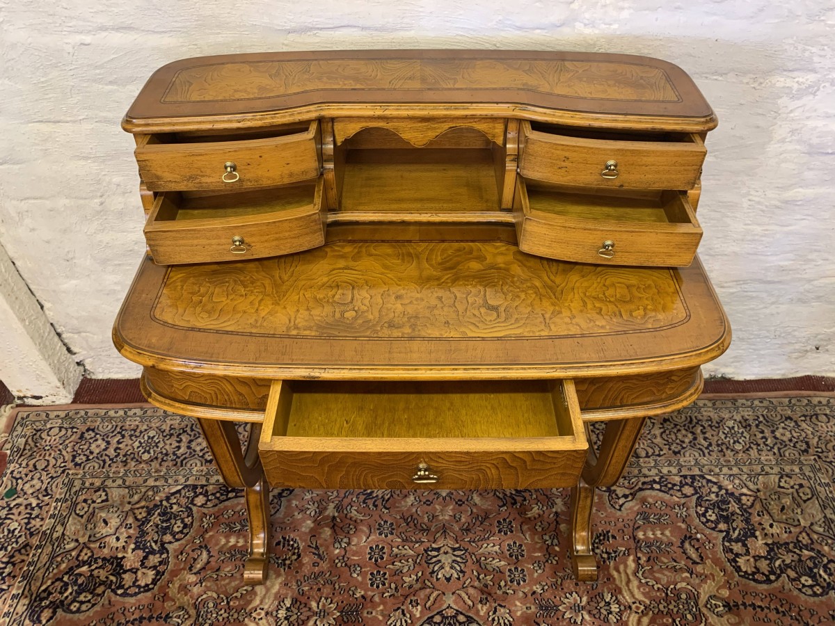 This fabulous ladies desk is in excellent condition. Having burr walnut decoration through out, the shaped top sits above an open section which is flanked by a pair of drawers, each drawer having a brass handle. Having a drawer to the front this fabulous desk stands on stylish shaped supports on four shaped legs.