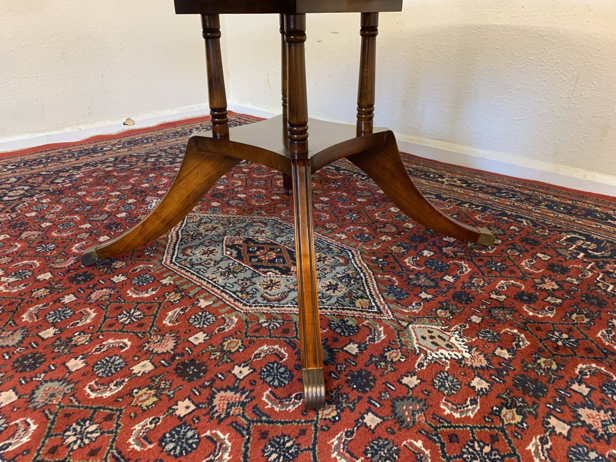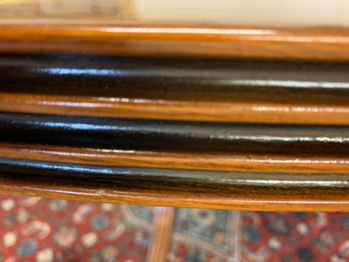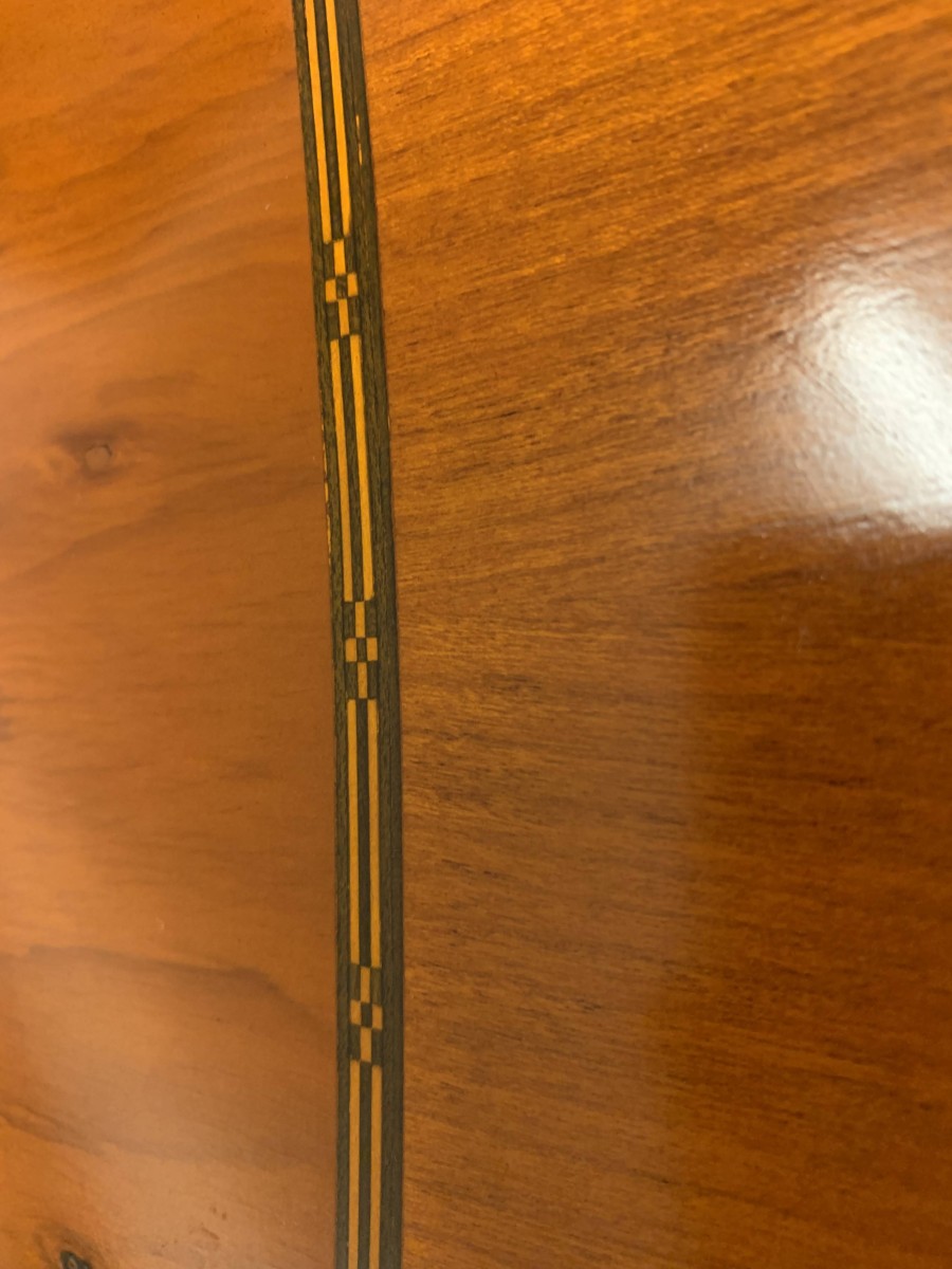 The segmented top gives a beautiful sunburst appearance and has inlaid border decoration.The base has four turned column supports and sits on four sweeping reeded legs with brass feet and brass castors.