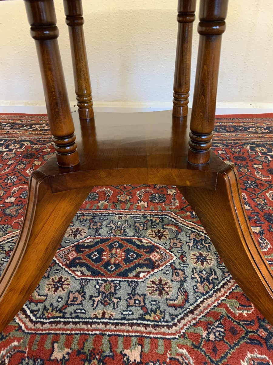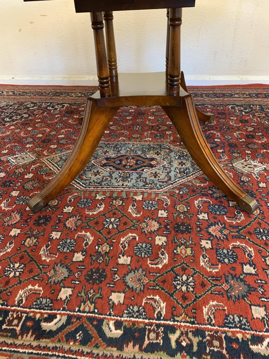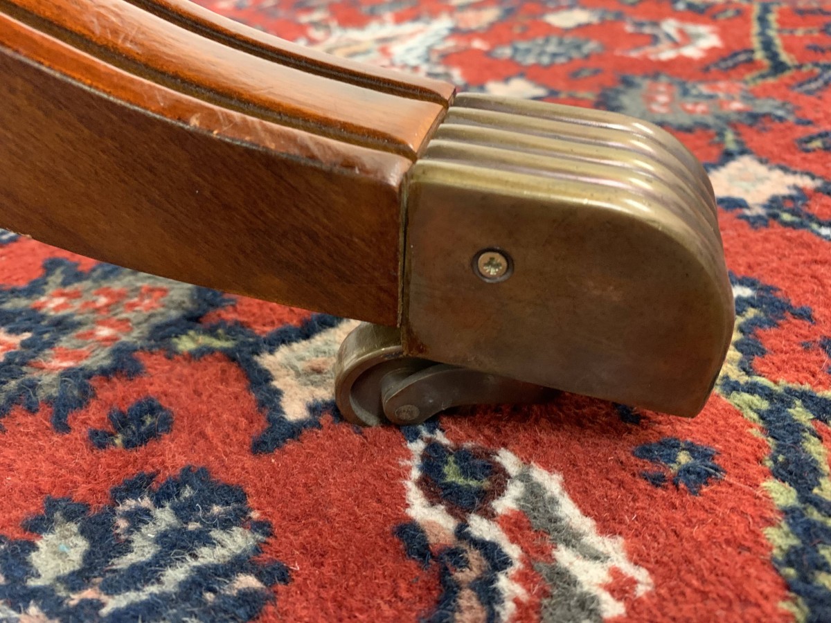 The segmented top gives a beautiful sunburst appearance and has inlaid border decoration.The base has four turned column supports and sits on four sweeping reeded legs with brass feet and brass castors.