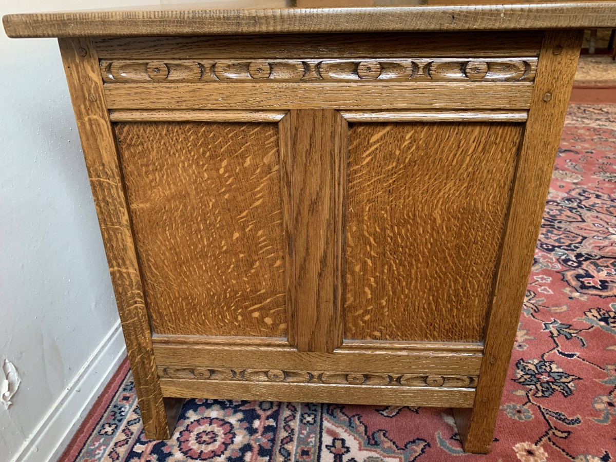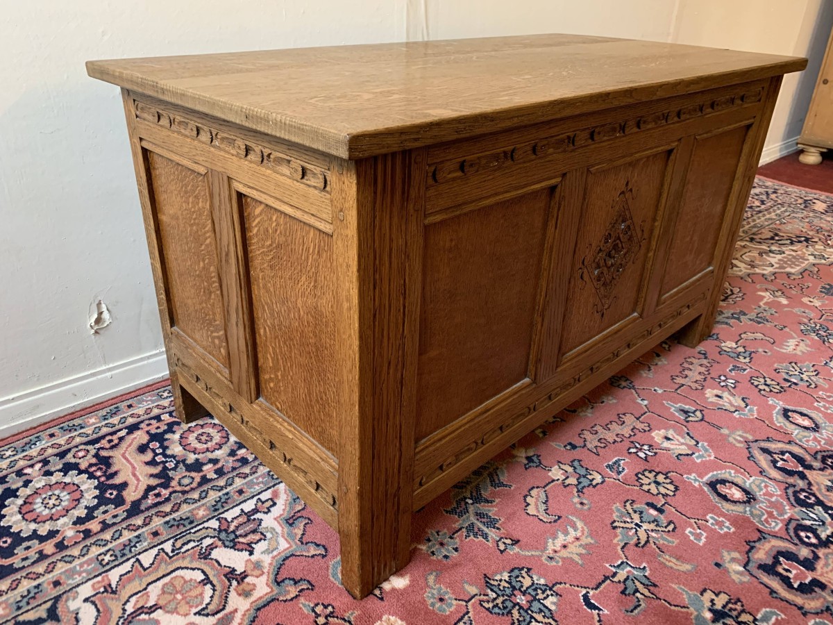 The lift up lid opens to reveal ample storage. The front has three recessed panels, the central panel having carved decoration. There is also carved decoration above and below the the panels. The recessed panelled sides also have carved decoration above and below. The item stands on four block feet.