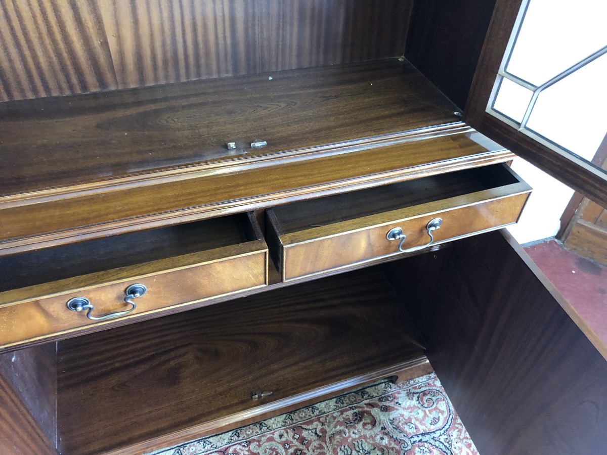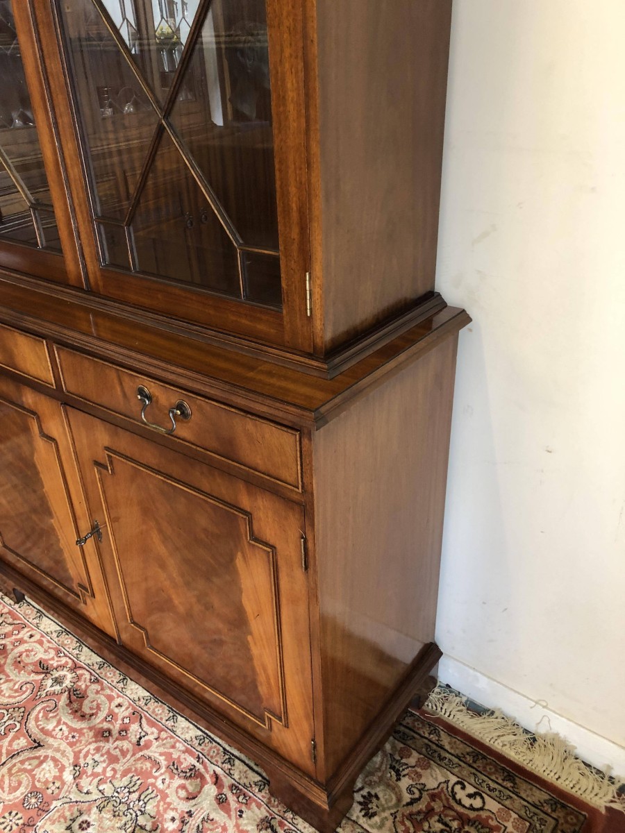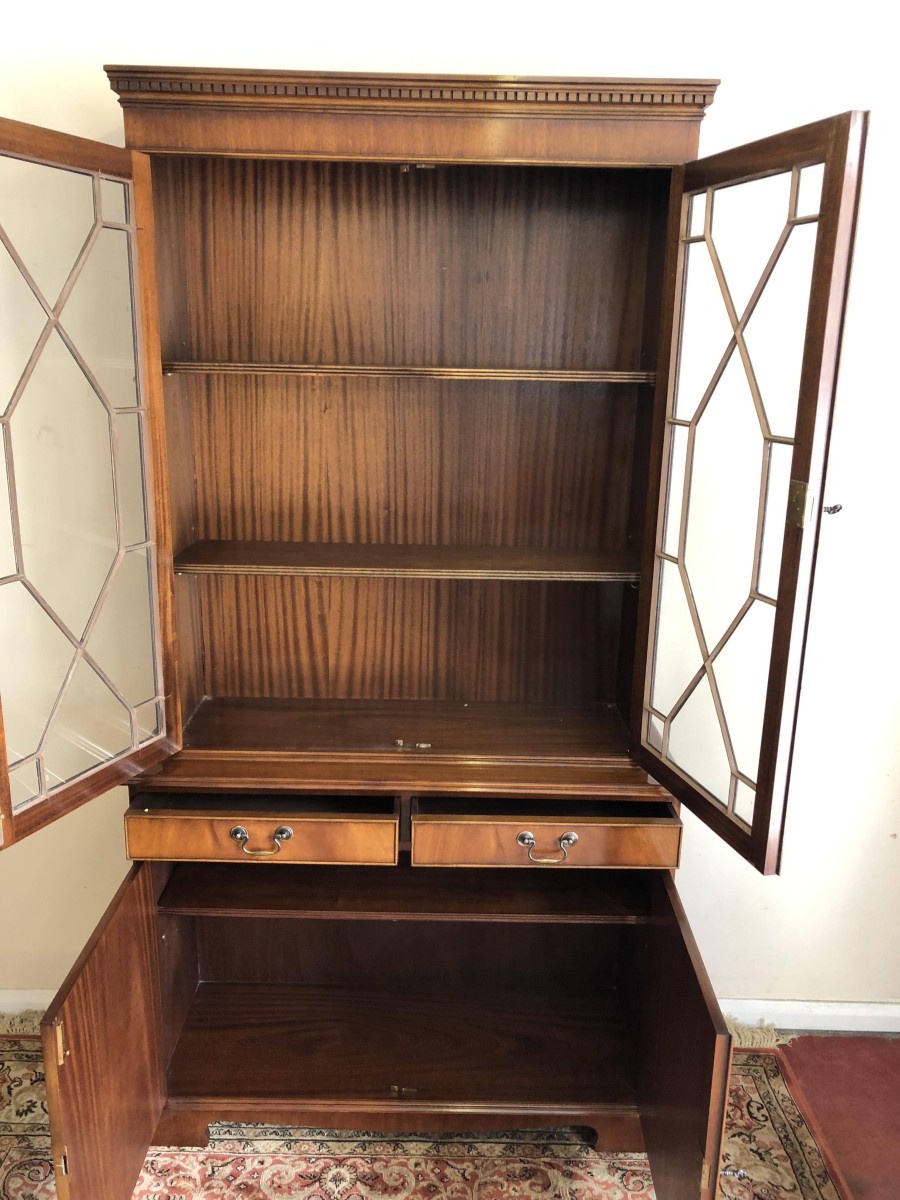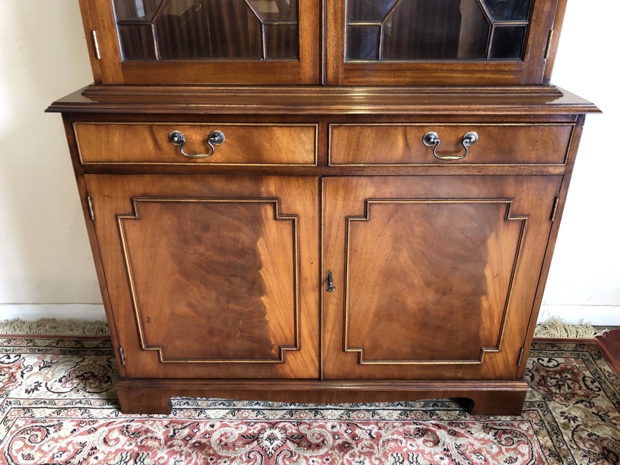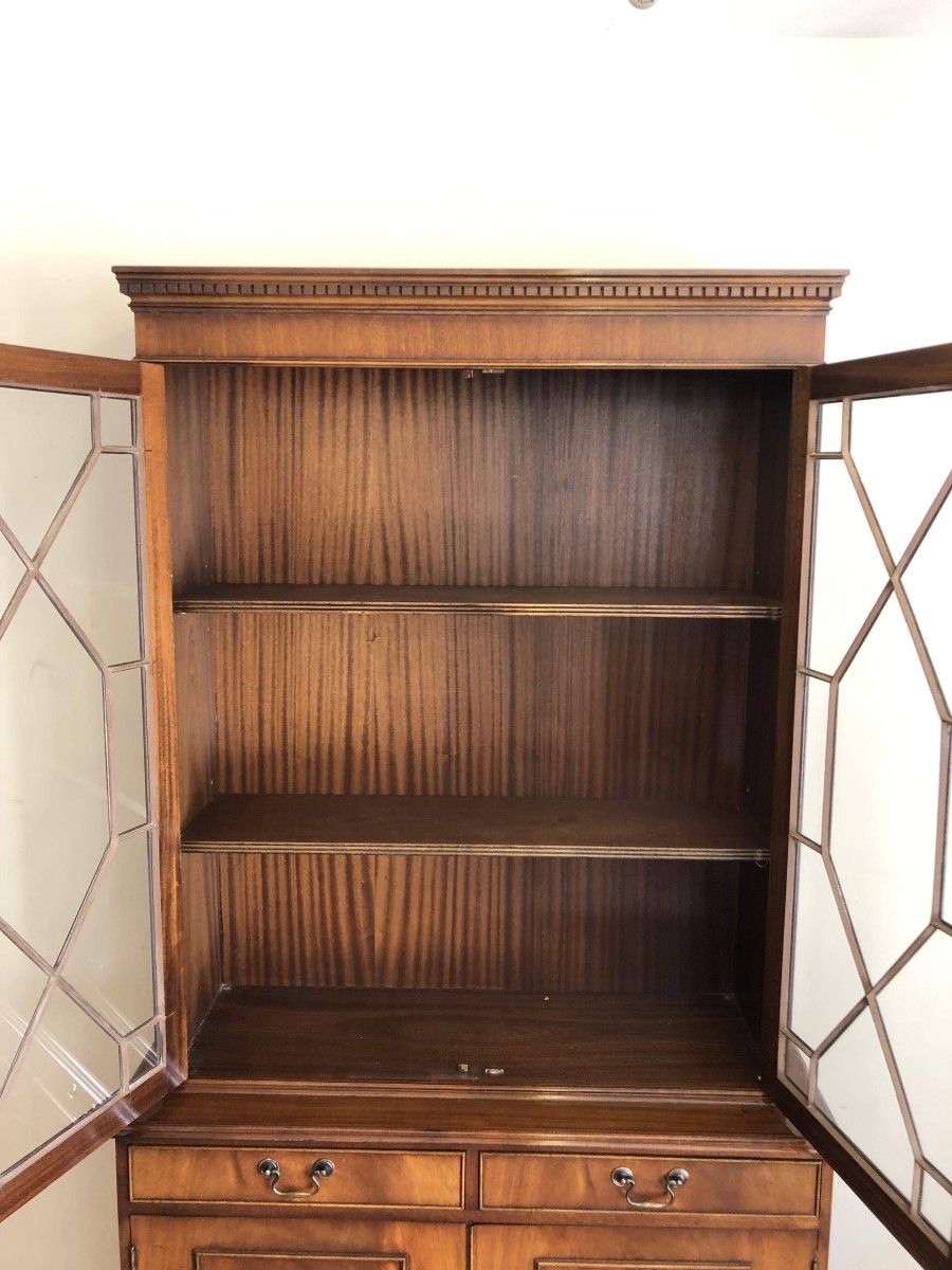 The bookcase top has a carved dental cornice, below are a pair of lockable astral glazed doors. The doors open to reveal to adjustable and removable shelves, below are a pair of drawers, each drawer having brass handle. Below the drawers are a pair of lockable cupboard doors the doors open to reveal an adjustable and removable shelf. This beautiful cabinet sits on bracket feet. Please note the patina of the mahogany is striking.