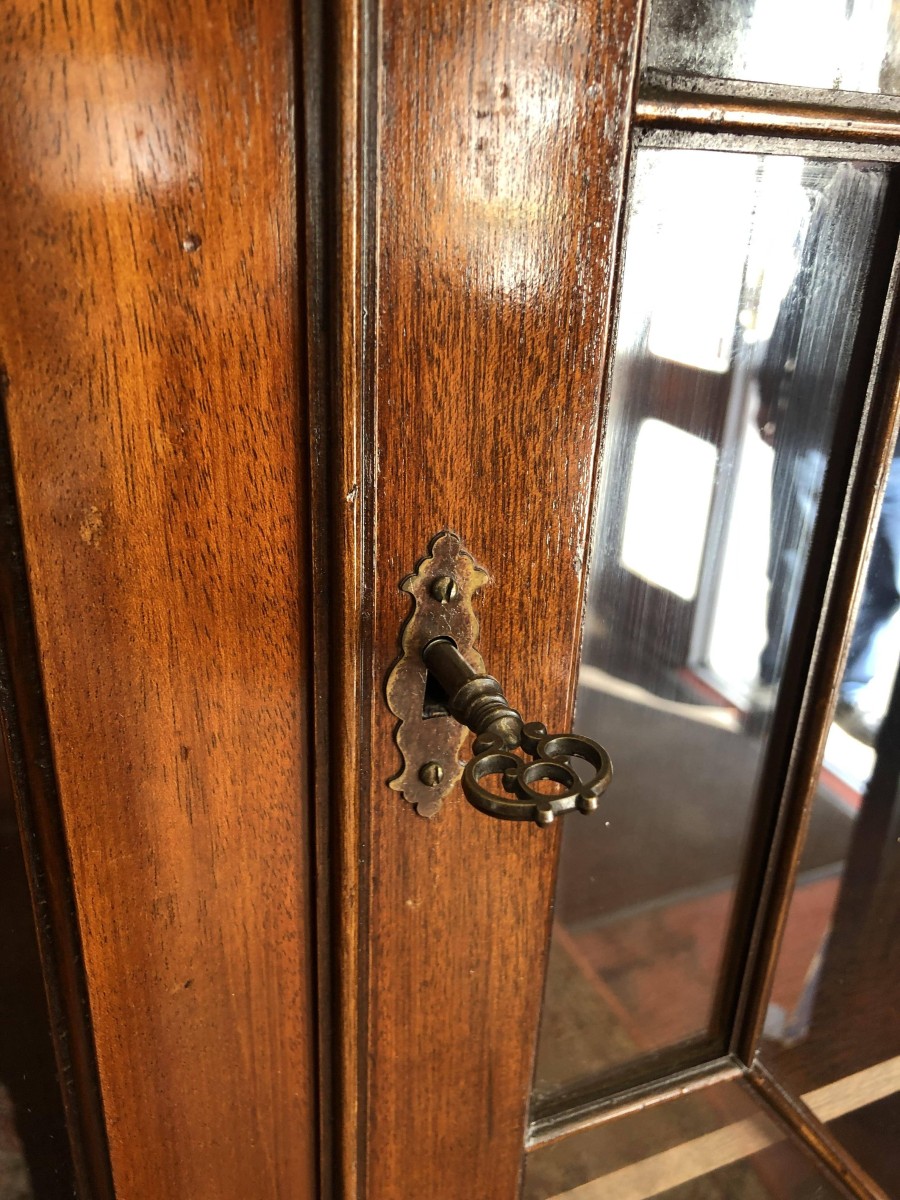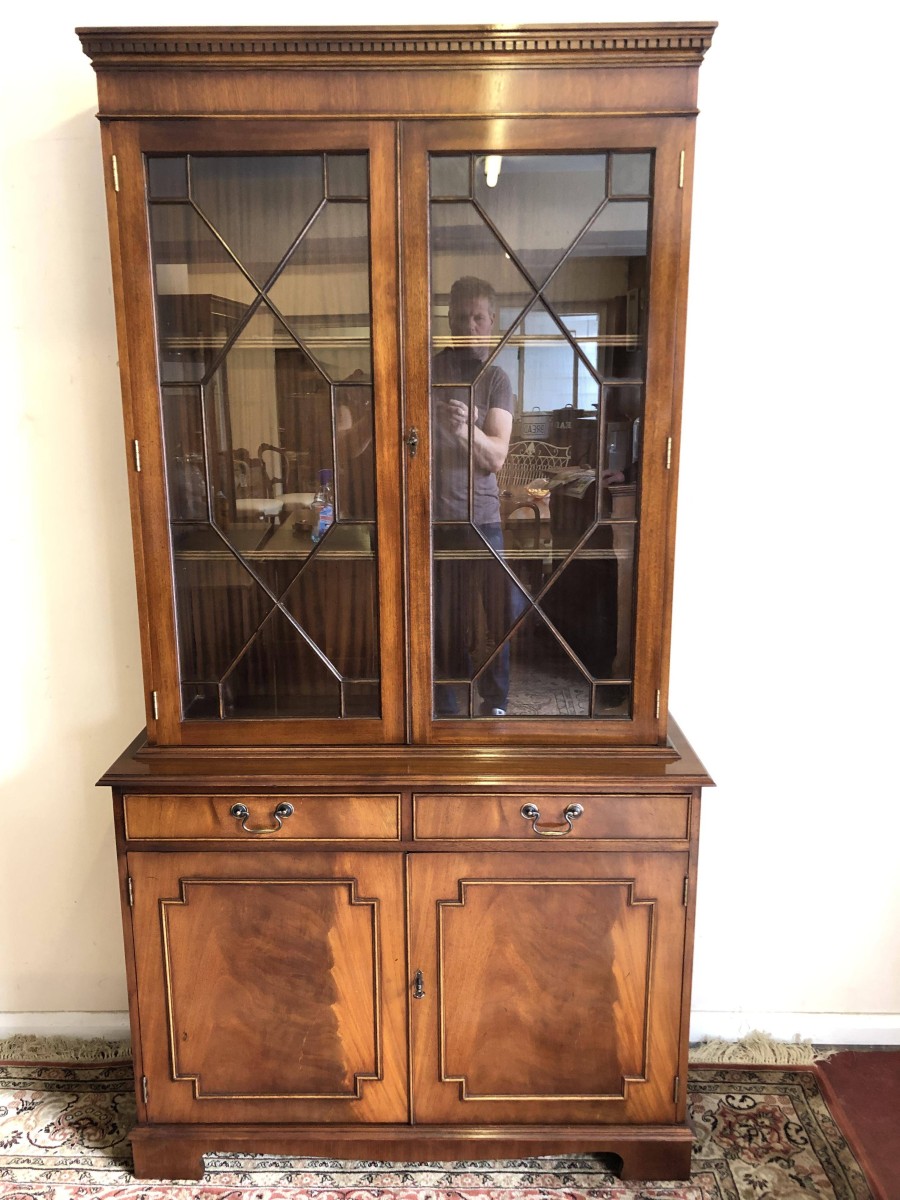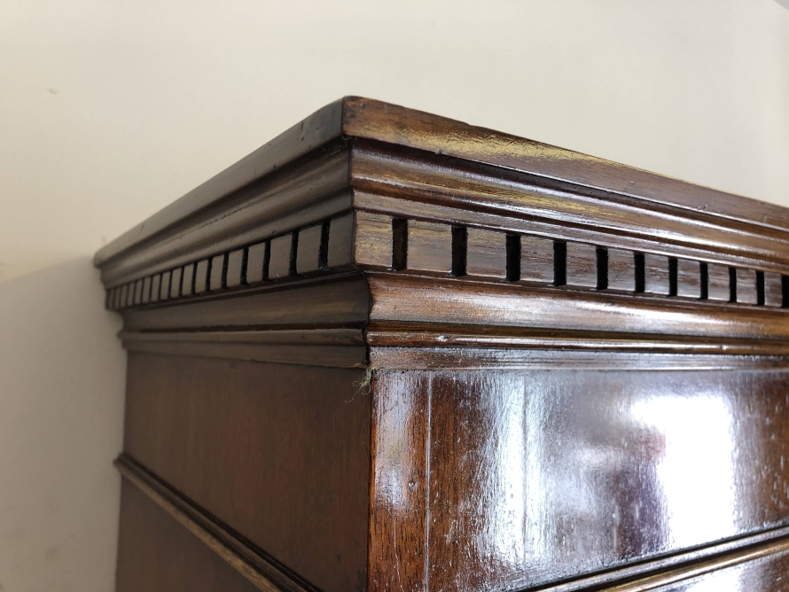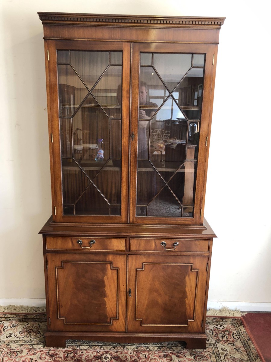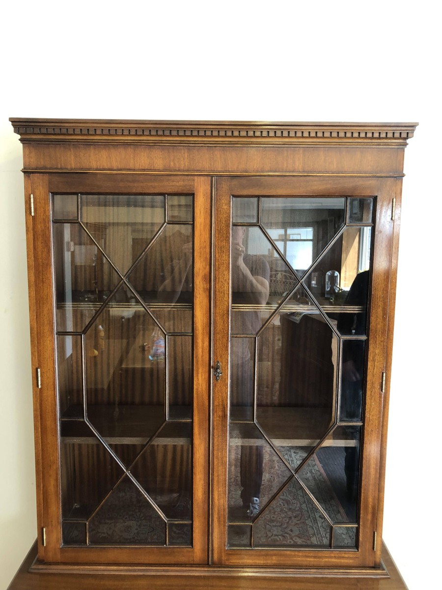 The bookcase top has a carved dental cornice, below are a pair of lockable astral glazed doors. The doors open to reveal to adjustable and removable shelves, below are a pair of drawers, each drawer having brass handle. Below the drawers are a pair of lockable cupboard doors the doors open to reveal an adjustable and removable shelf. This beautiful cabinet sits on bracket feet. Please note the patina of the mahogany is striking.