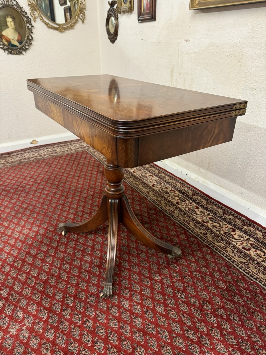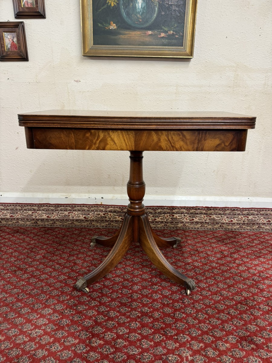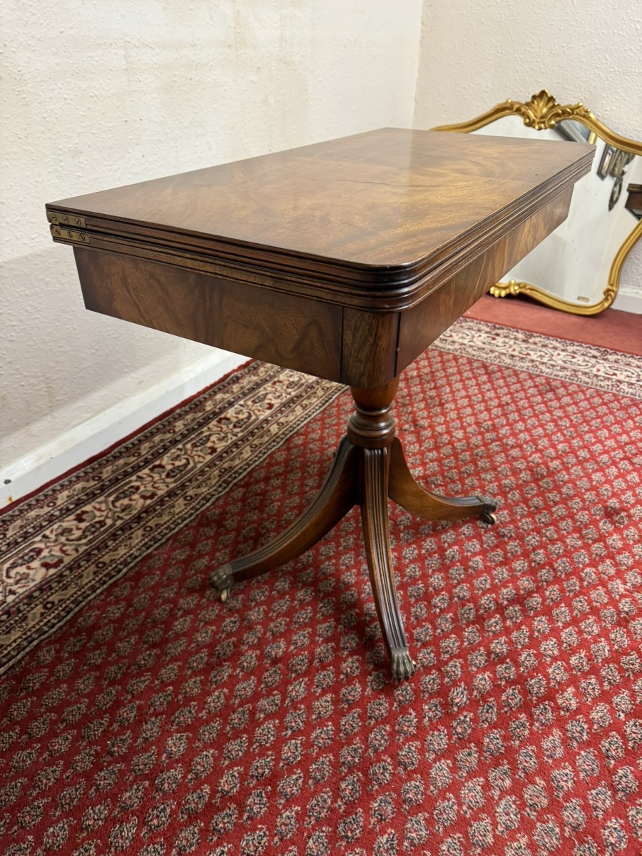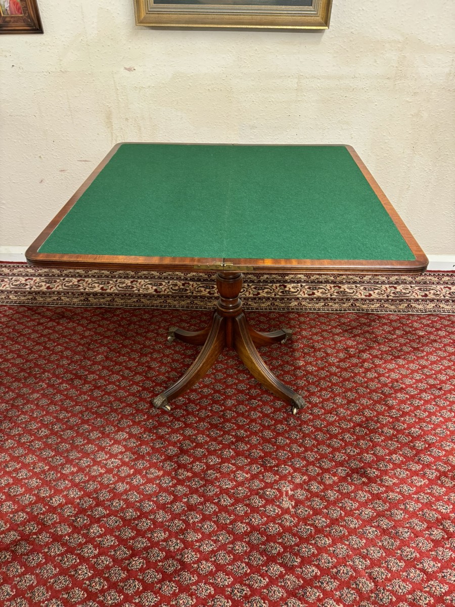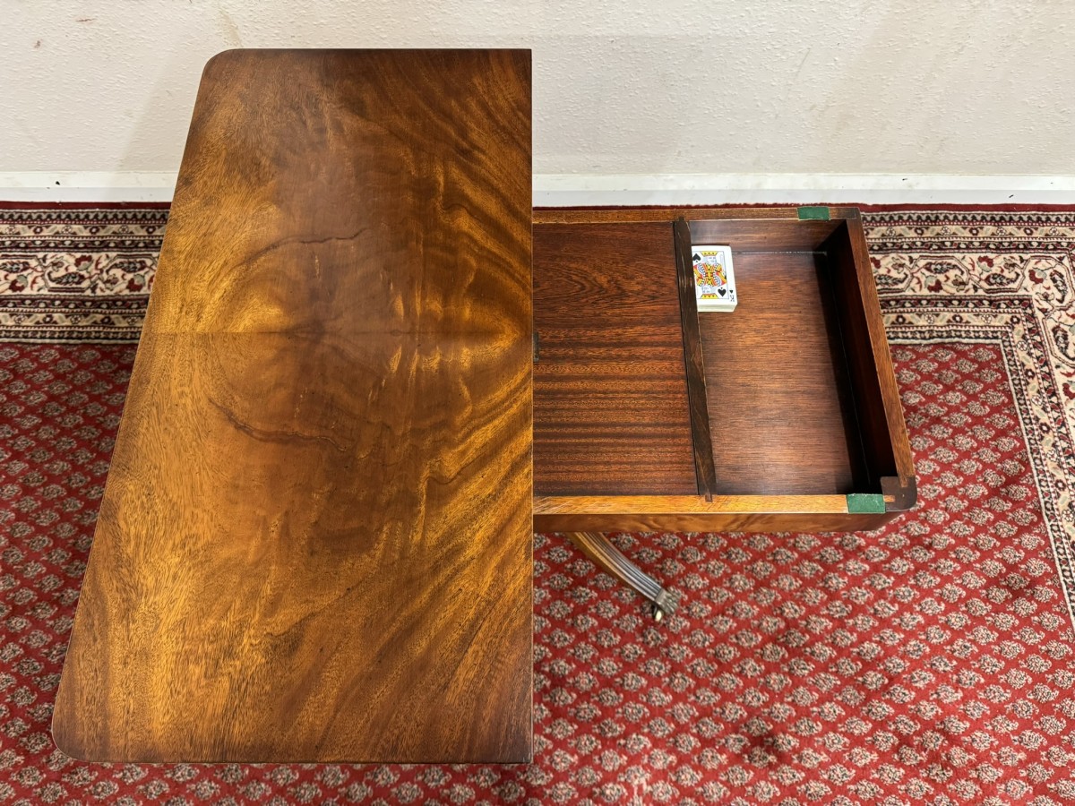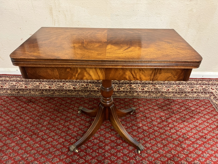 Made in striking flame mahogany and in excellent condition this fold-over games table was made by the renowned Bevan Funnell furniture makers. The top folds over to produce a green baize playing surface. There is a storage compartment to one side. Sitting on a turned pedestal with four out swept feet with brass capped ends and sitting on four brass casters.