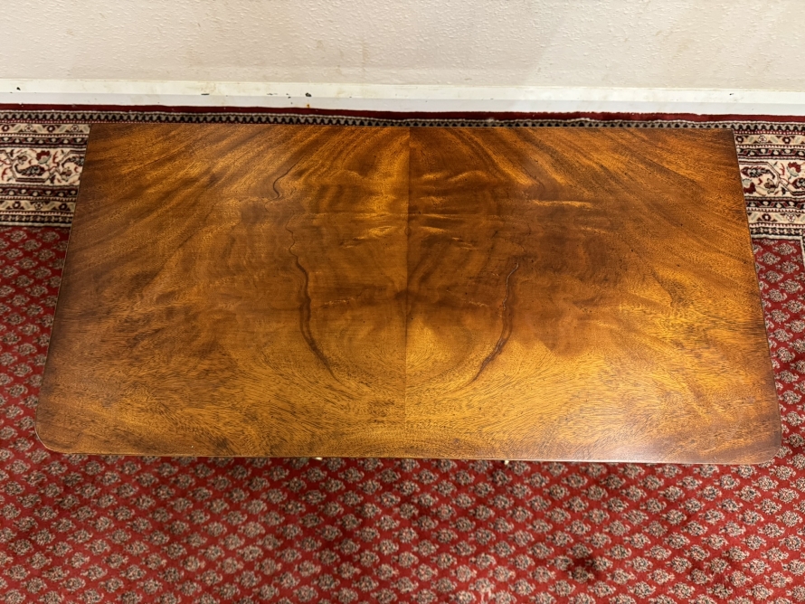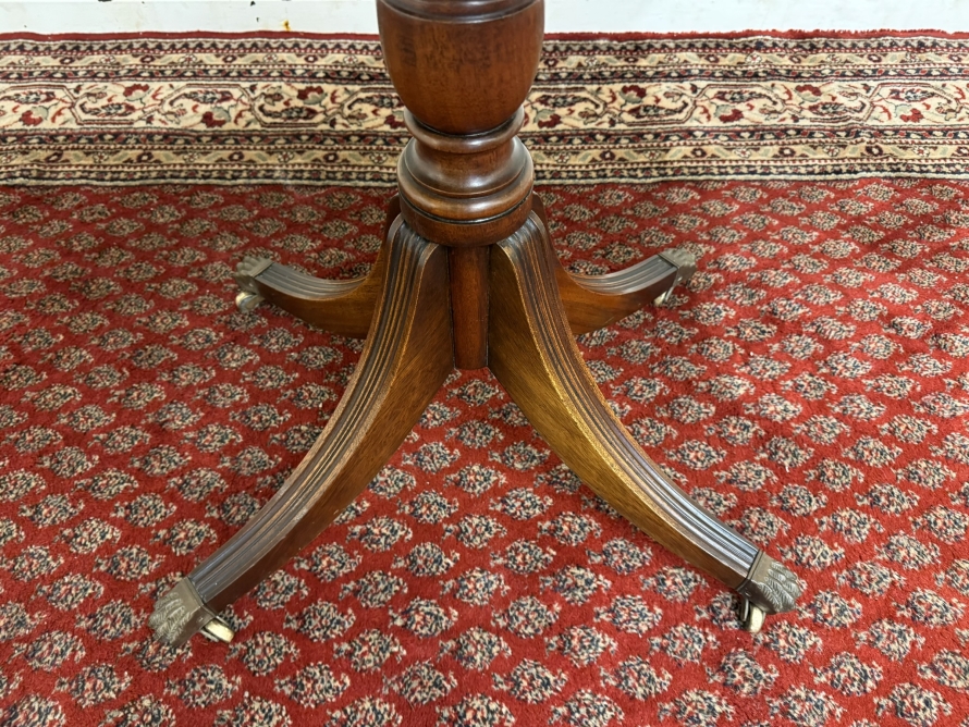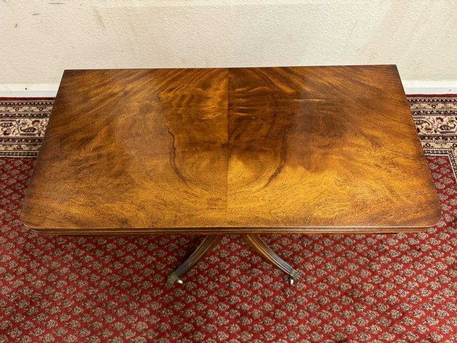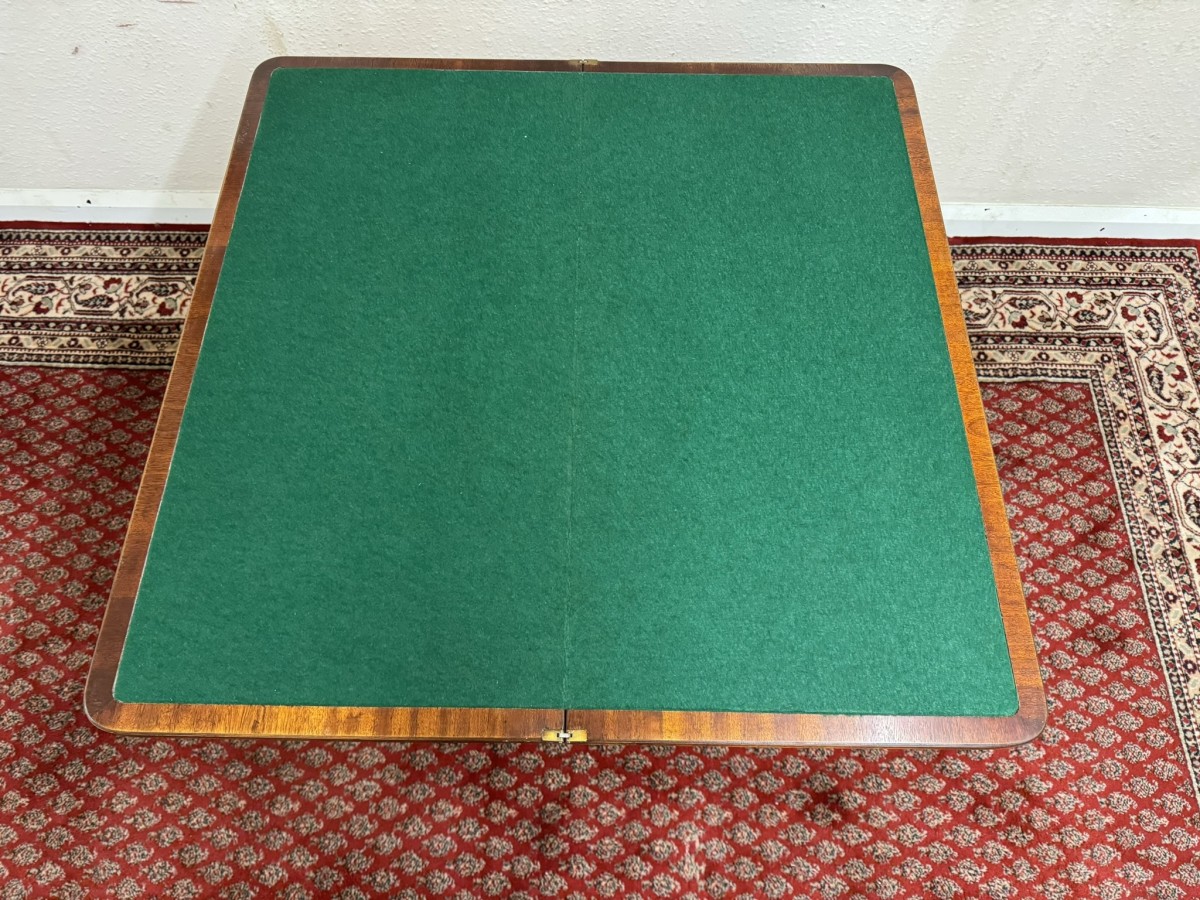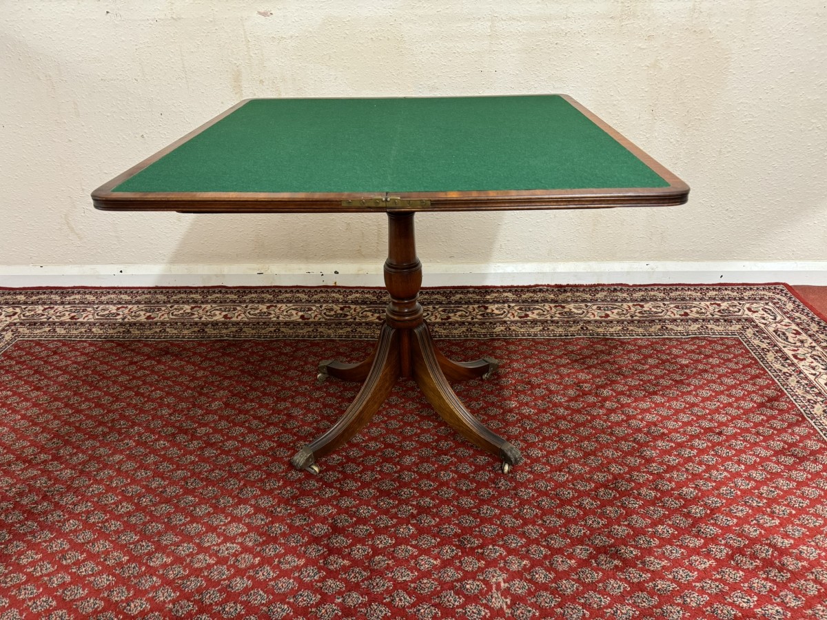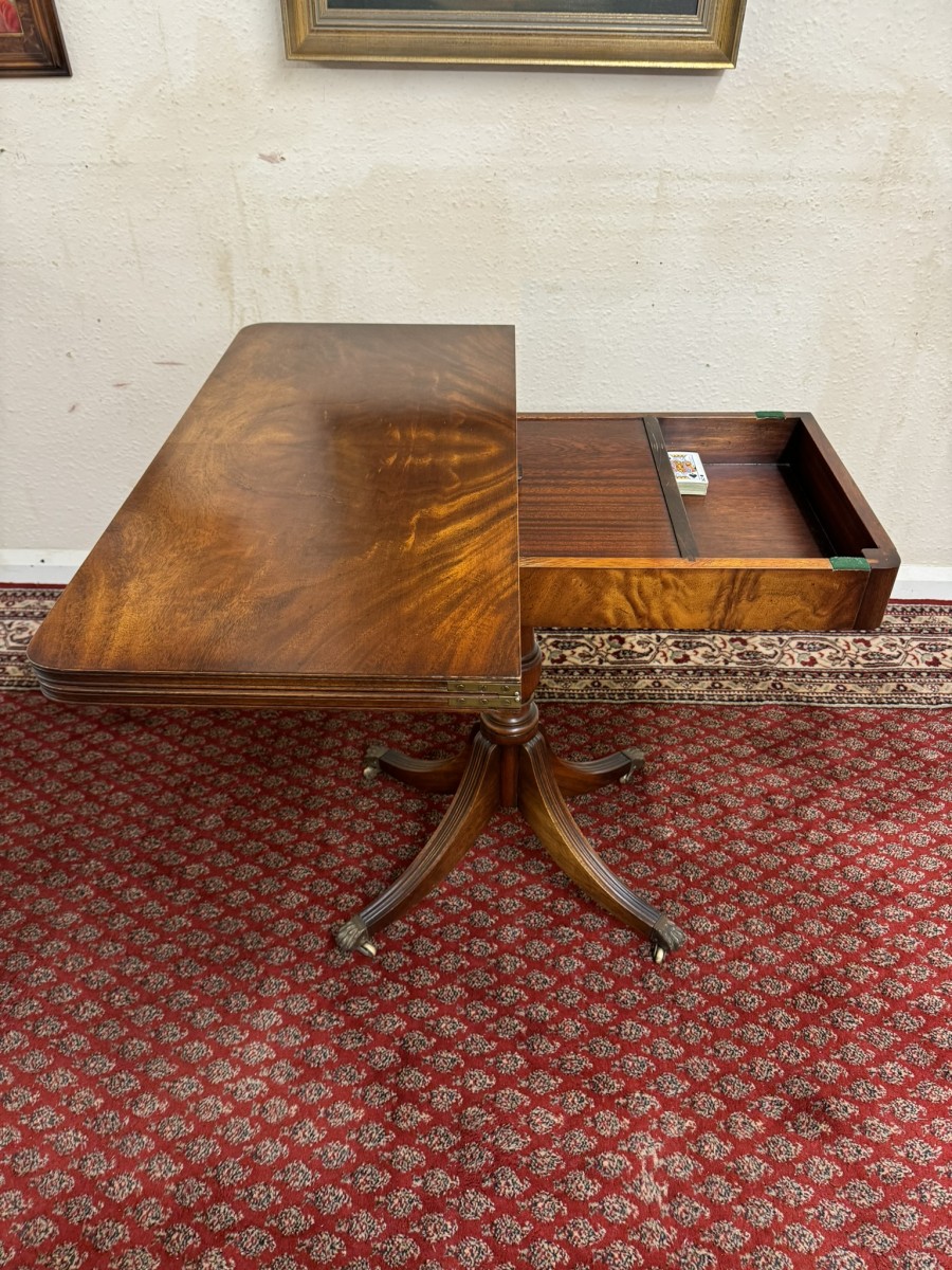 Made in striking flame mahogany and in excellent condition this fold-over games table was made by the renowned Bevan Funnell furniture makers. The top folds over to produce a green baize playing surface. There is a storage compartment to one side. Sitting on a turned pedestal with four out swept feet with brass capped ends and sitting on four brass casters.
