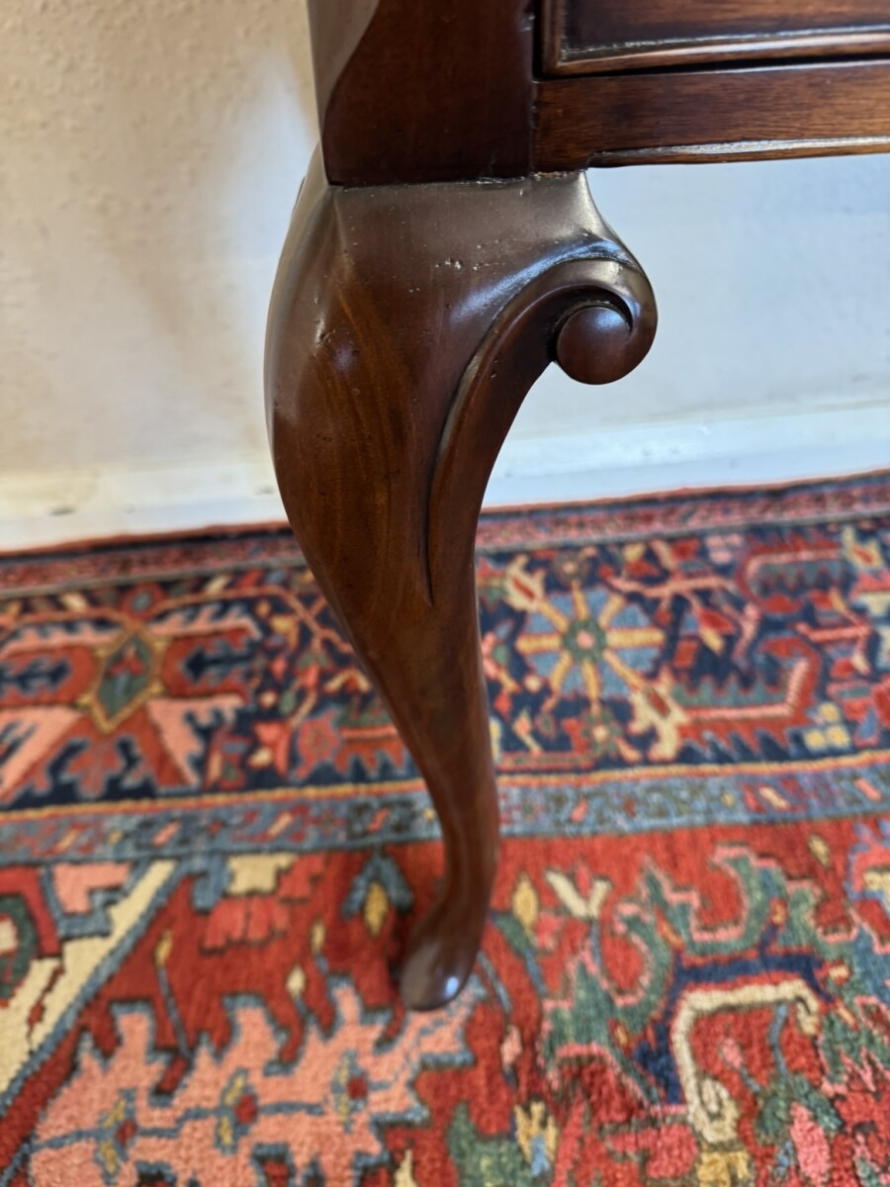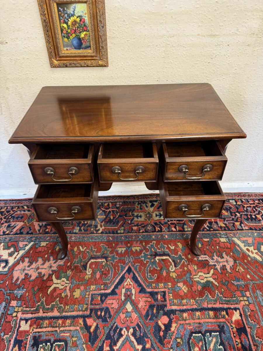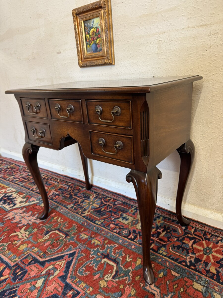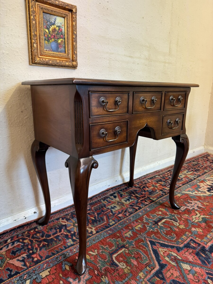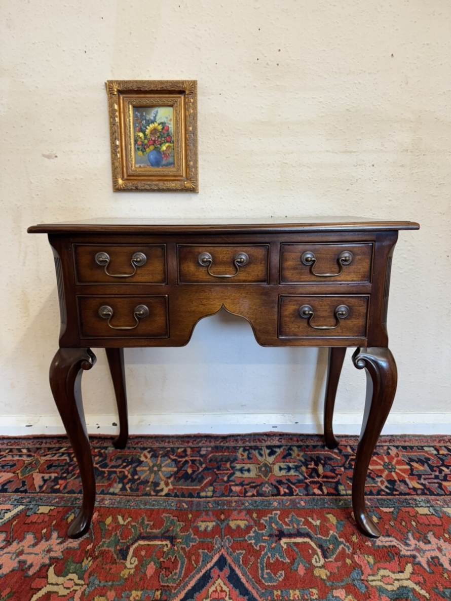 This great lowboy is made in striking mahogany. The oversailing top sits above a central drawer which is flanked by two pairs of drawers, each drawer having a brass drop handle. Carved decoration to the edges and standing on four cabriole shaped legs.