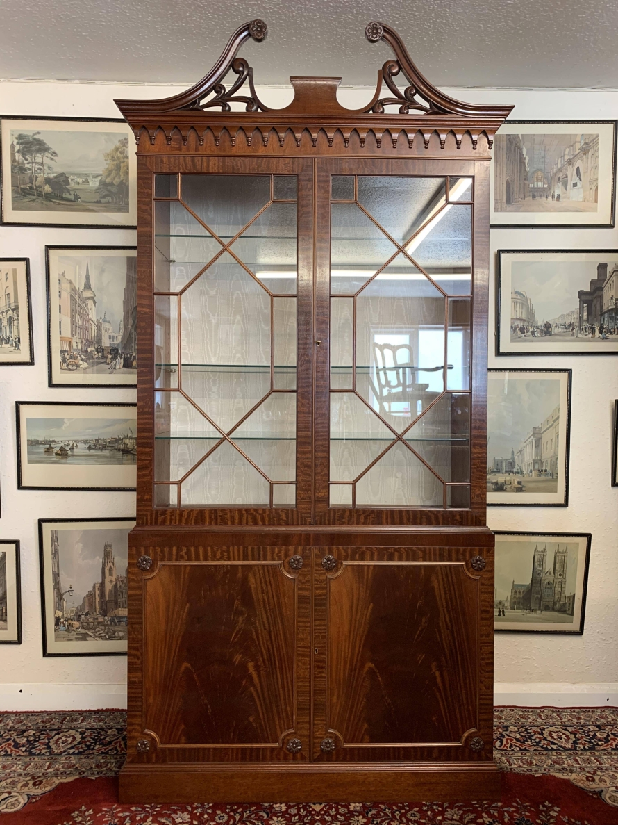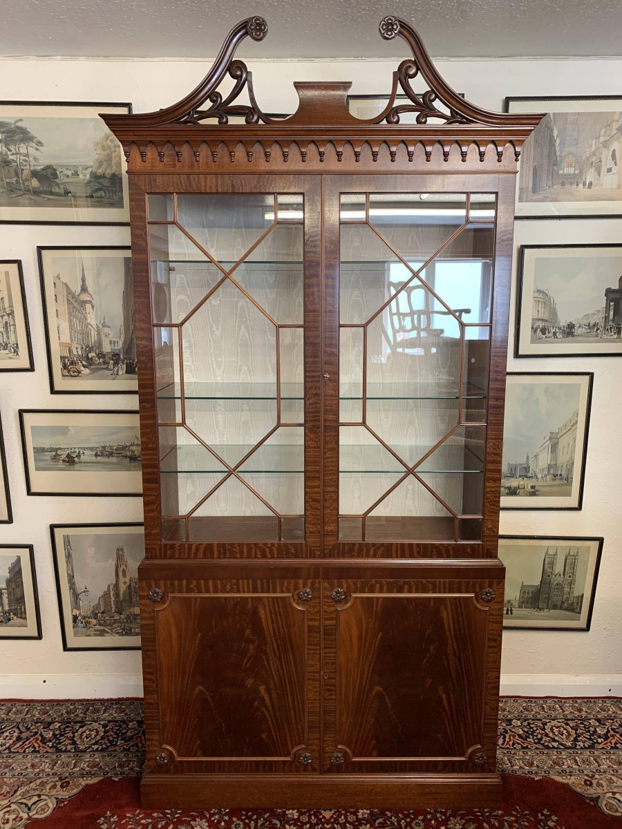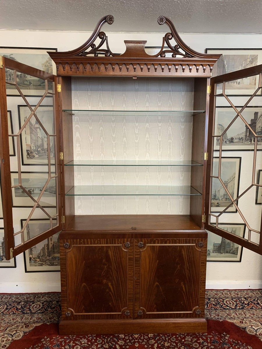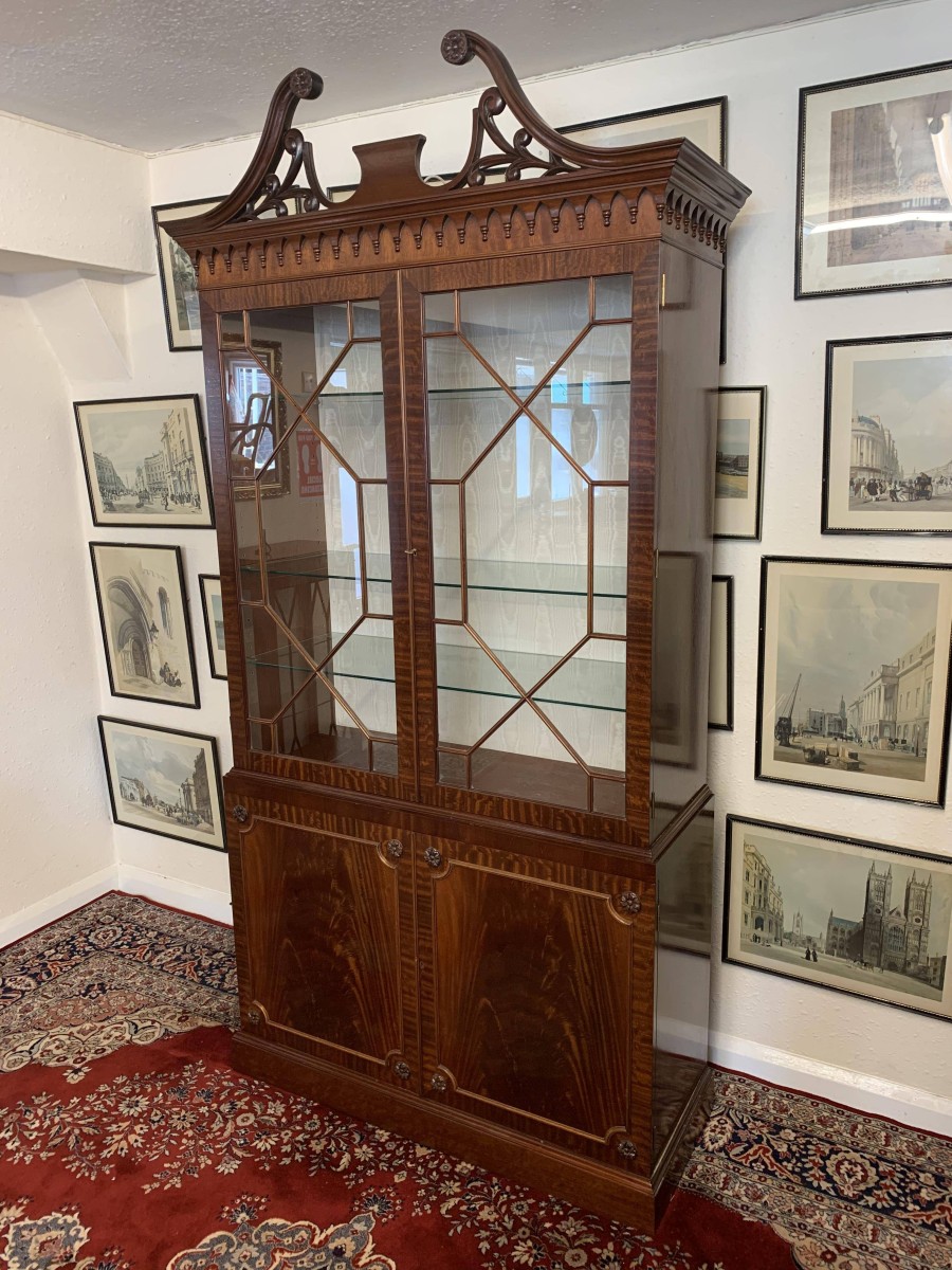 A truly wonderful cabinet which is in excellent condition. The swan neck top is striking and sits above a pair of astral glazed lockable doors. The doors open to reveal three glass adjustable and removable shelves.