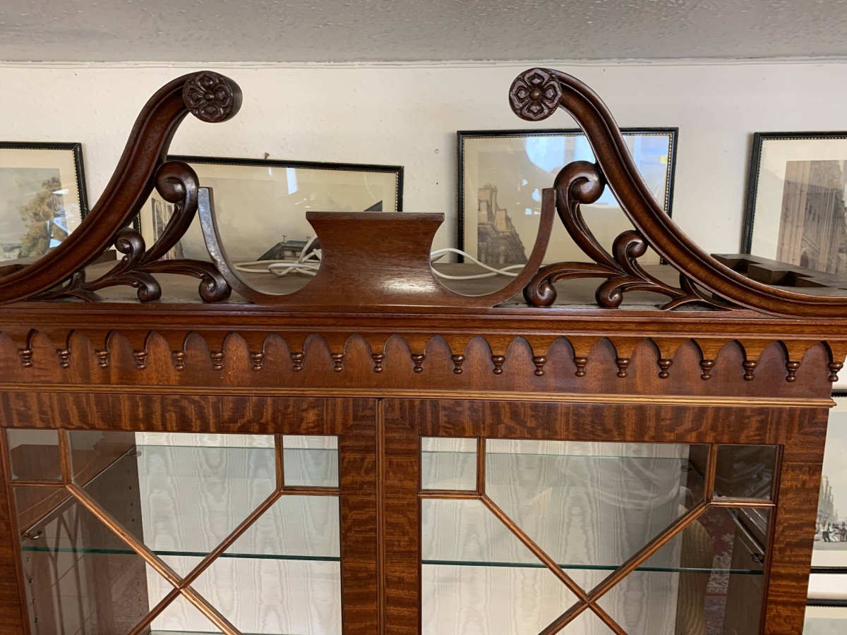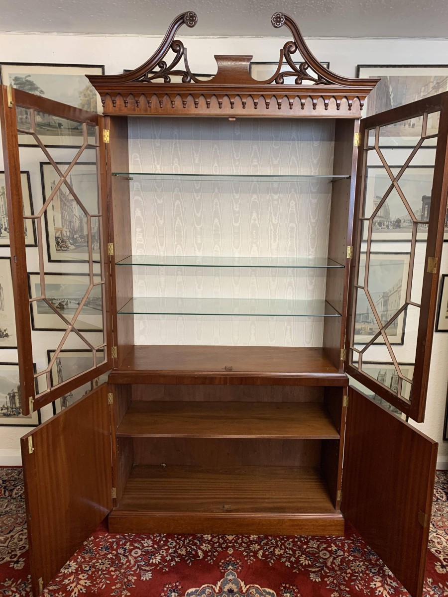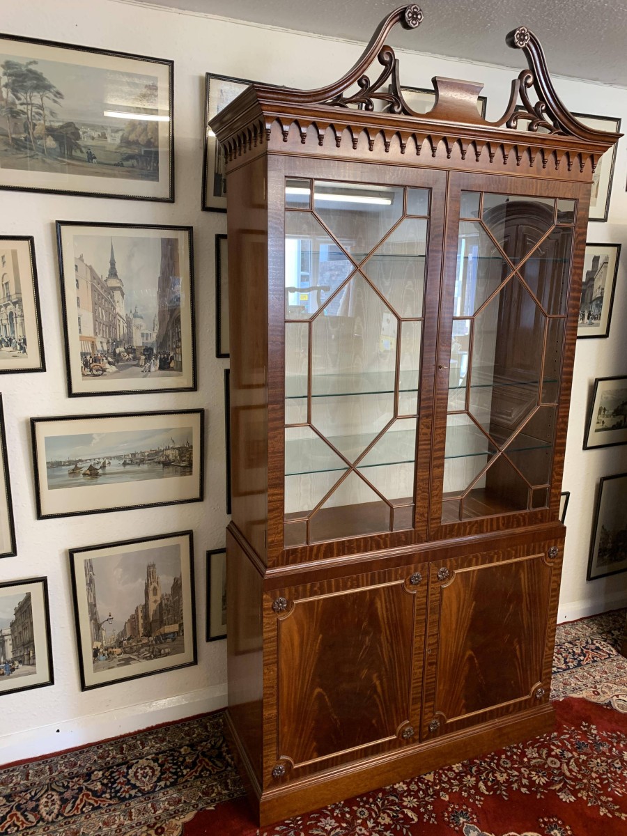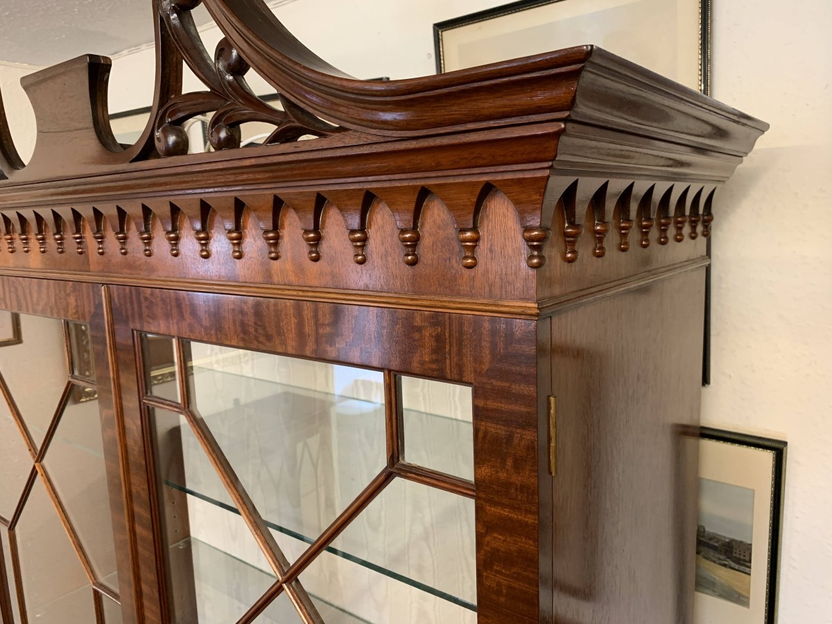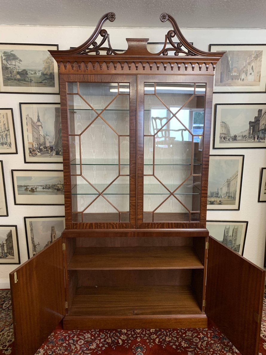 A truly wonderful cabinet which is in excellent condition. The swan neck top is striking and sits above a pair of astral glazed lockable doors. The doors open to reveal three glass adjustable and removable shelves.