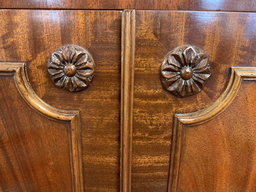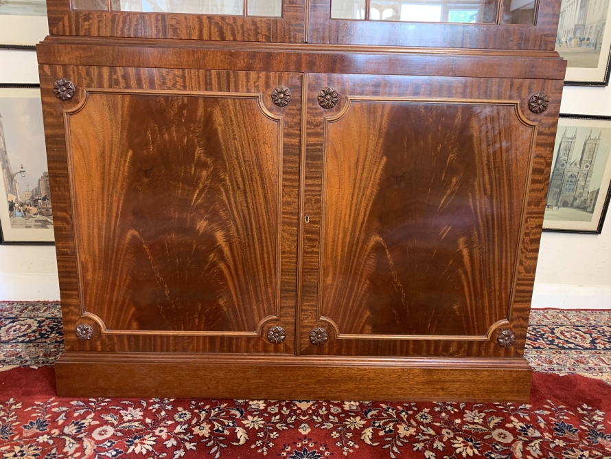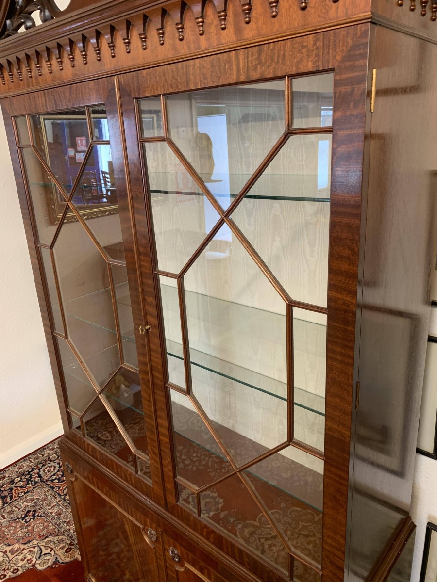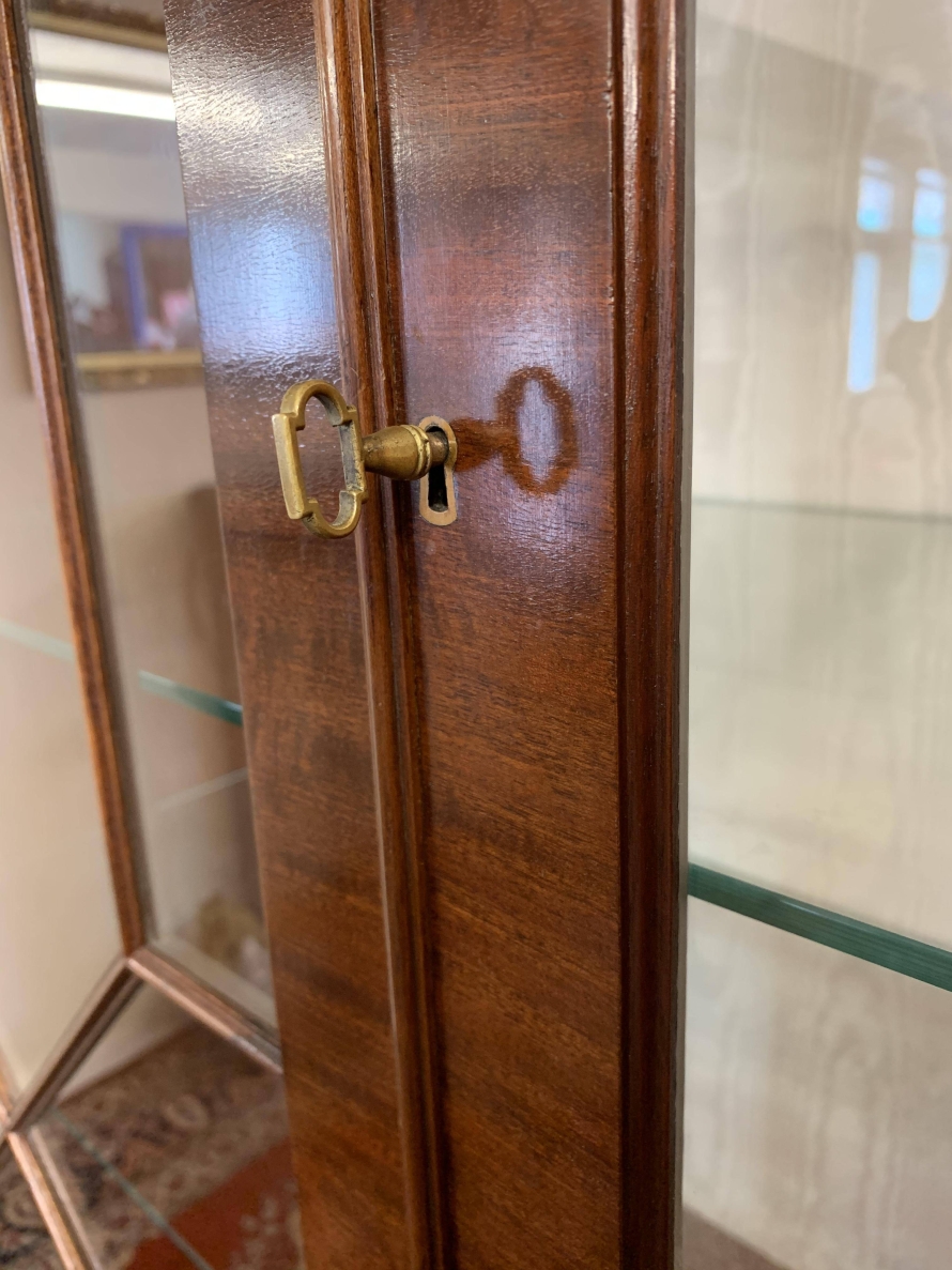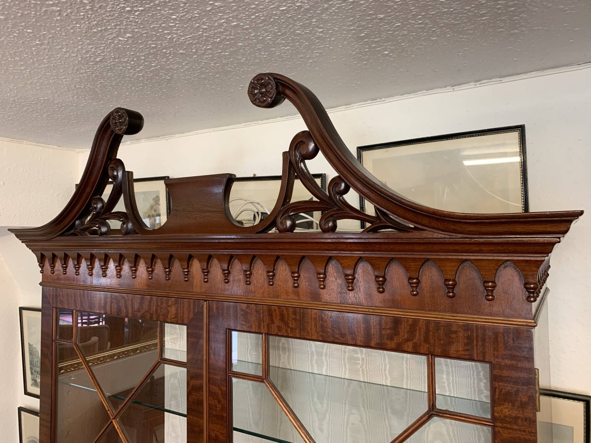 A truly wonderful cabinet which is in excellent condition. The swan neck top is striking and sits above a pair of astral glazed lockable doors. The doors open to reveal three glass adjustable and removable shelves.