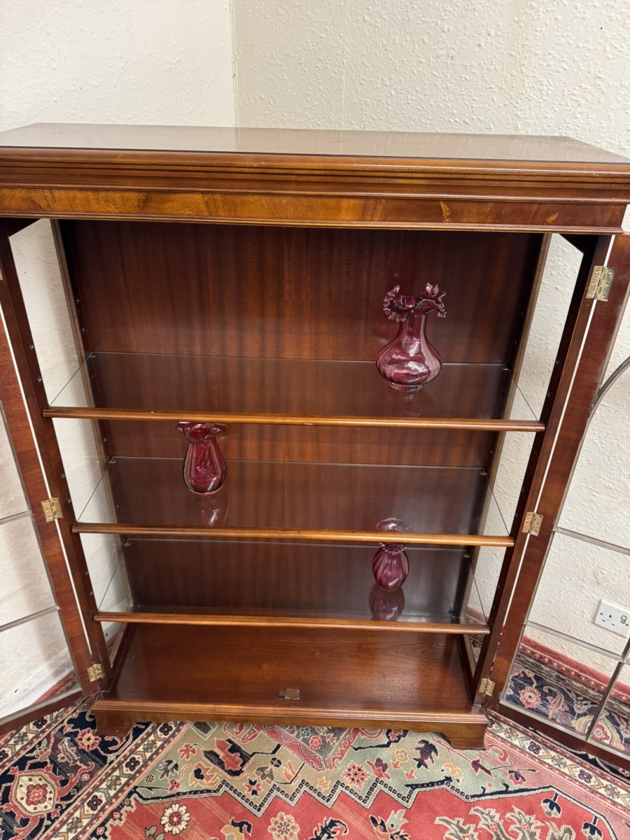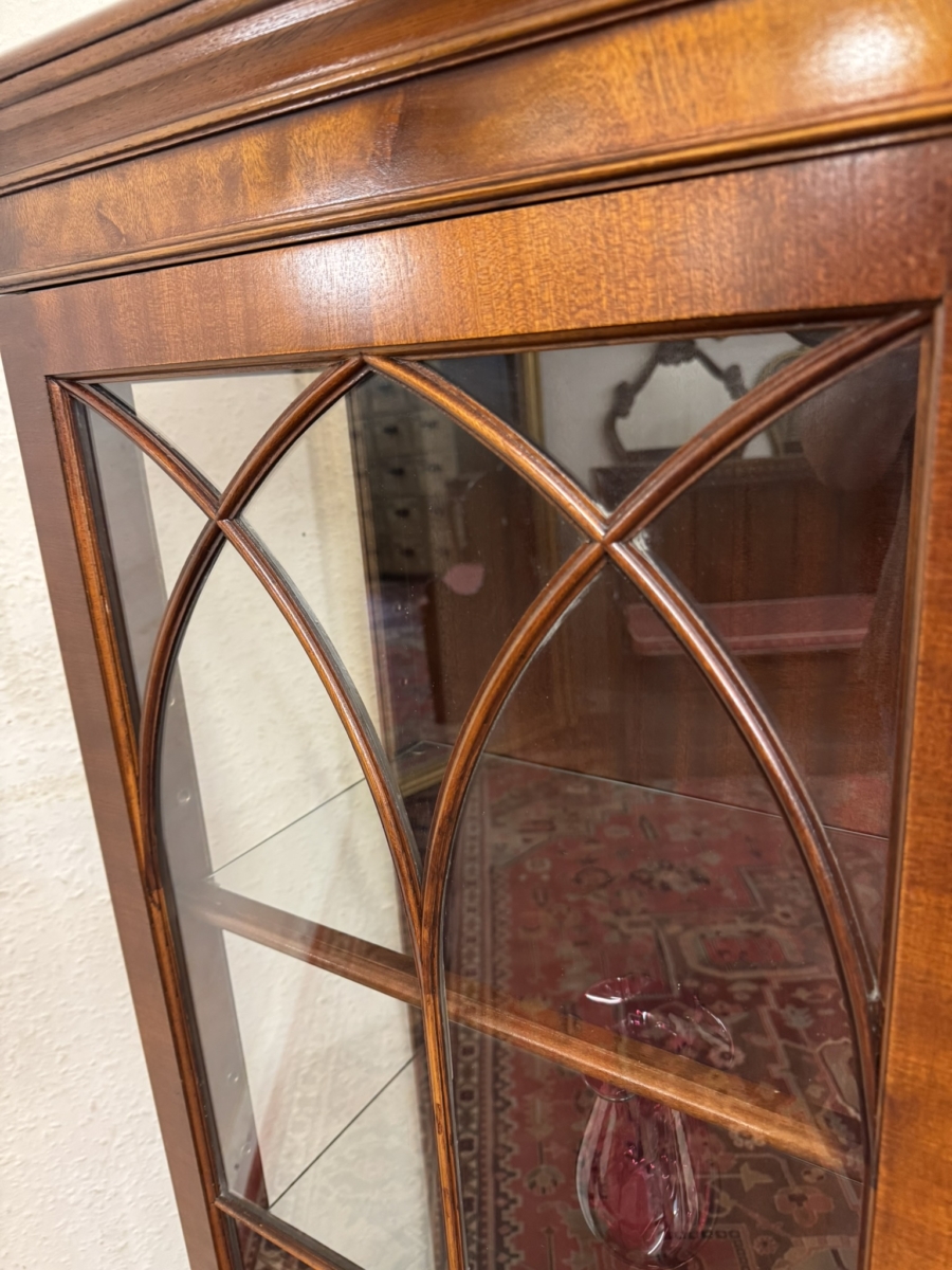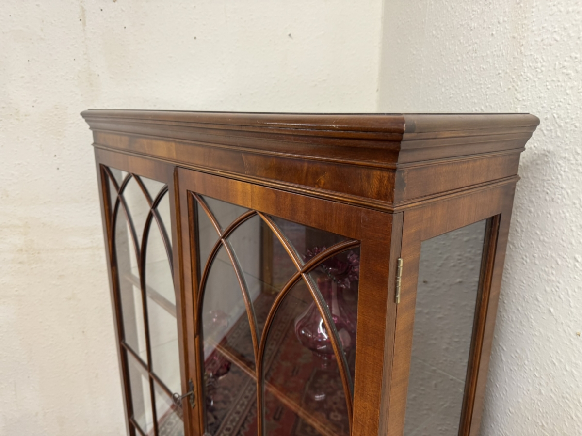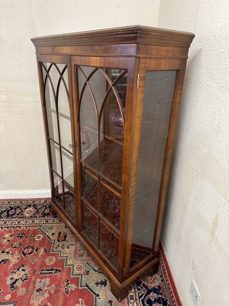 The cabinet dates circa 1980. Fabulous quality and in excellent condition. The cross banded over sailing top sits above a pair of lockable glazed doors, each door having decorative wood barring. The doors open to reveal three adjustable glass shelves. Glass sides and standing on four bracket feet.