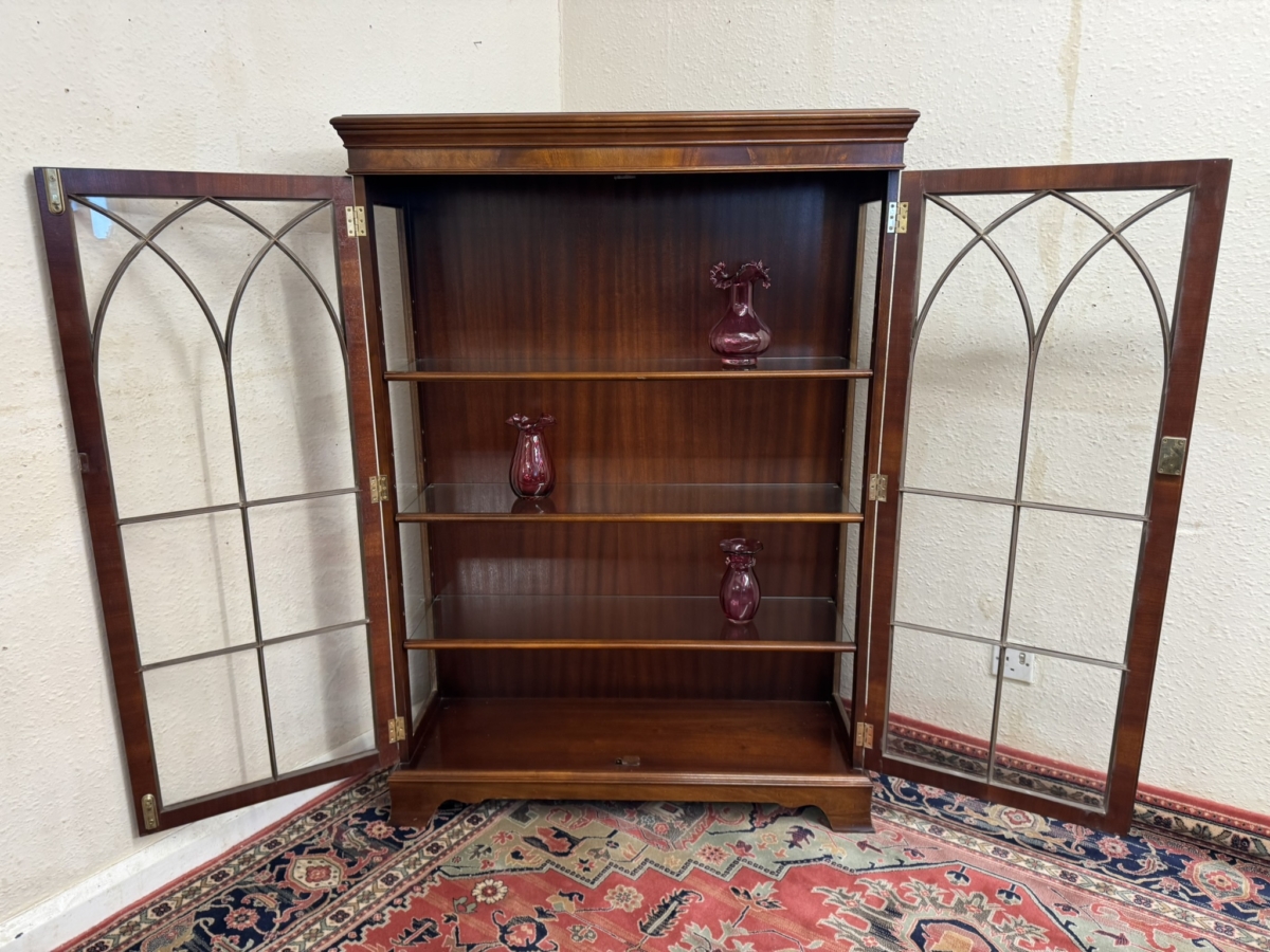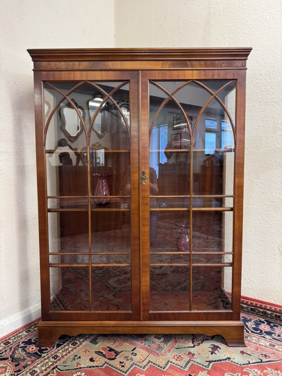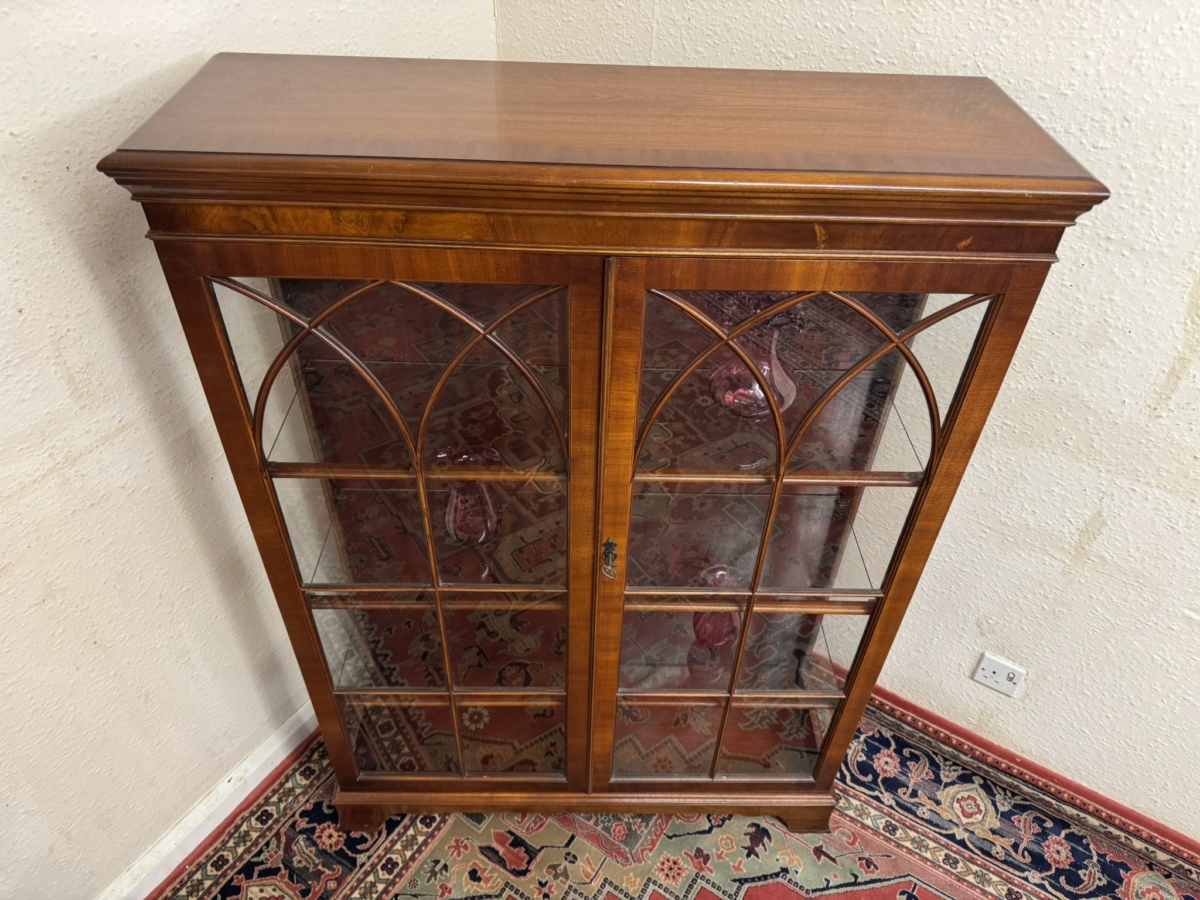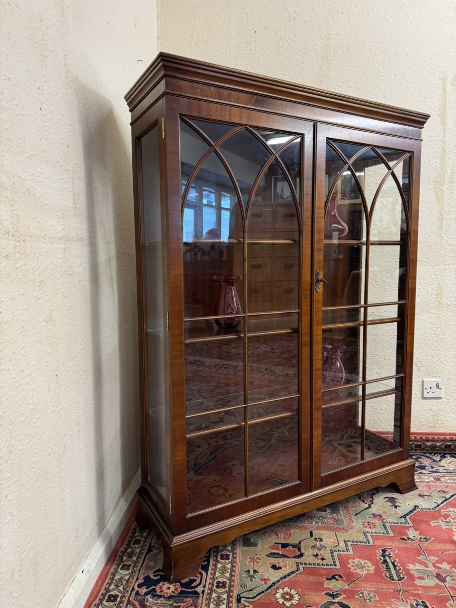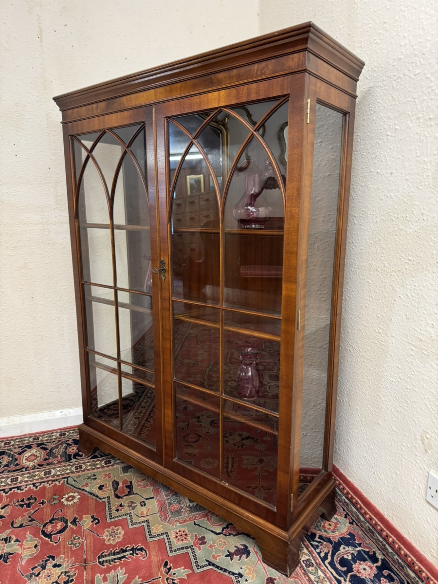 The cabinet dates circa 1980. Fabulous quality and in excellent condition. The cross banded over sailing top sits above a pair of lockable glazed doors, each door having decorative wood barring. The doors open to reveal three adjustable glass shelves. Glass sides and standing on four bracket feet.
