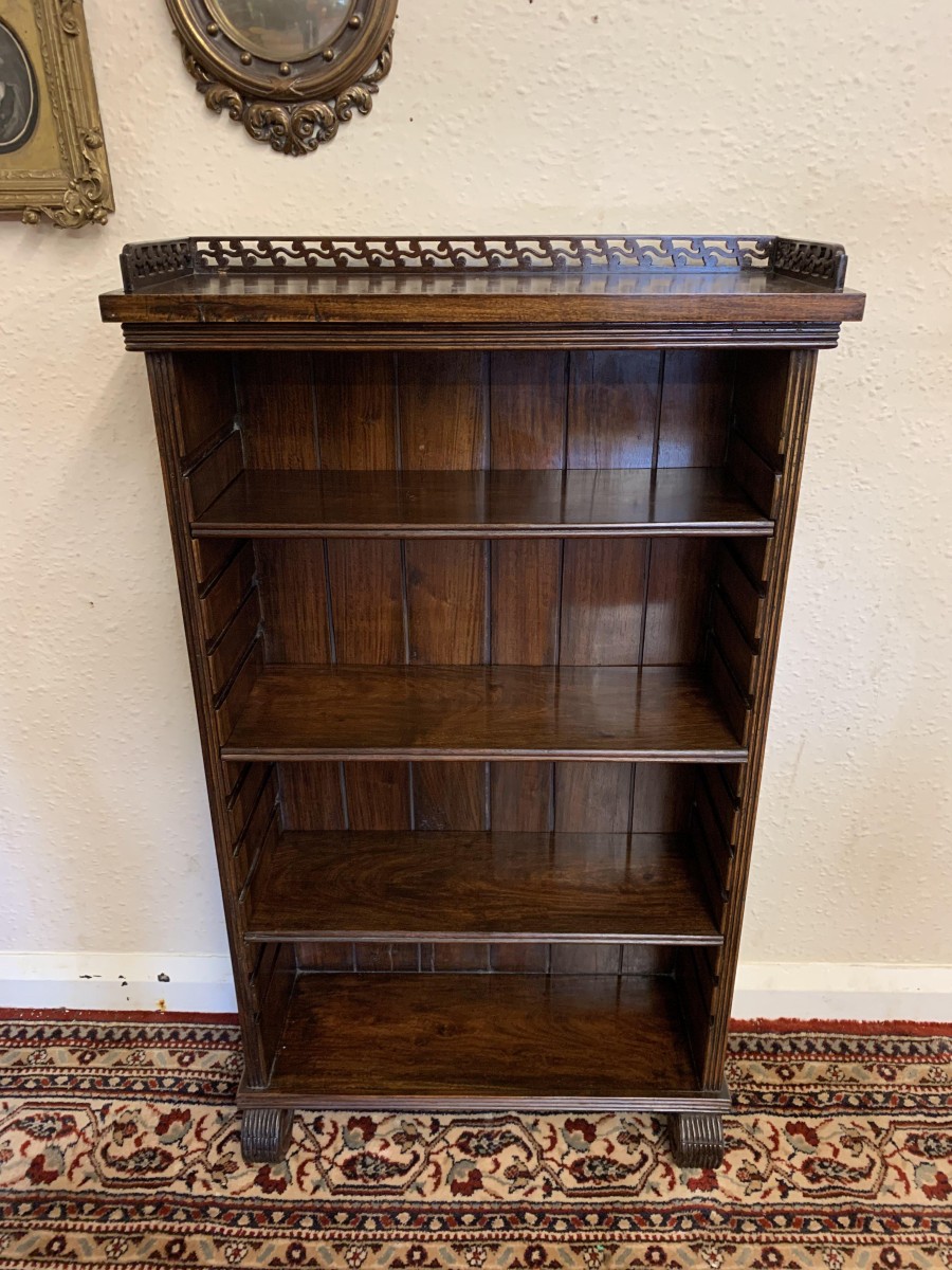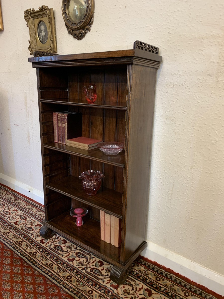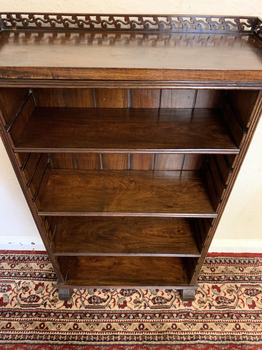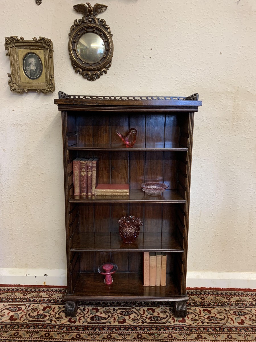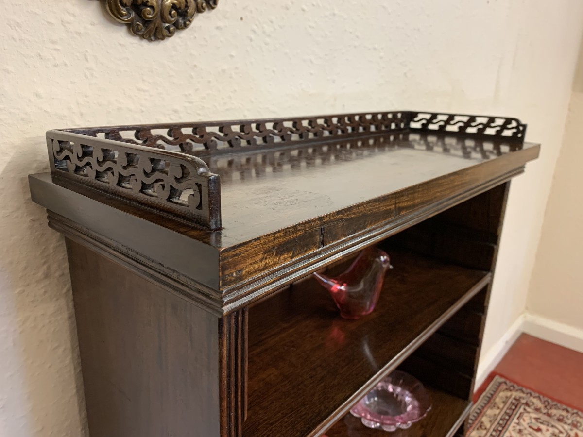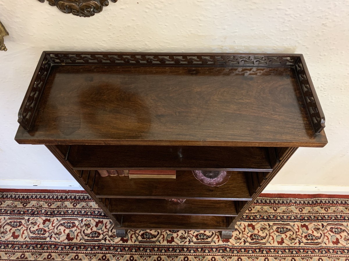 The oversailing top has a raised carved gallery back and sides. Panelled back, three adjustable and removable shelves this neat sized bookcase stands on scroll feet to the front.