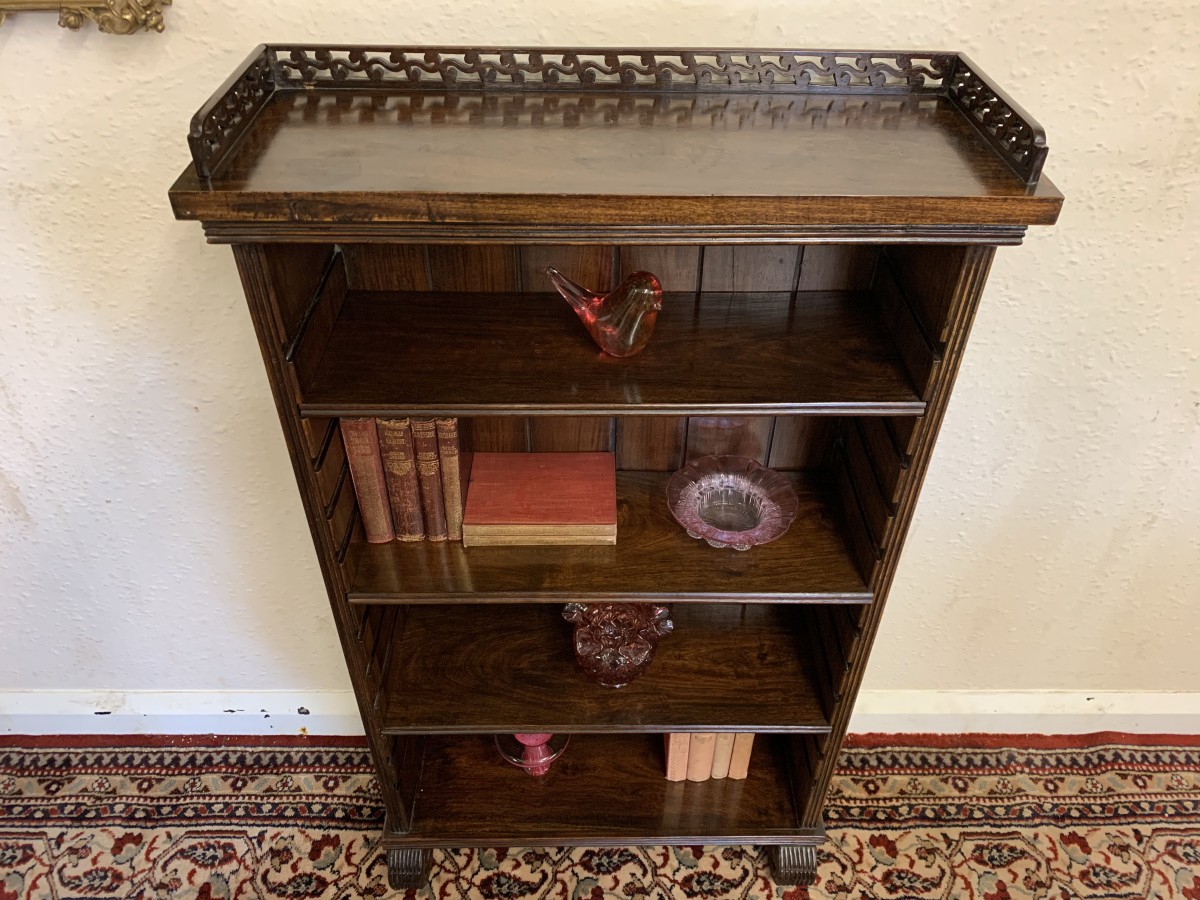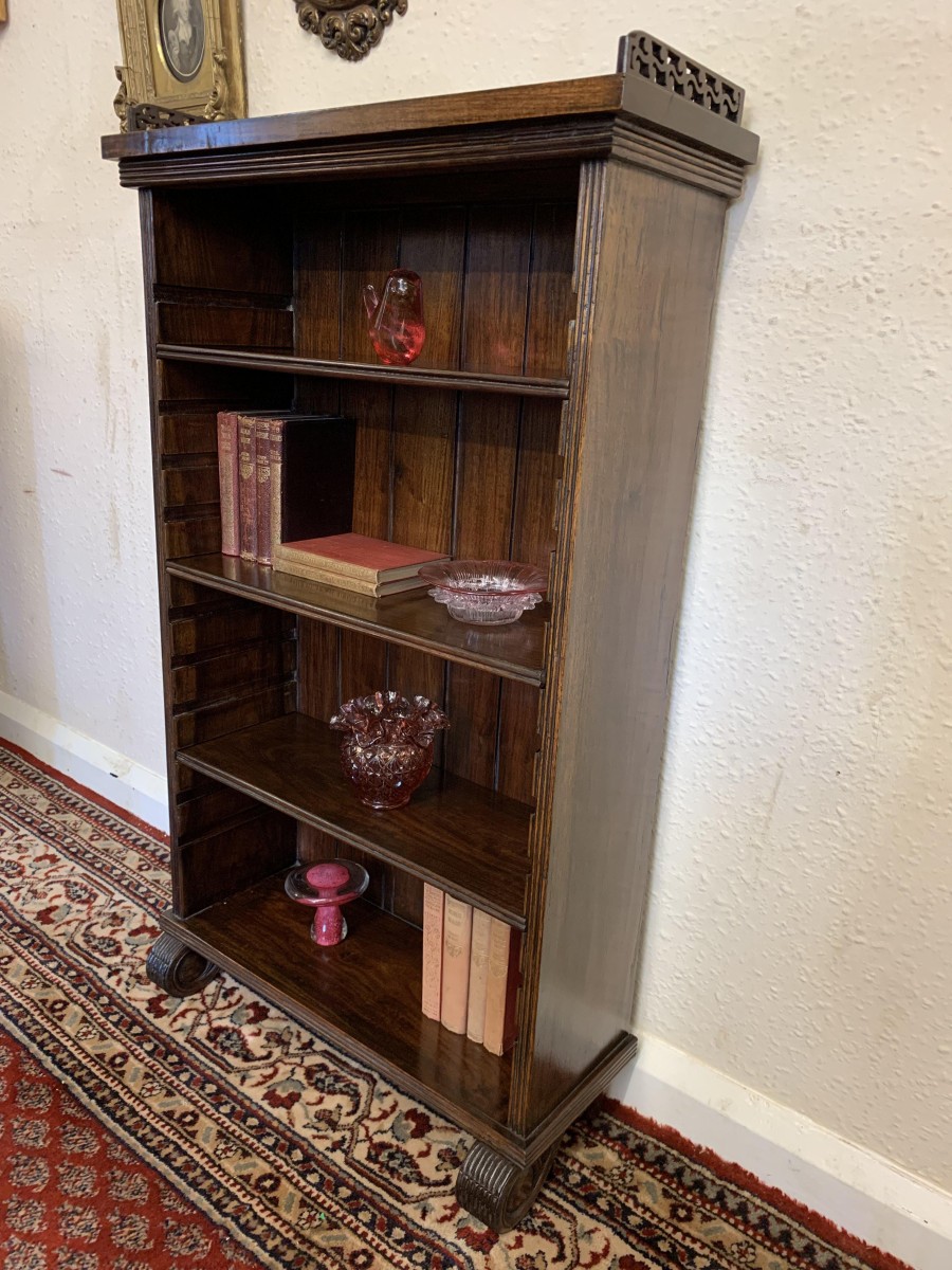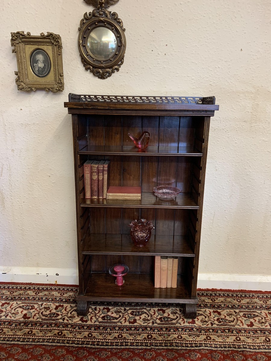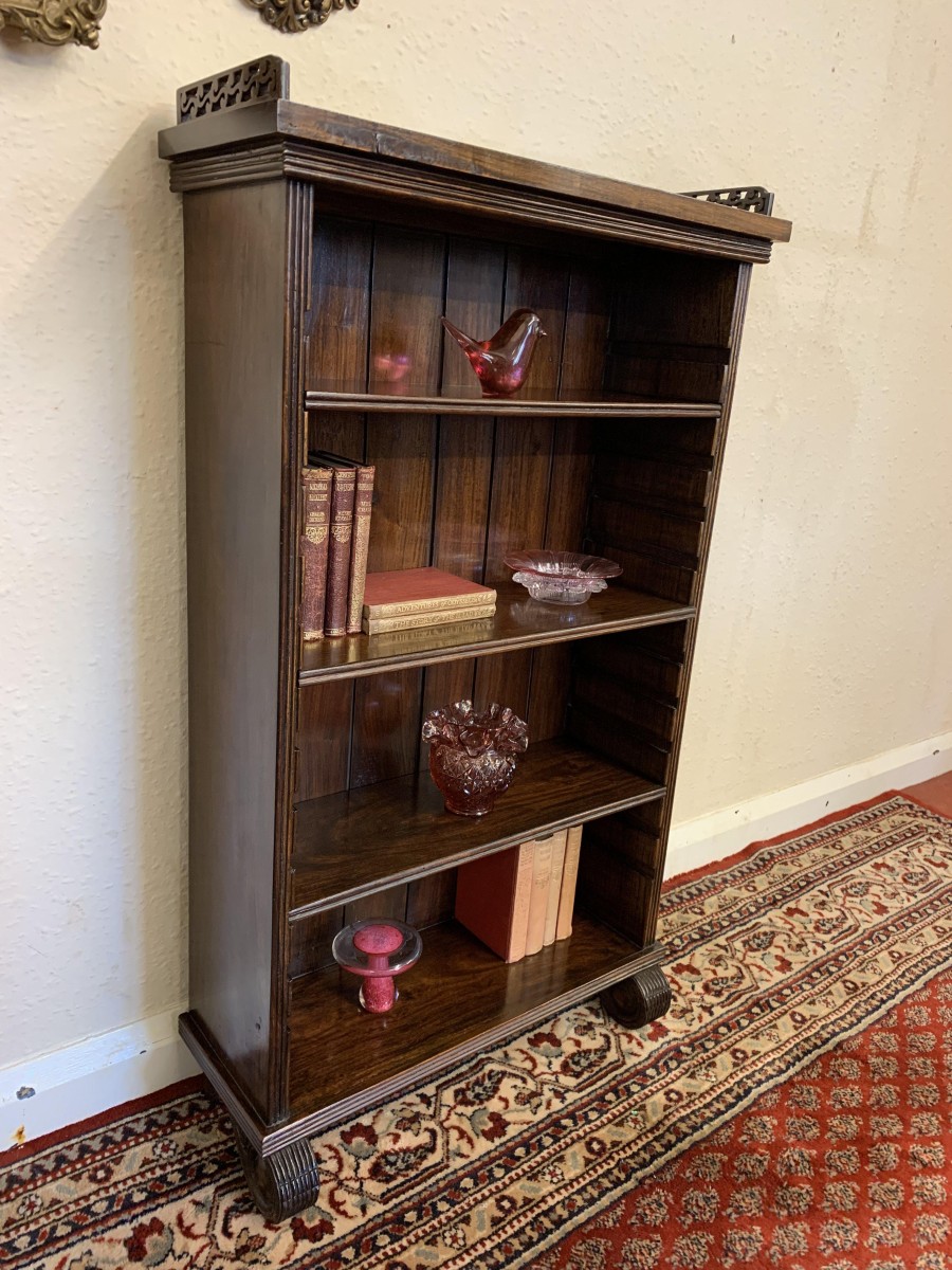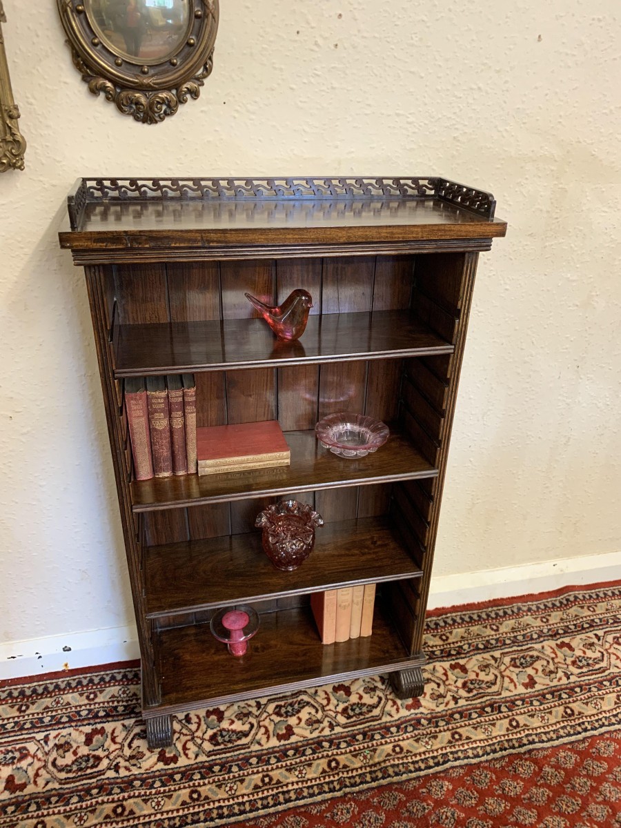 The oversailing top has a raised carved gallery back and sides. Panelled back, three adjustable and removable shelves this neat sized bookcase stands on scroll feet to the front.