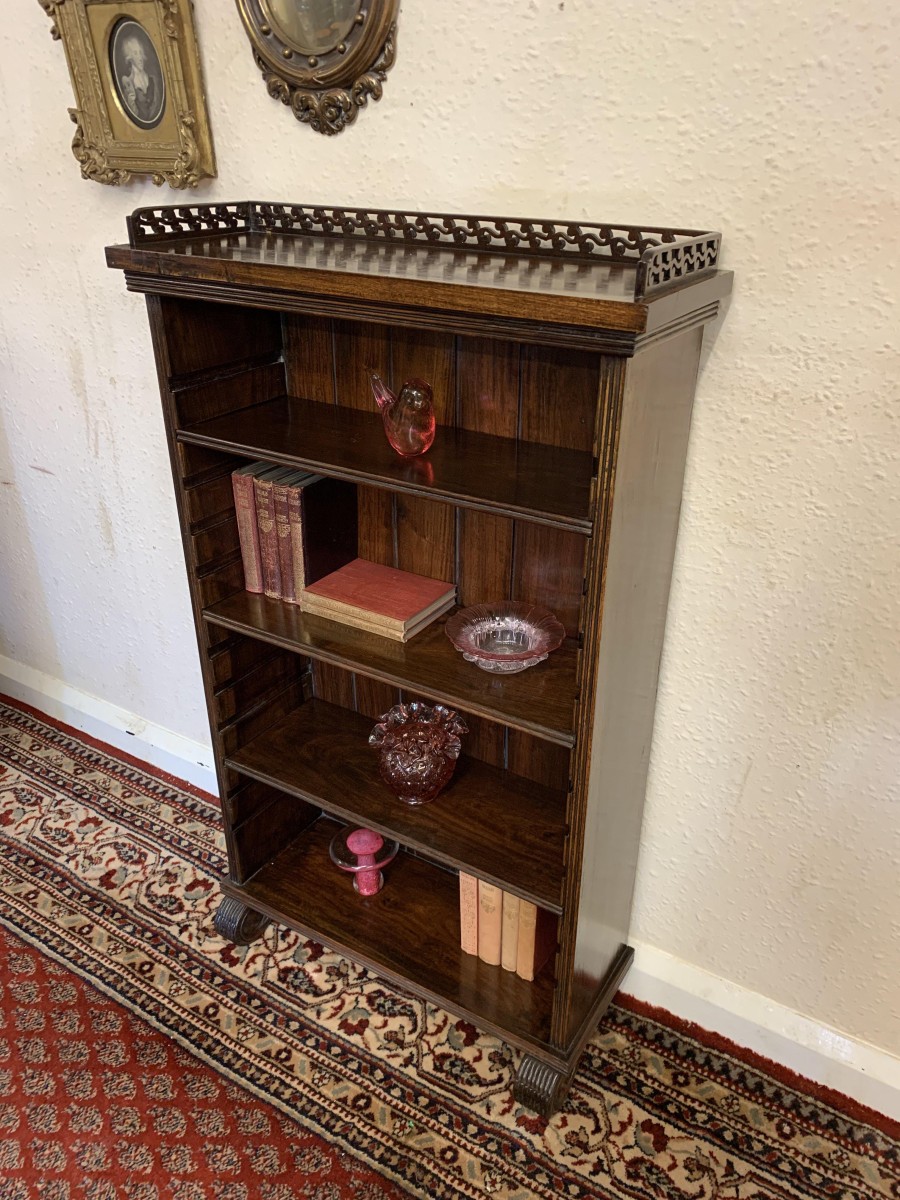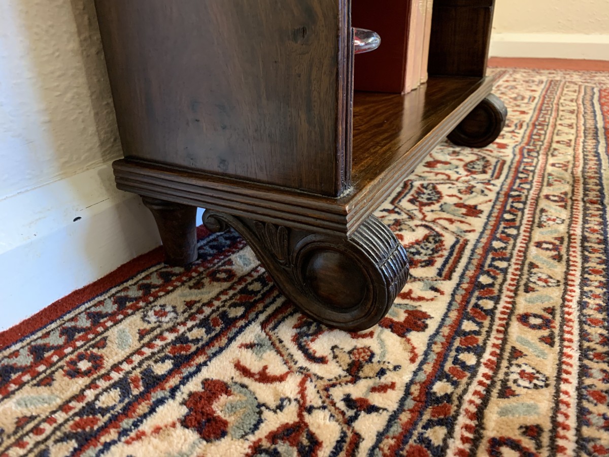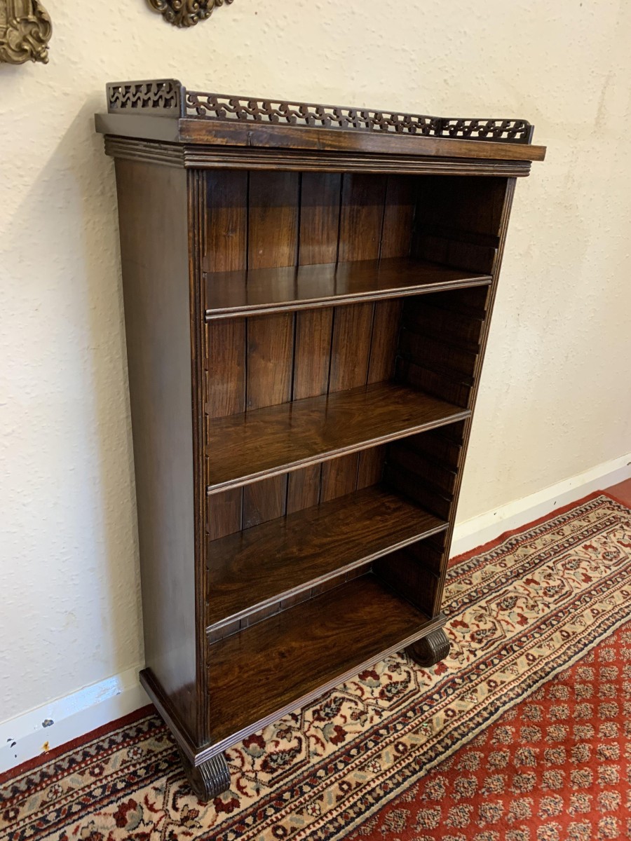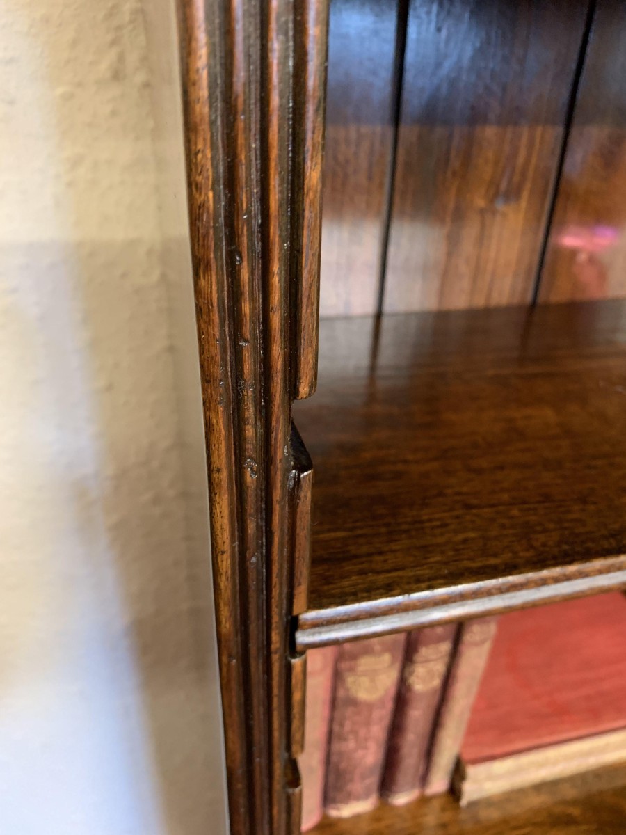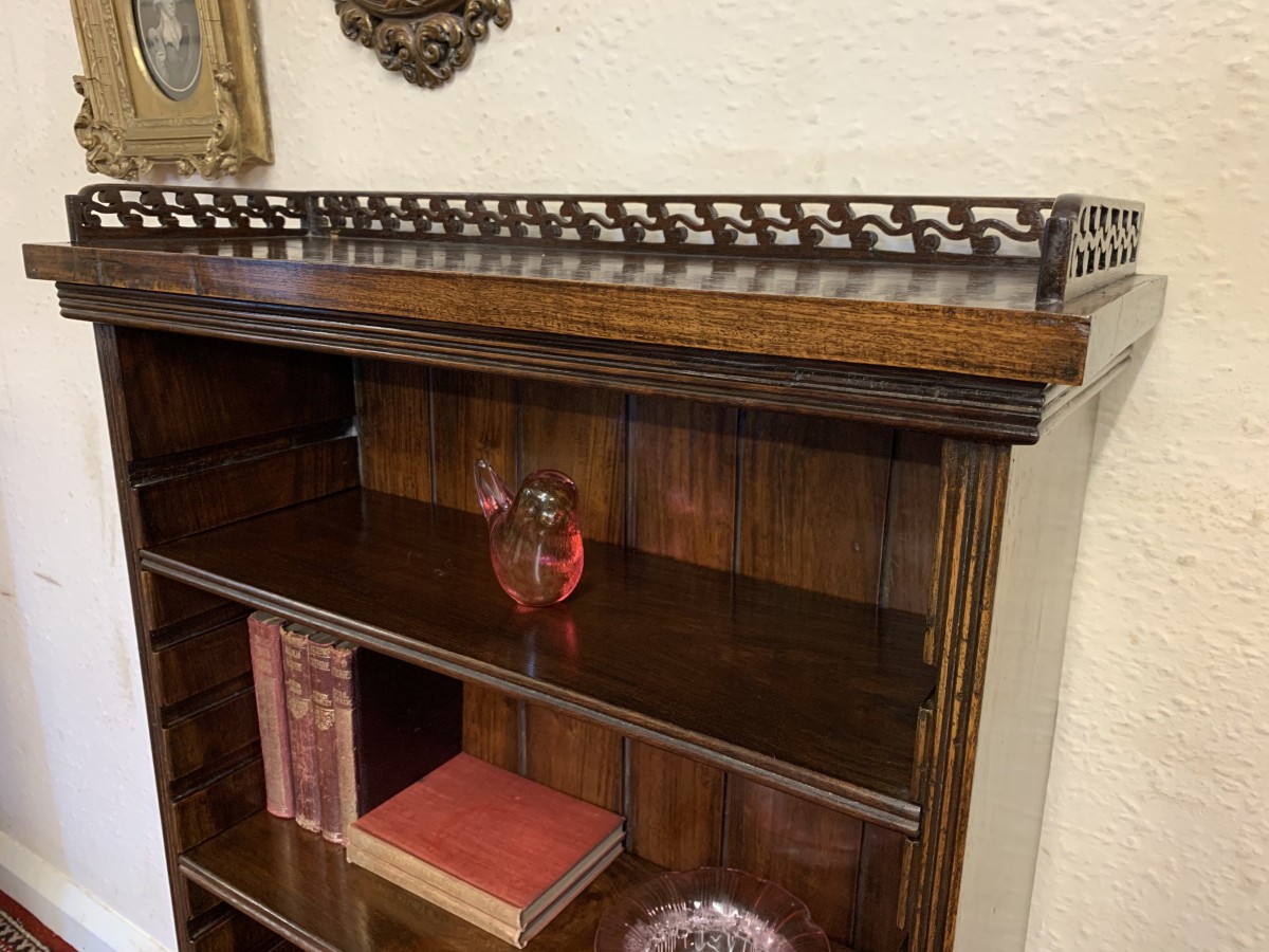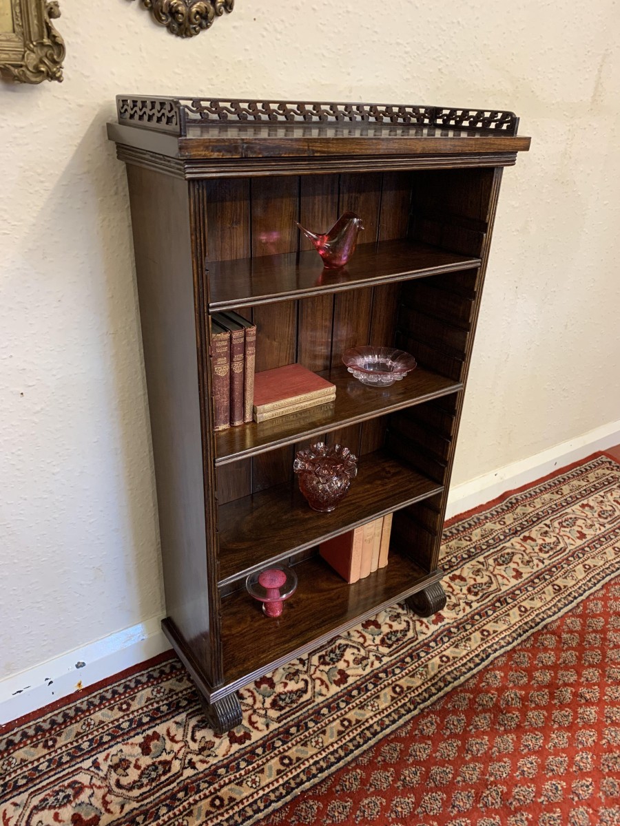 The oversailing top has a raised carved gallery back and sides. Panelled back, three adjustable and removable shelves this neat sized bookcase stands on scroll feet to the front.