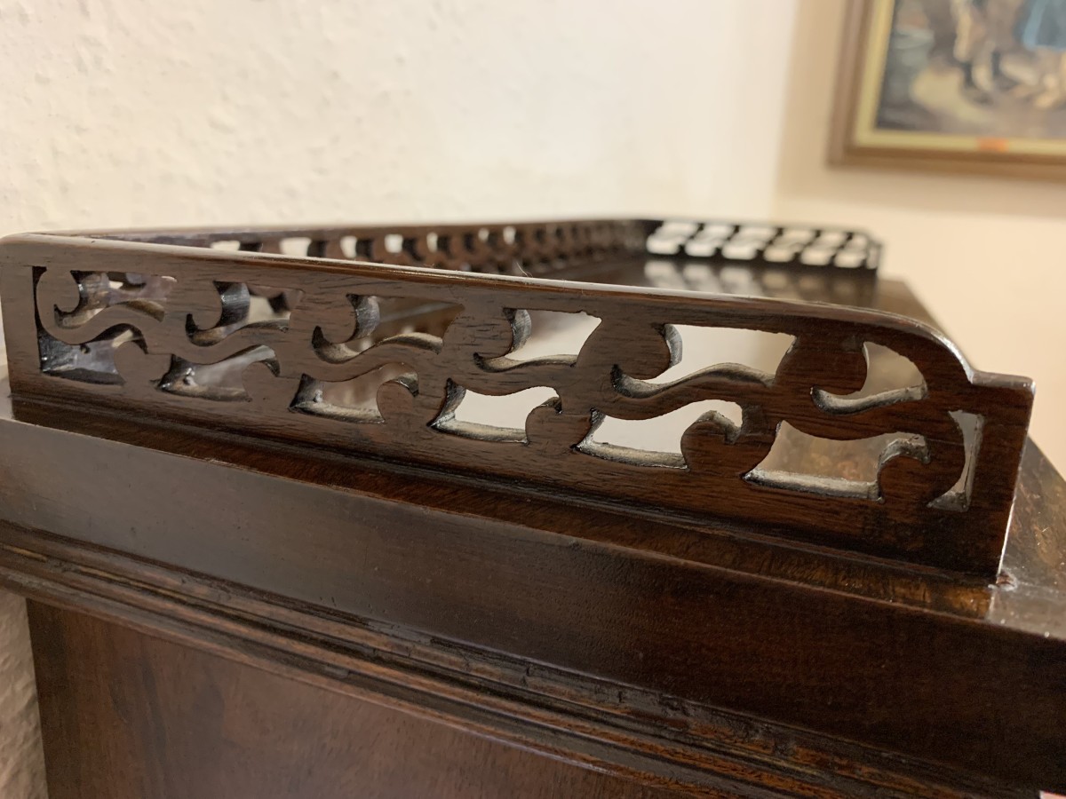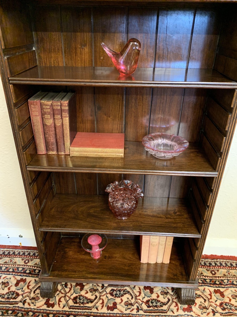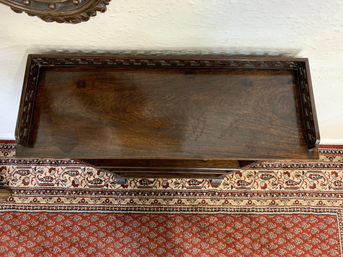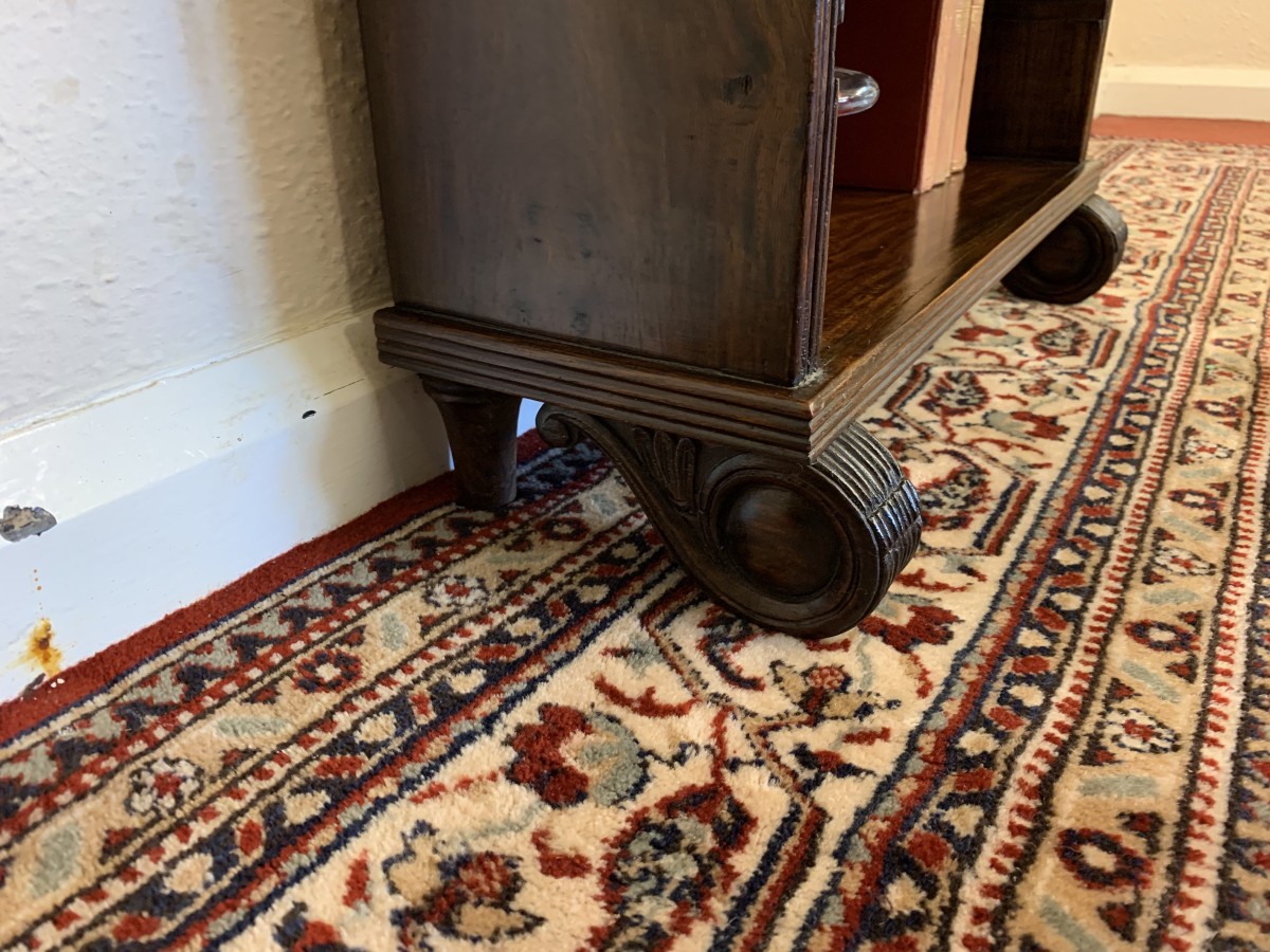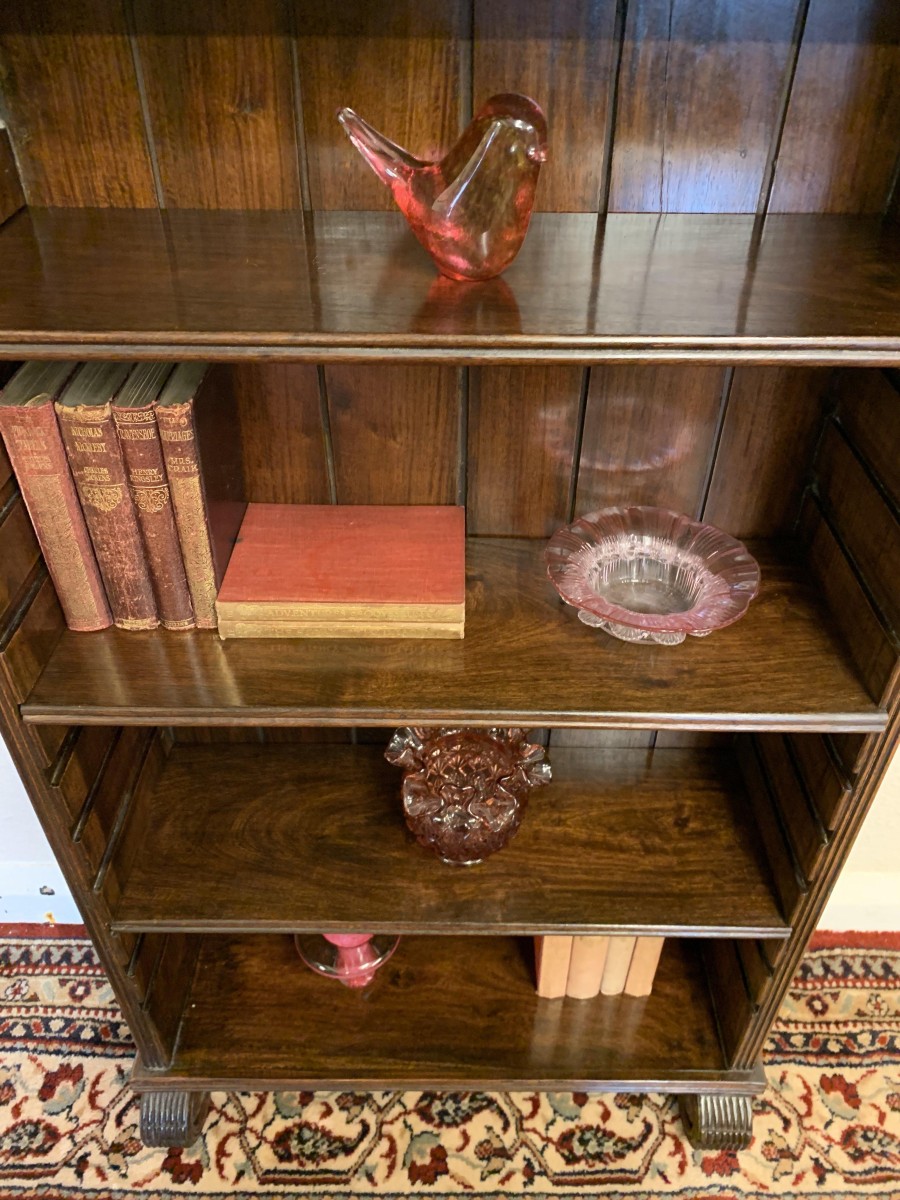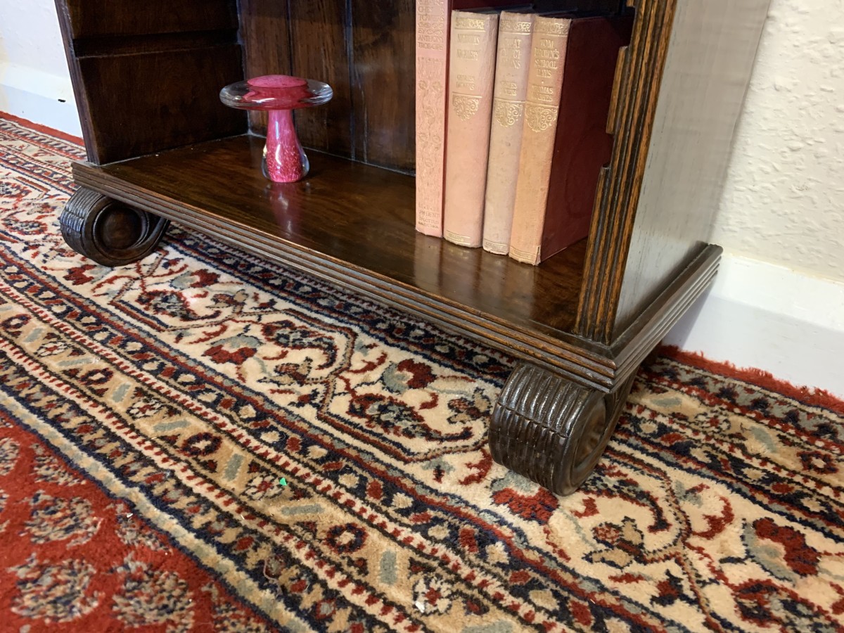 The oversailing top has a raised carved gallery back and sides. Panelled back, three adjustable and removable shelves this neat sized bookcase stands on scroll feet to the front.