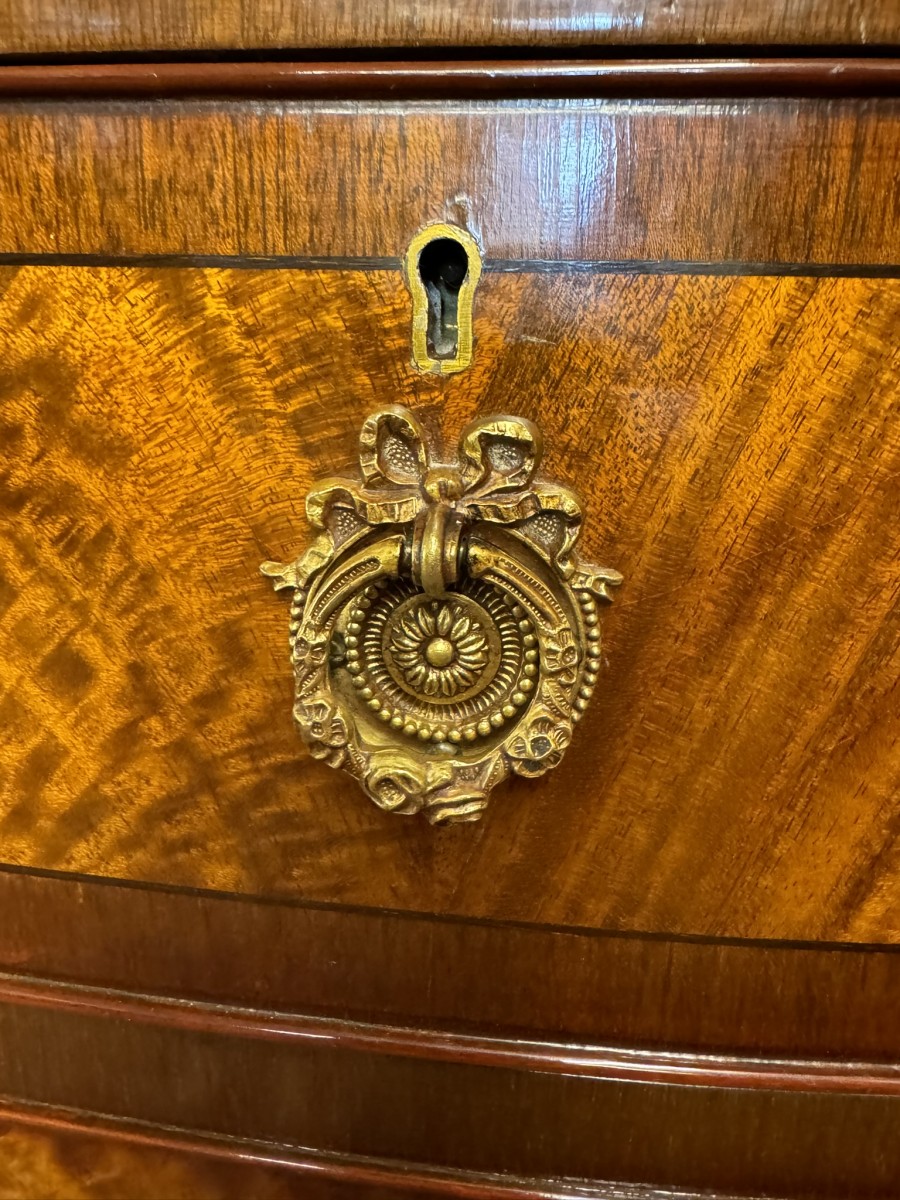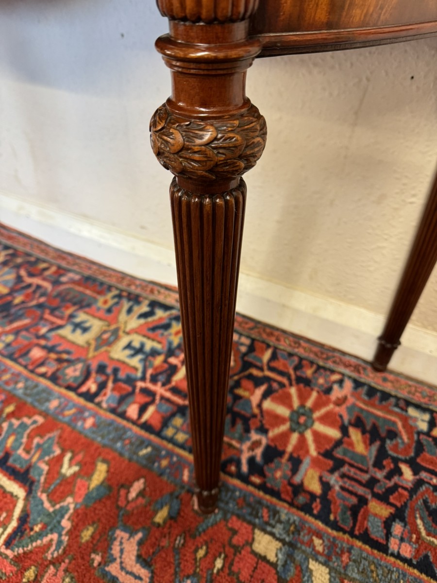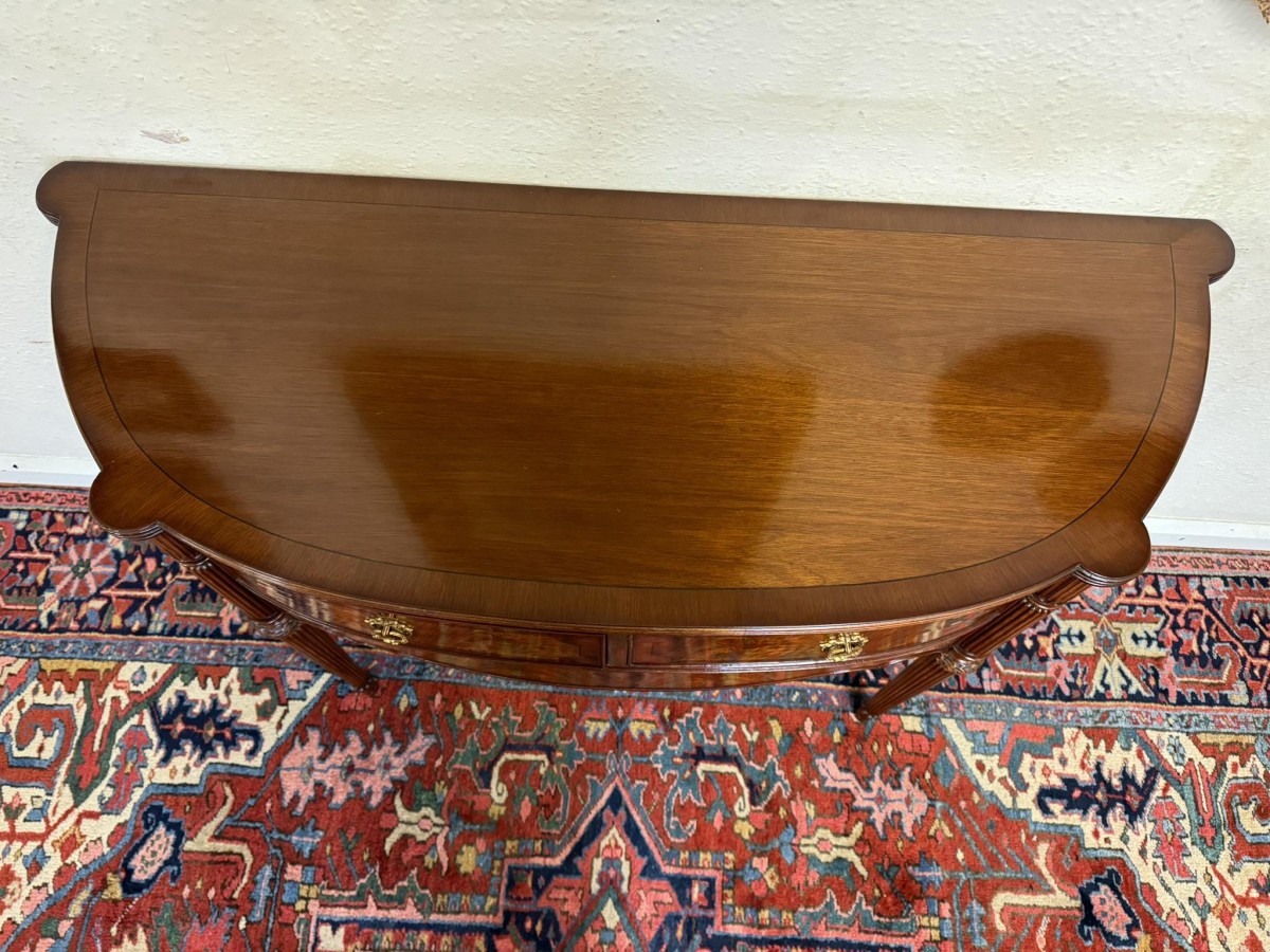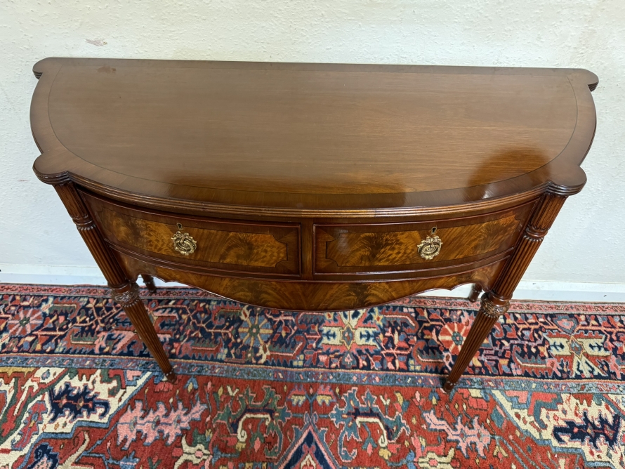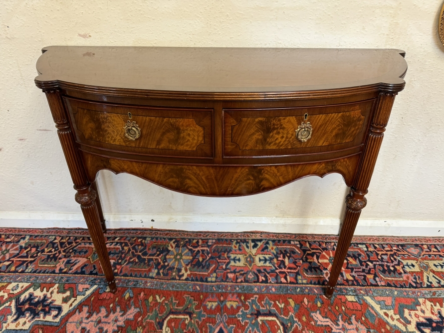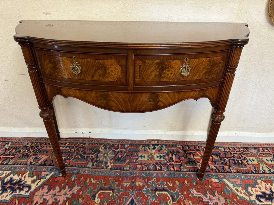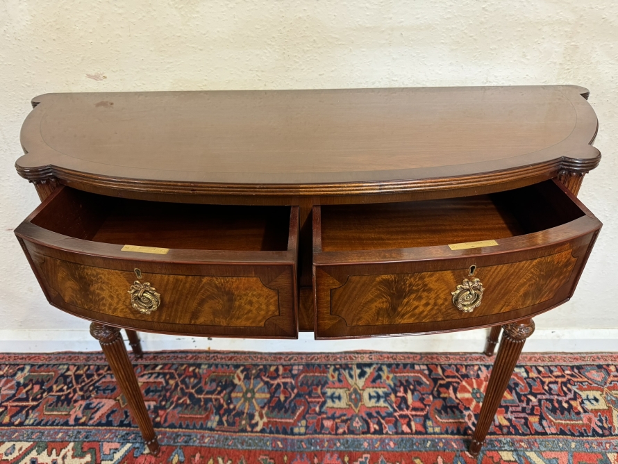 Made in striking mahogany this item oozes quality, with a shaped top with cross banded edging. Curved sides, two drawers to the front, each drawer having an ornate brass handle, shaped skirt to the front and standing on four reeded turned and tapered legs.