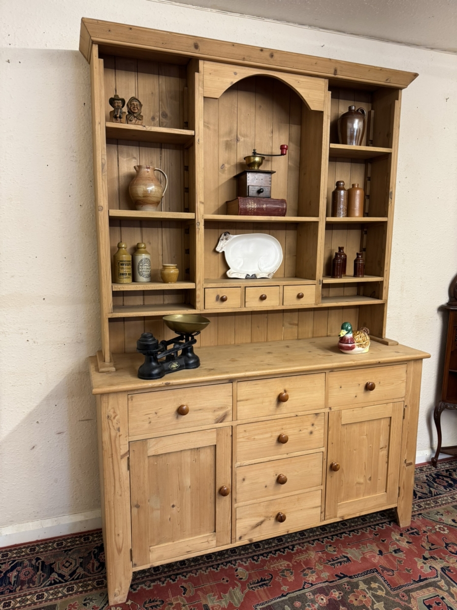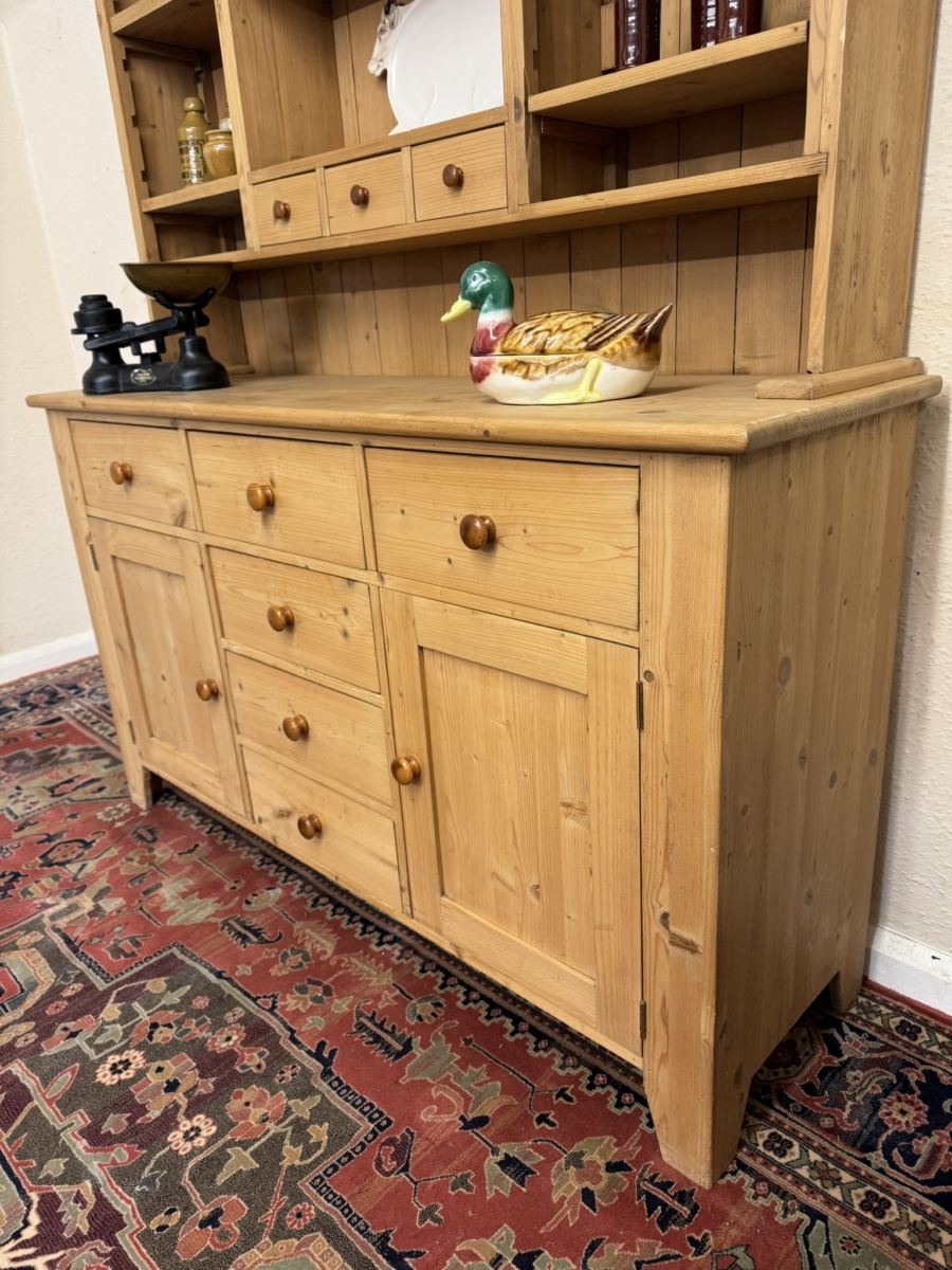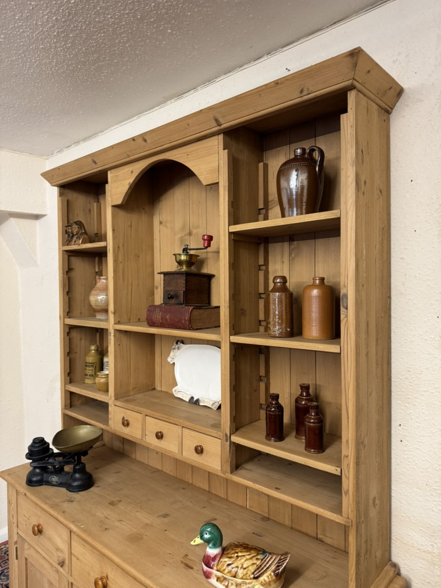 The over sailing top sits above a central open section with three drawers below. The central section is flanked by a pair of open sections, each section having three adjustable yet removable shelves. The base section has four central drawers, two drawers to each side which sits above a recessed panelled cupboard door, the doors open to reveal a removable shelf. The dresser stands on traditional block feet.
