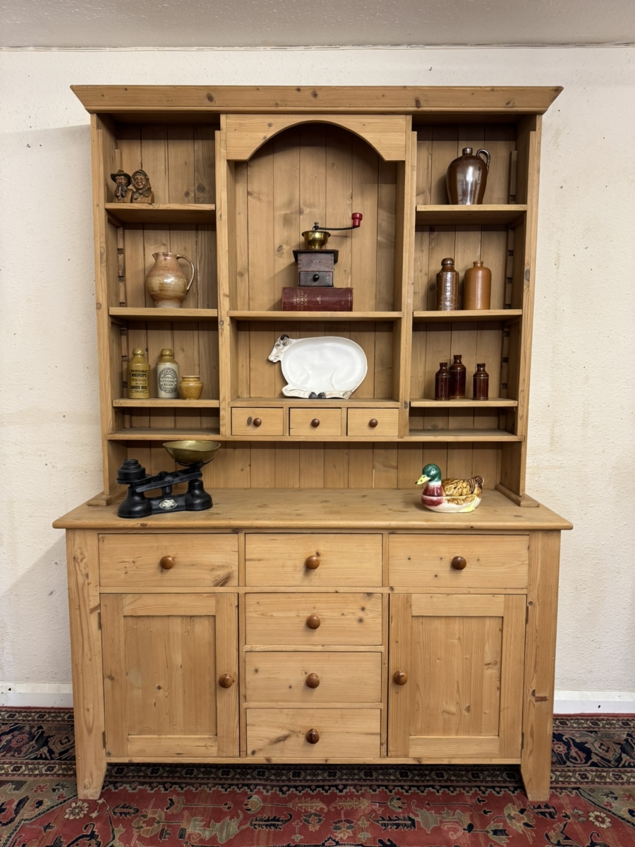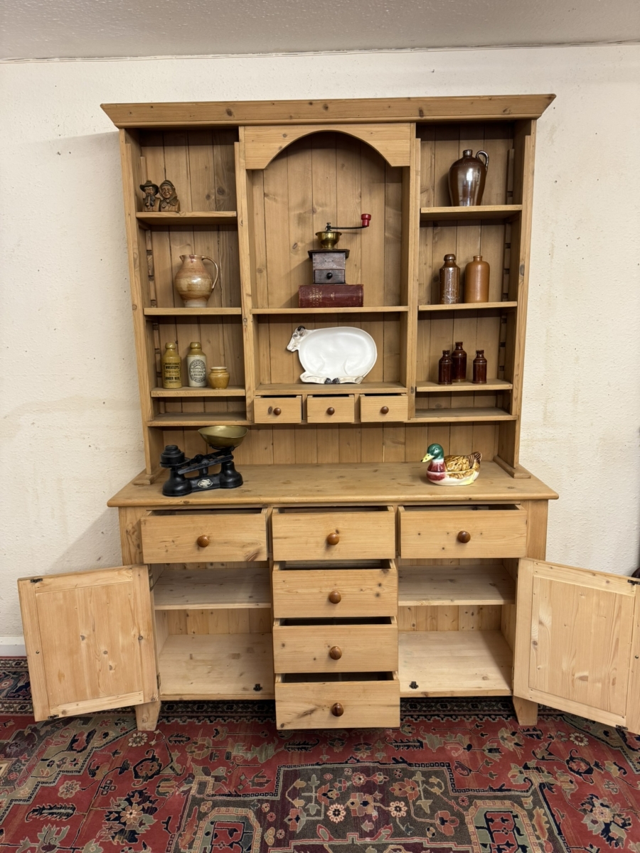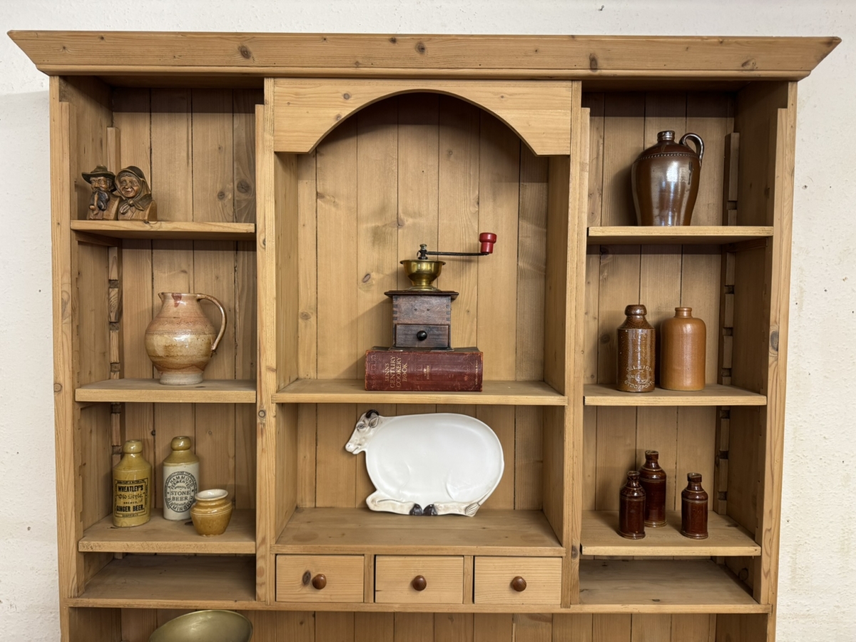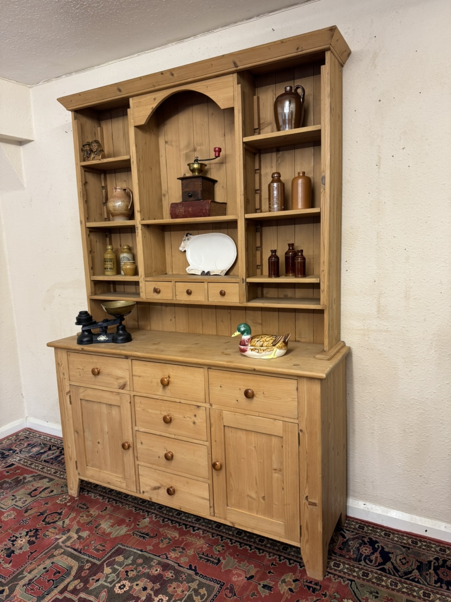 The over sailing top sits above a central open section with three drawers below. The central section is flanked by a pair of open sections, each section having three adjustable yet removable shelves. The base section has four central drawers, two drawers to each side which sits above a recessed panelled cupboard door, the doors open to reveal a removable shelf. The dresser stands on traditional block feet.