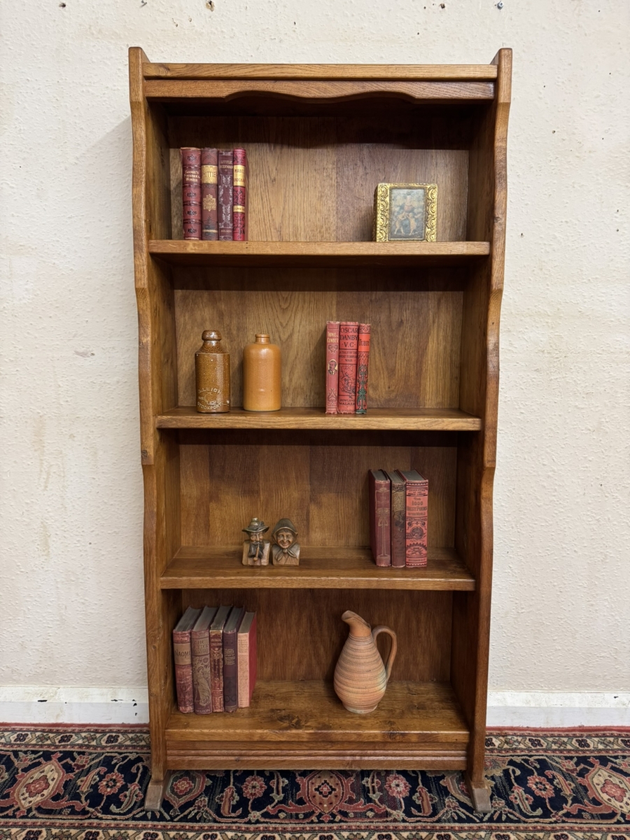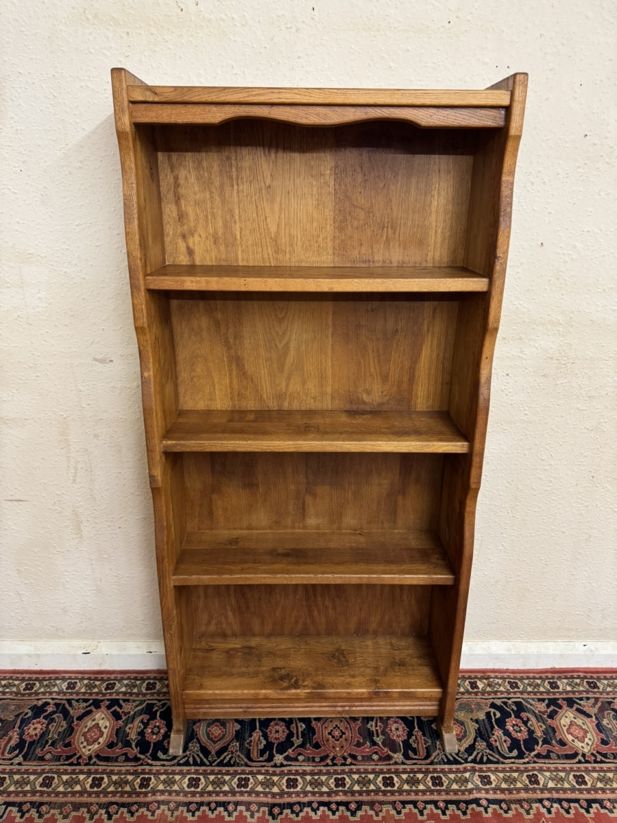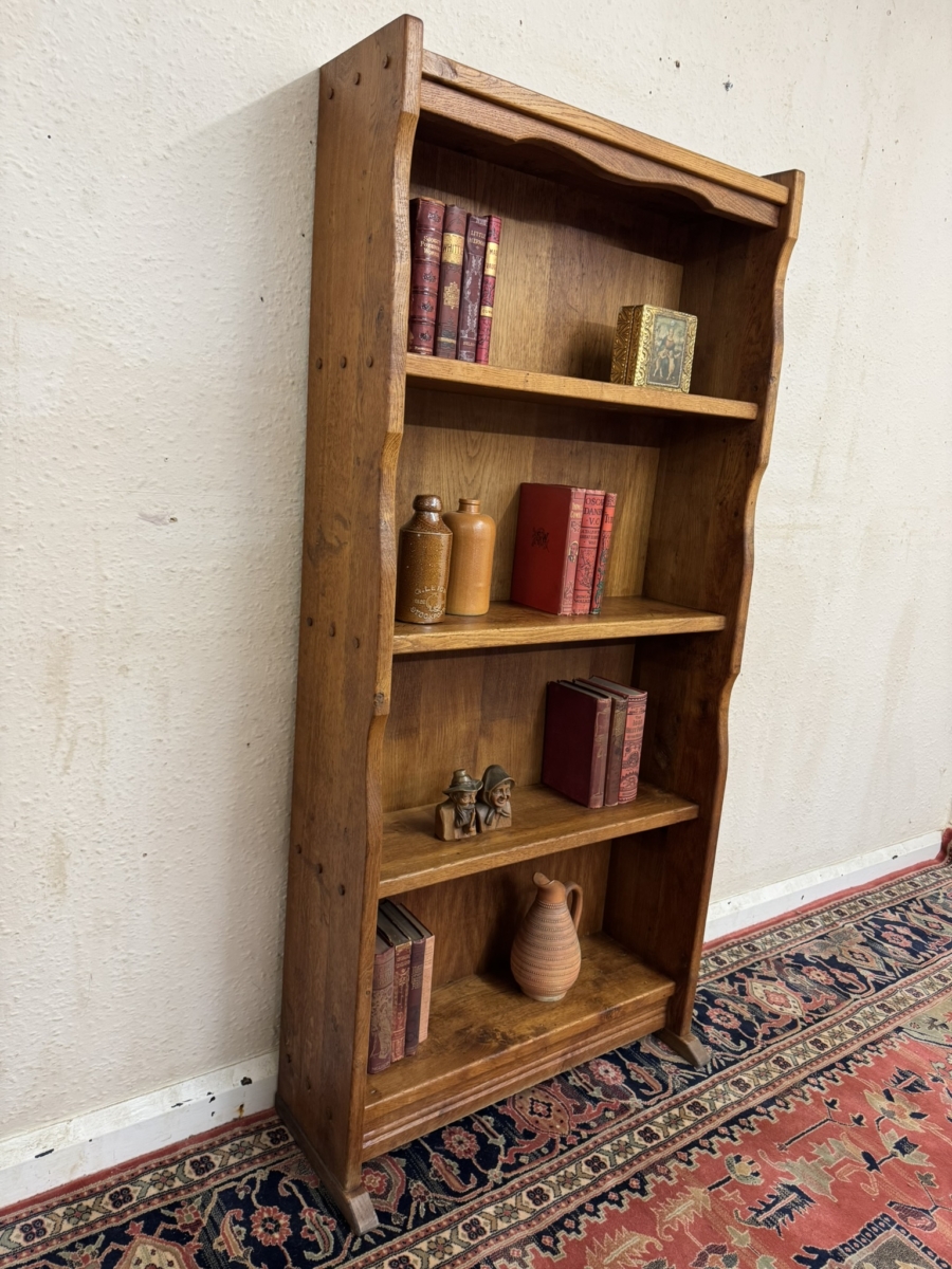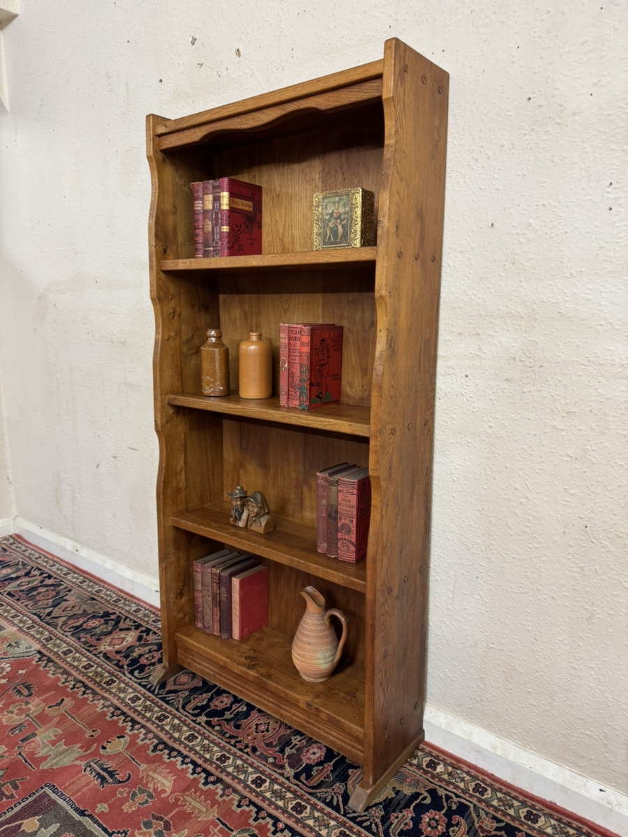 This super bookcase made in solid oak with a natural finish, it has open fixed shelving slightly curved sides with visible dowels sitting on a sled foot. Please note we are also selling selling two matching bookcases (as pictured)