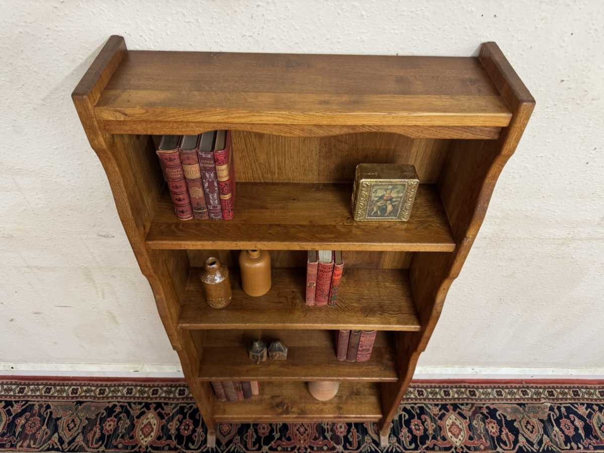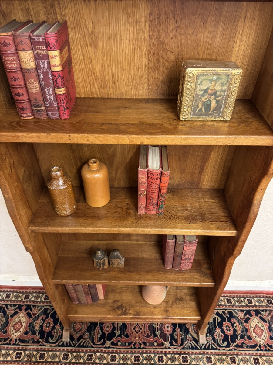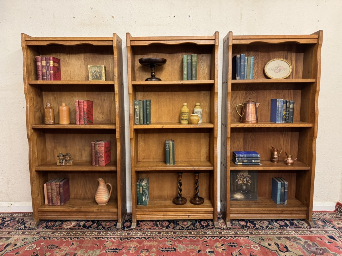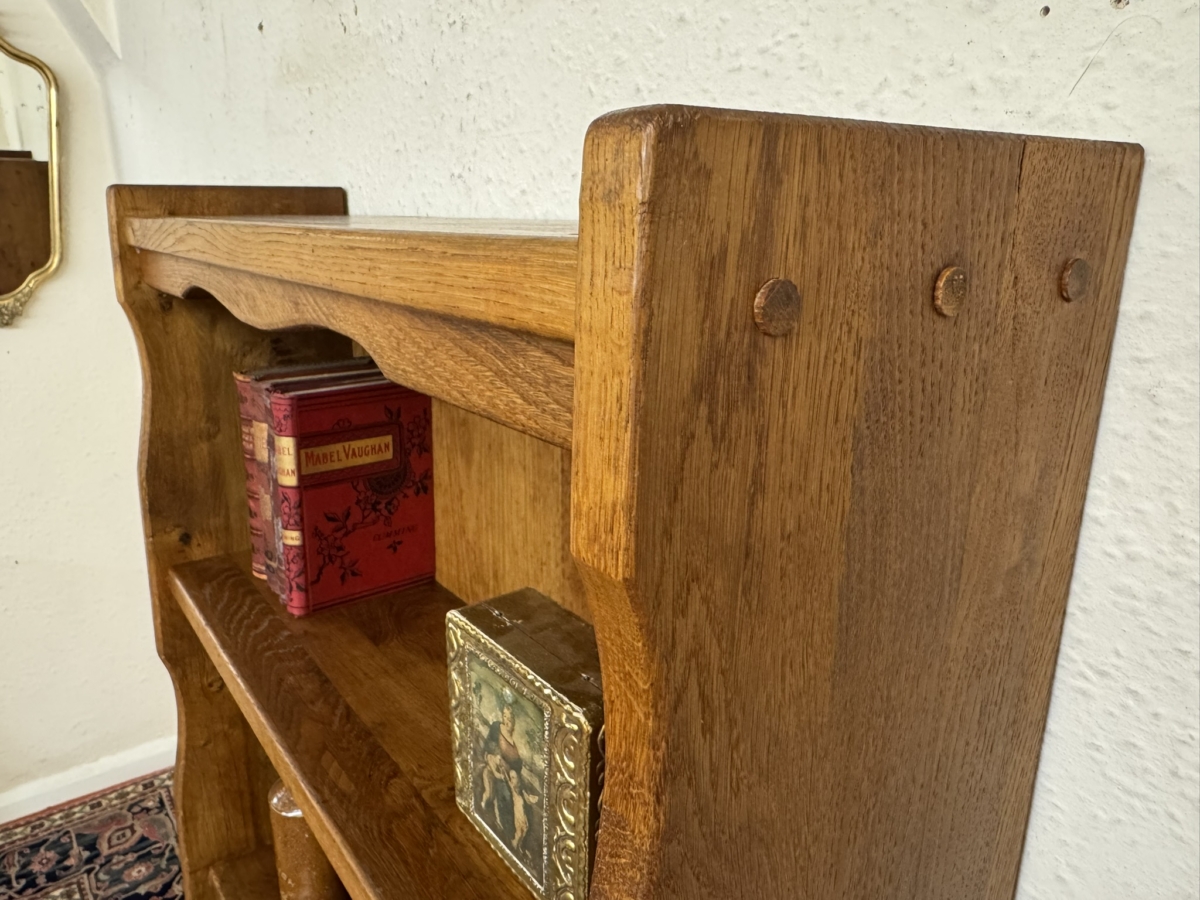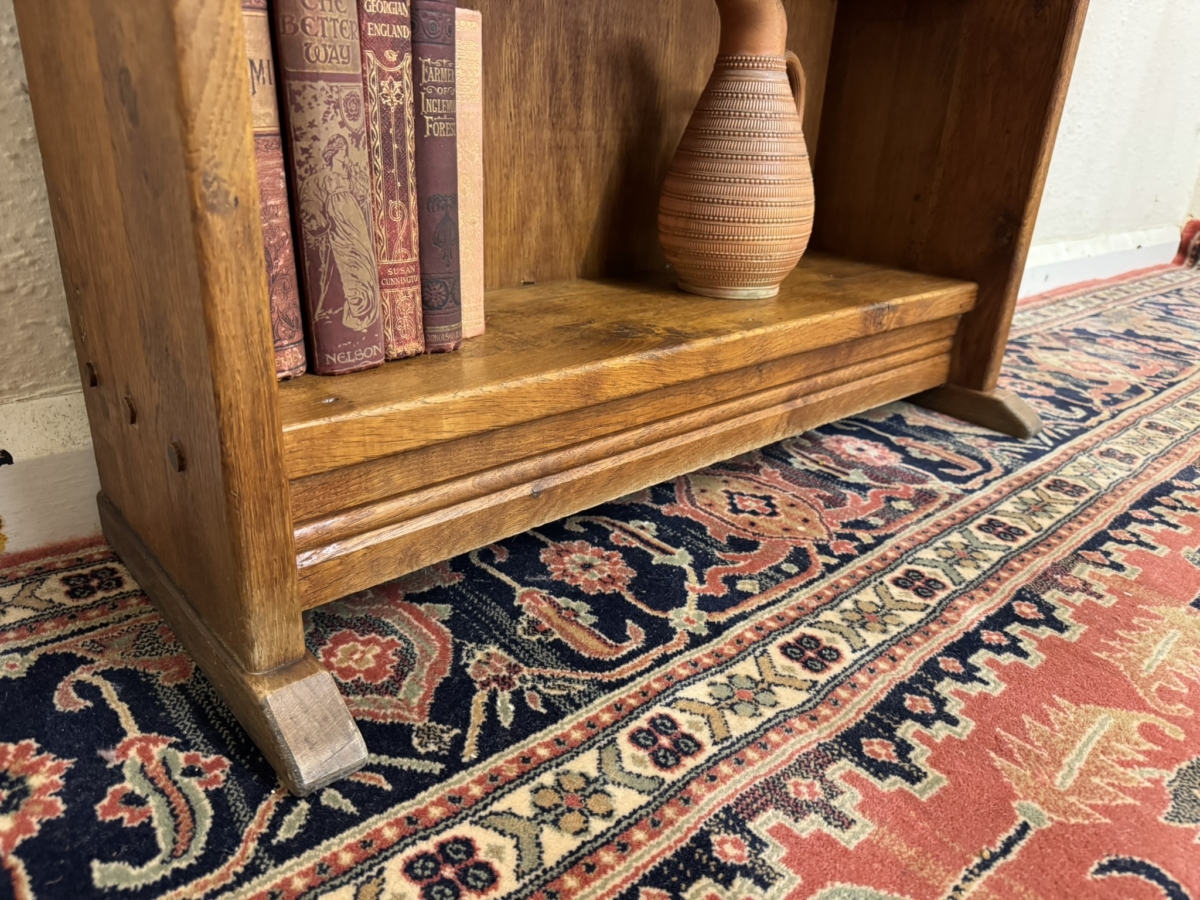 This super bookcase made in solid oak with a natural finish, it has open fixed shelving slightly curved sides with visible dowels sitting on a sled foot. Please note we are also selling selling two matching bookcases (as pictured)