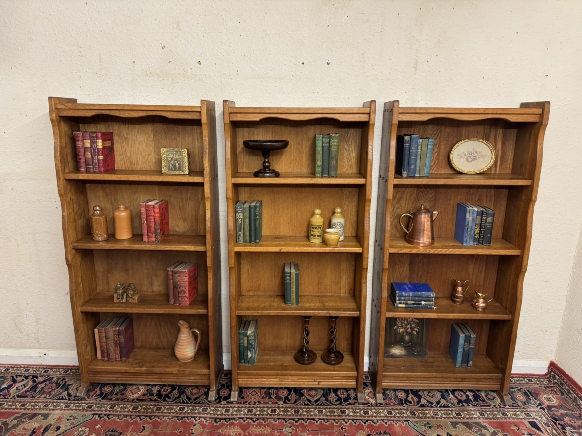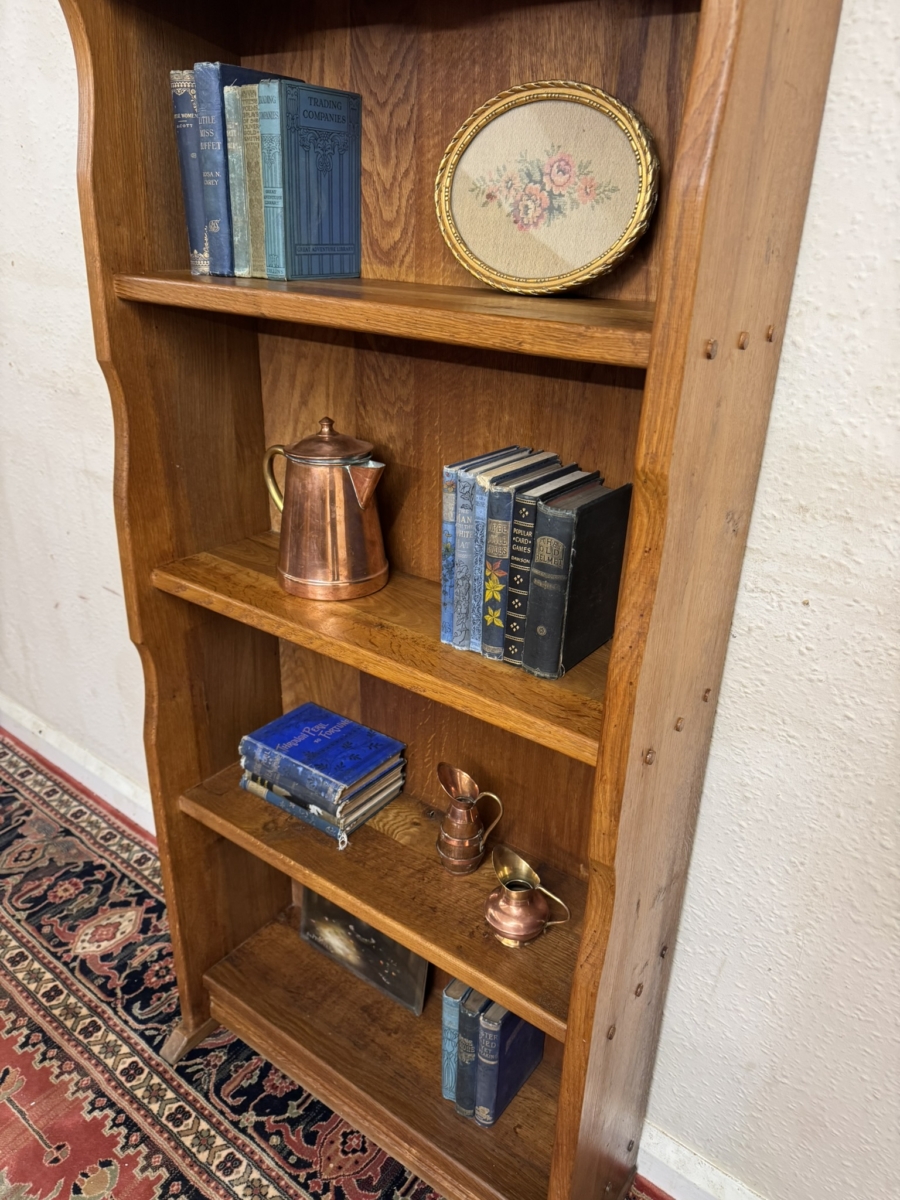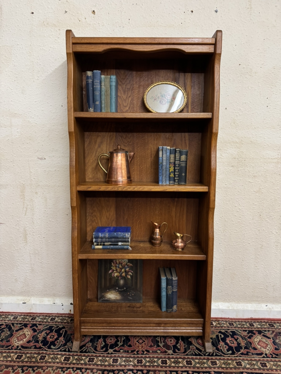 This super bookcase made in solid oak has a natural finish. with open fixed shelving slightly curved sides with visible dowels sitting on a sled foot. Please note we are also listing two matching bookcases (as pictured)