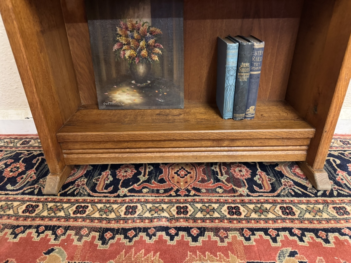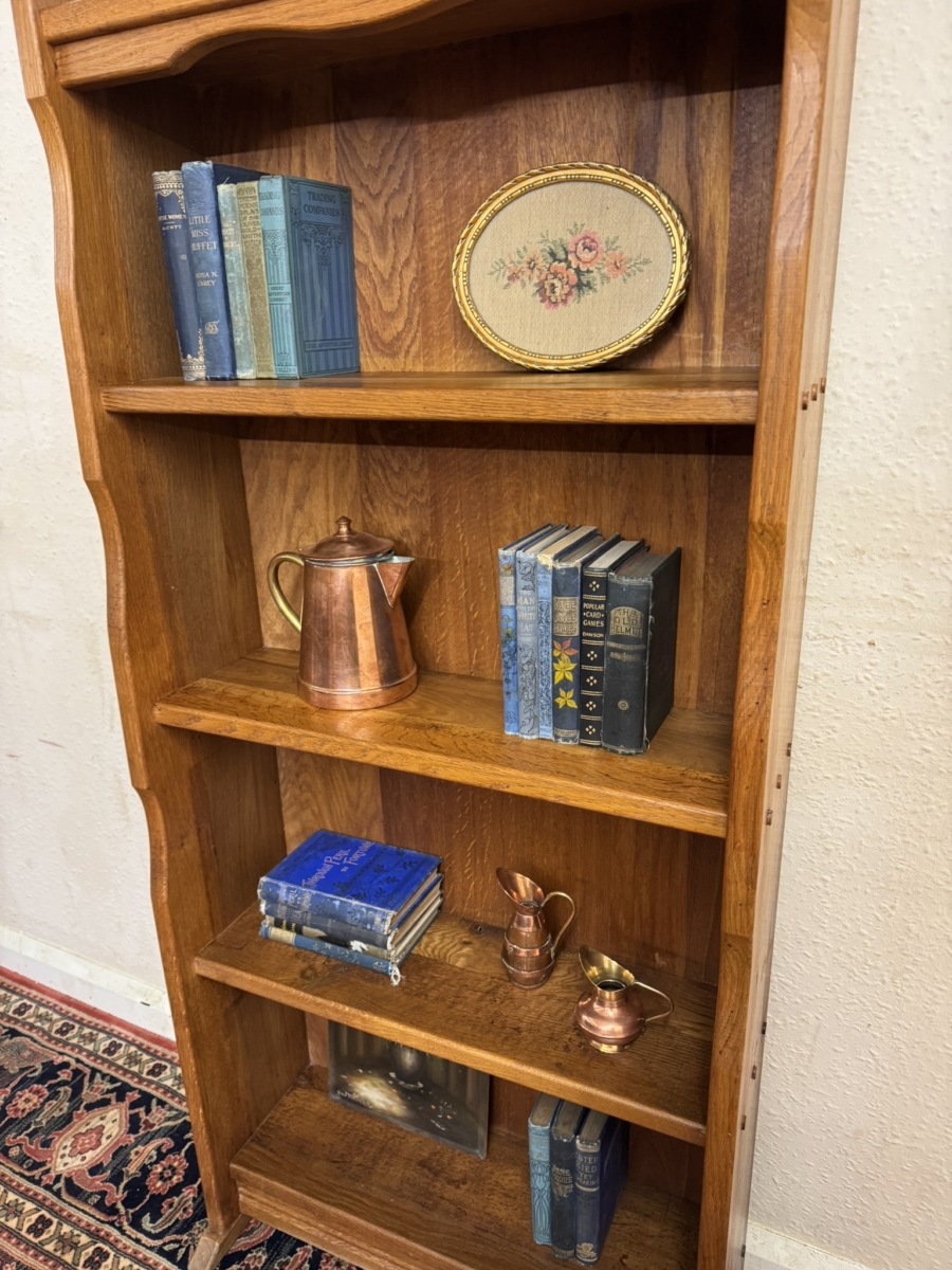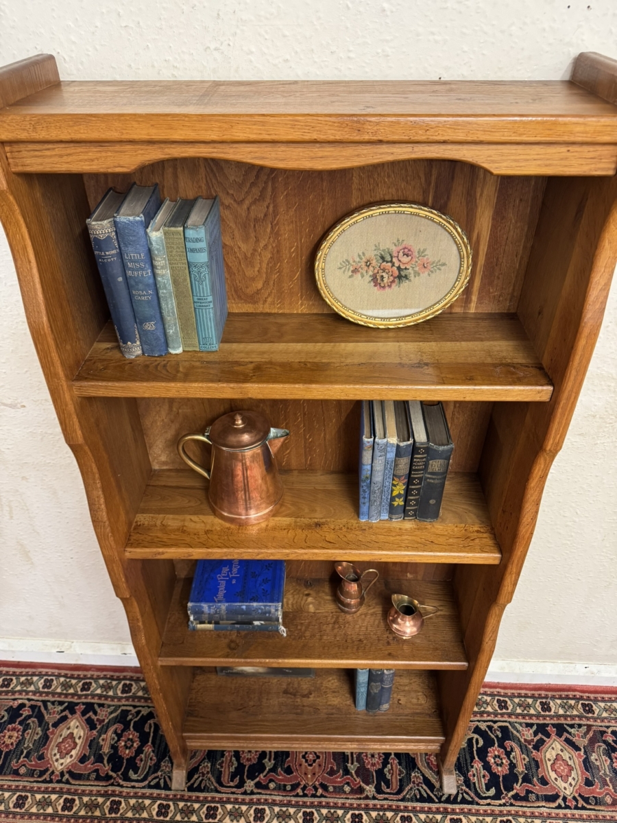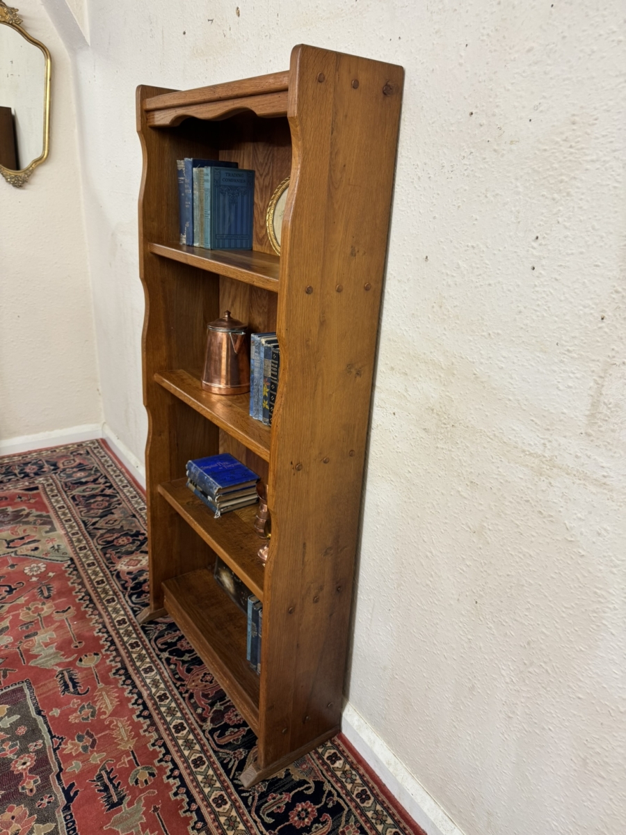 This super bookcase made in solid oak has a natural finish. with open fixed shelving slightly curved sides with visible dowels sitting on a sled foot. Please note we are also listing two matching bookcases (as pictured)