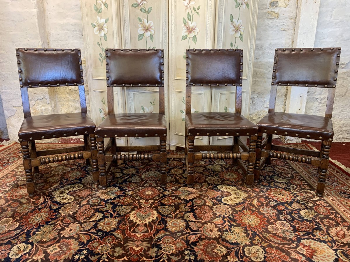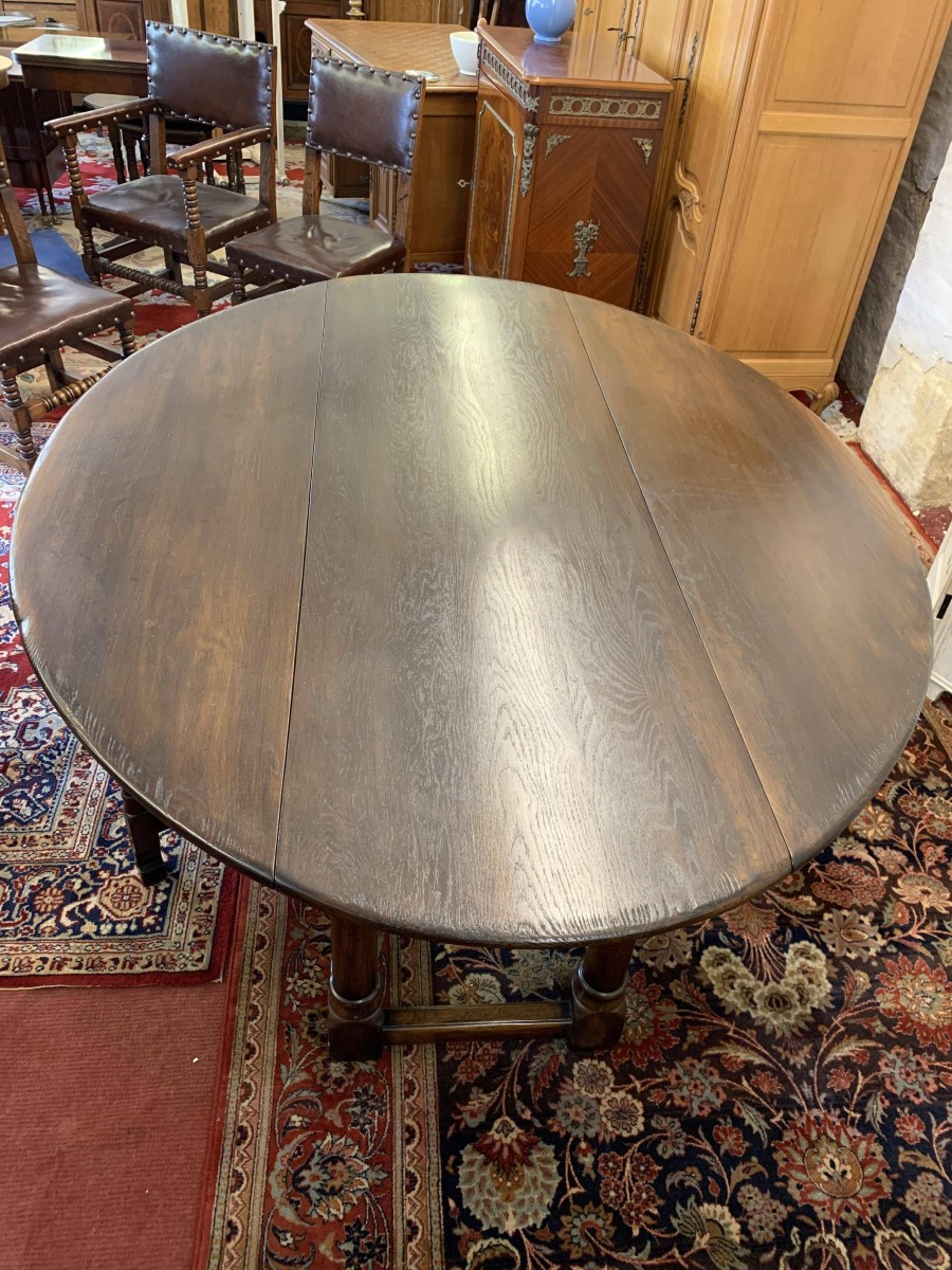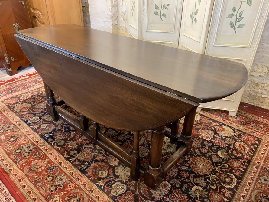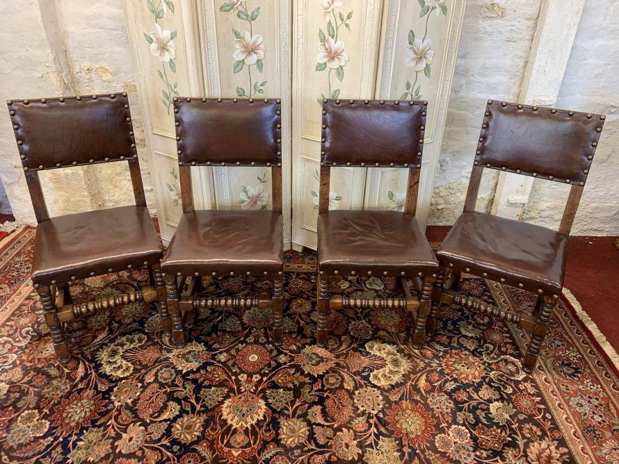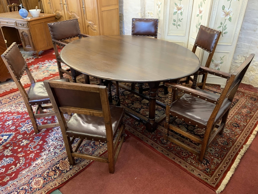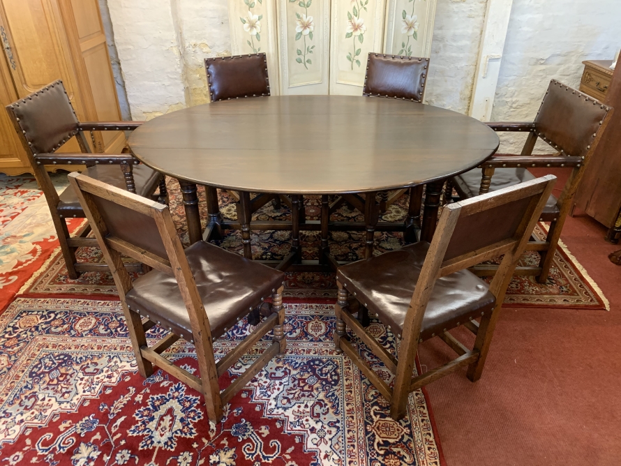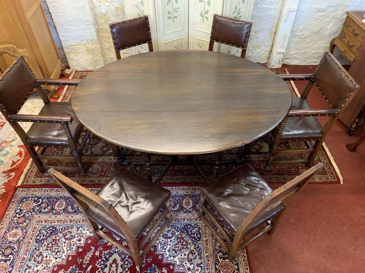 This fabulous quality oak table and chairs is in excellent condition. The extendable table has dropped leaves which when open are supported by two gate leg supports. The table has four turned legs. There are six matching chairs, four single chairs and two armchairs. Each chair having leather upholstered seat and back, decorative brass studding and four legs, the front pair being turned and stretcher supports.