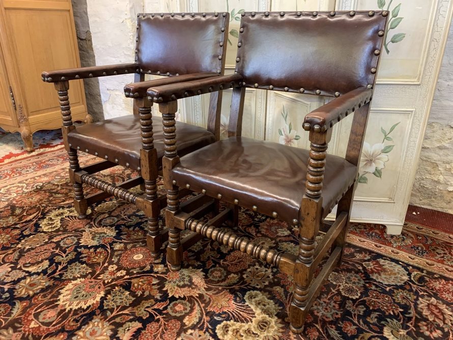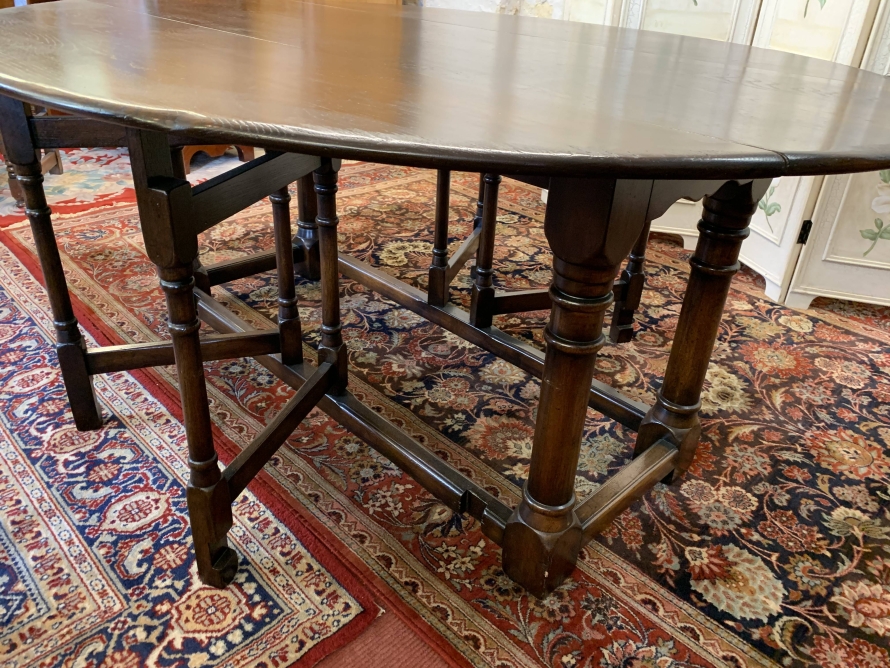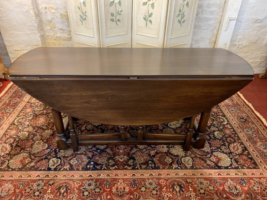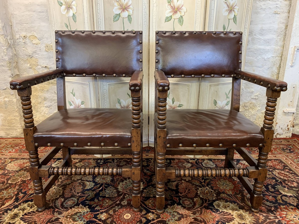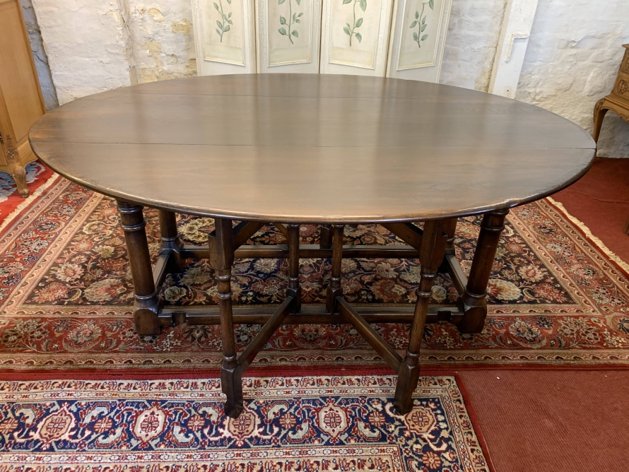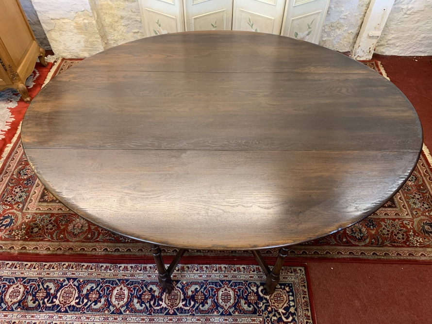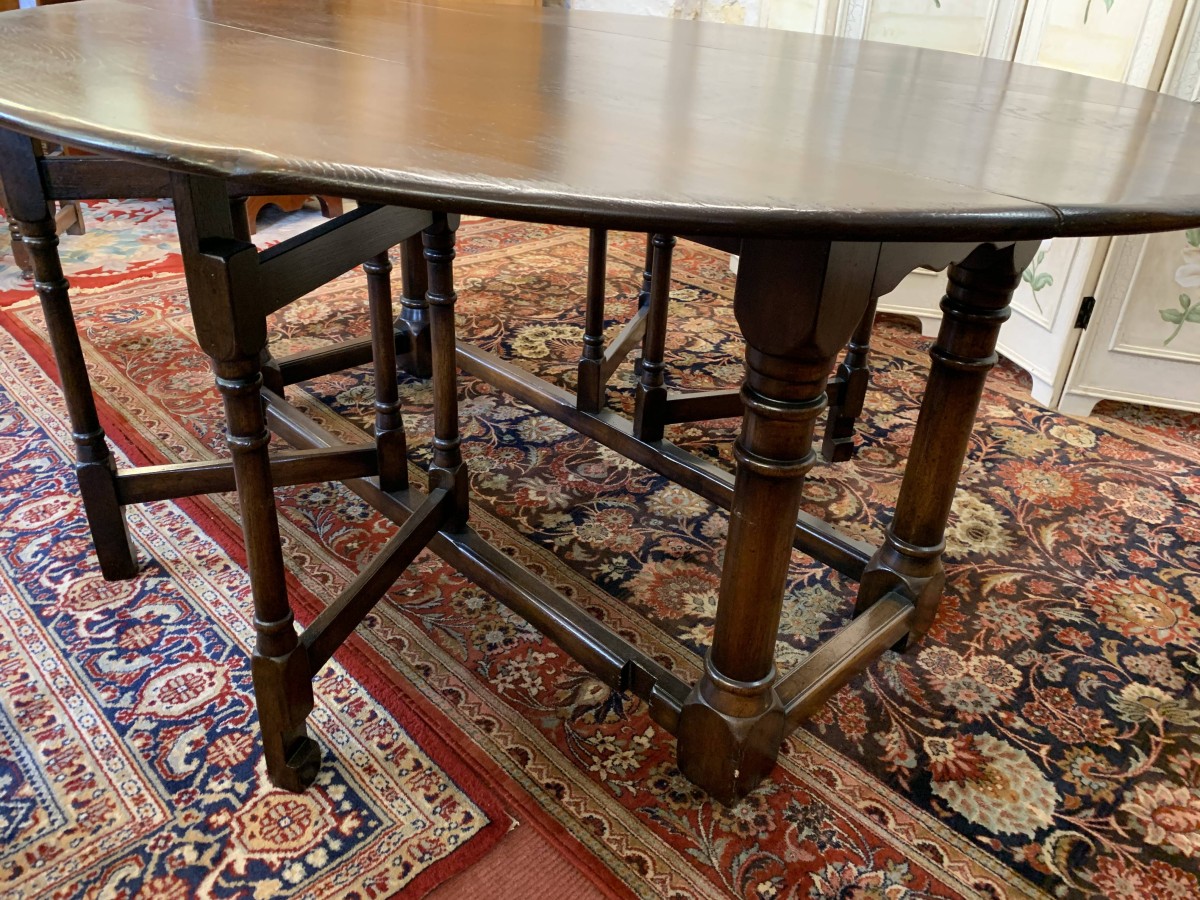 This fabulous quality oak table and chairs is in excellent condition. The extendable table has dropped leaves which when open are supported by two gate leg supports. The table has four turned legs. There are six matching chairs, four single chairs and two armchairs. Each chair having leather upholstered seat and back, decorative brass studding and four legs, the front pair being turned and stretcher supports.
