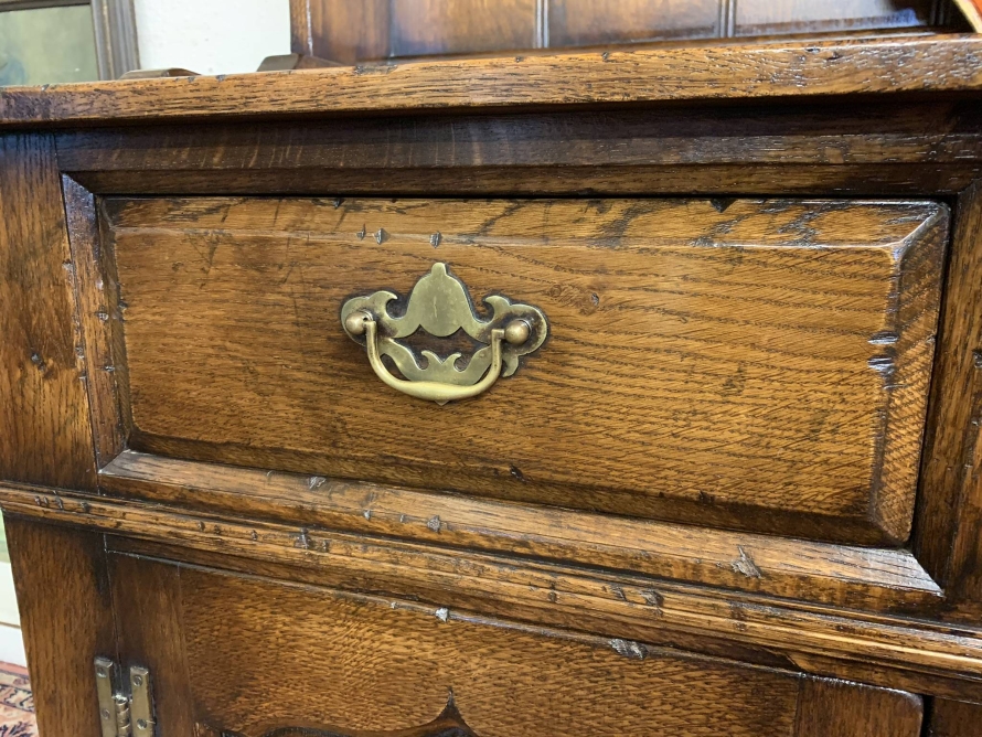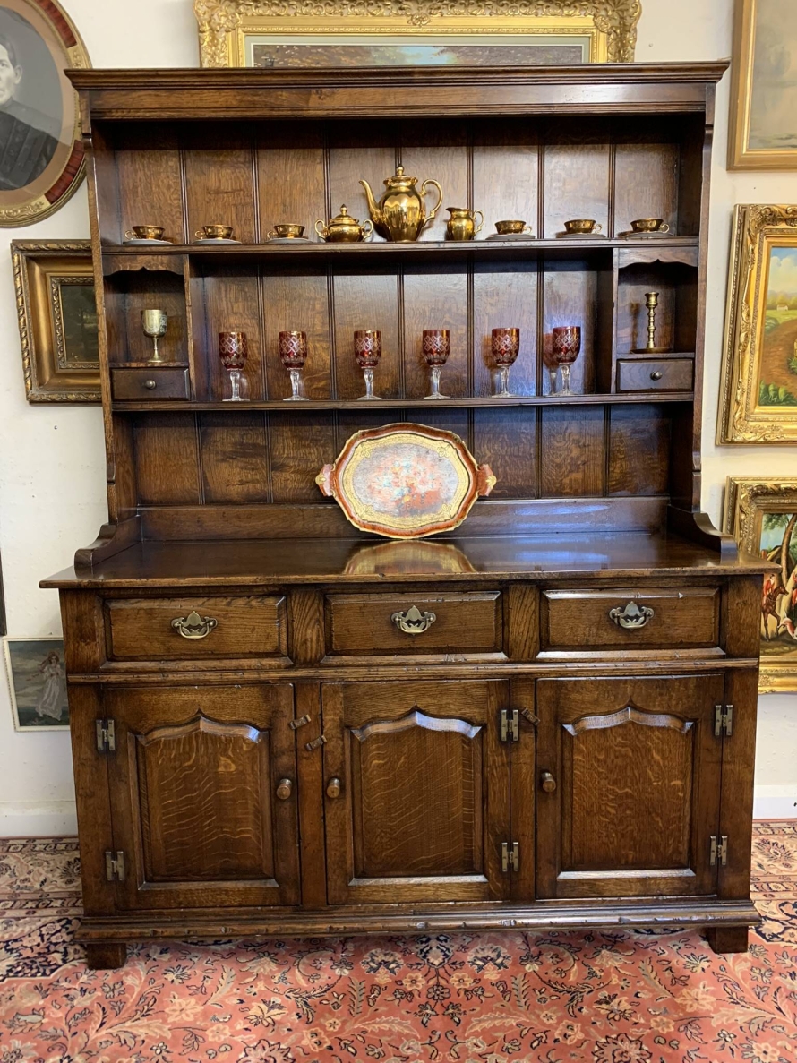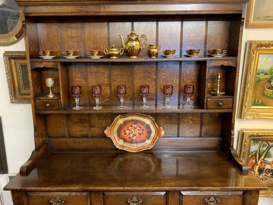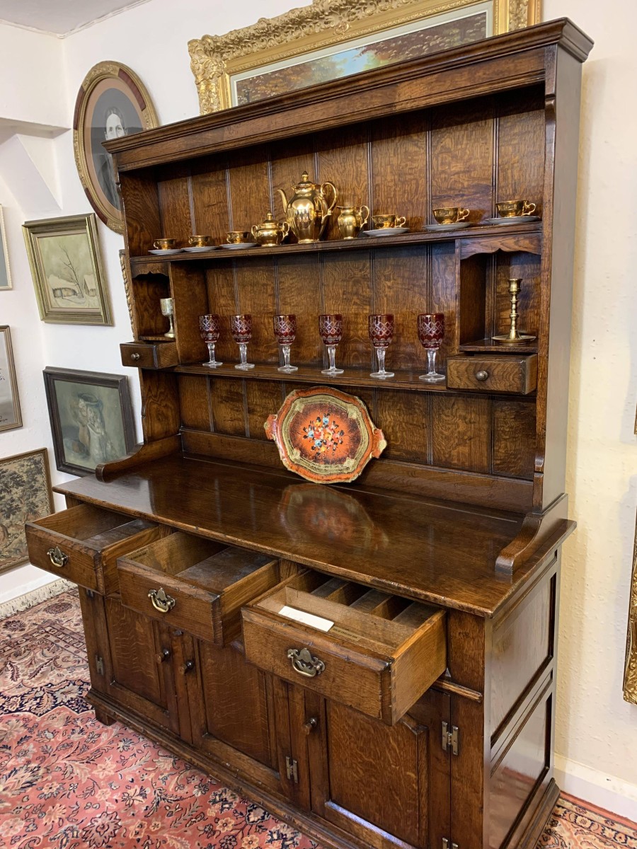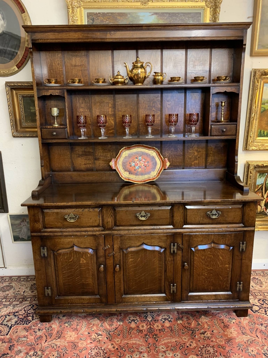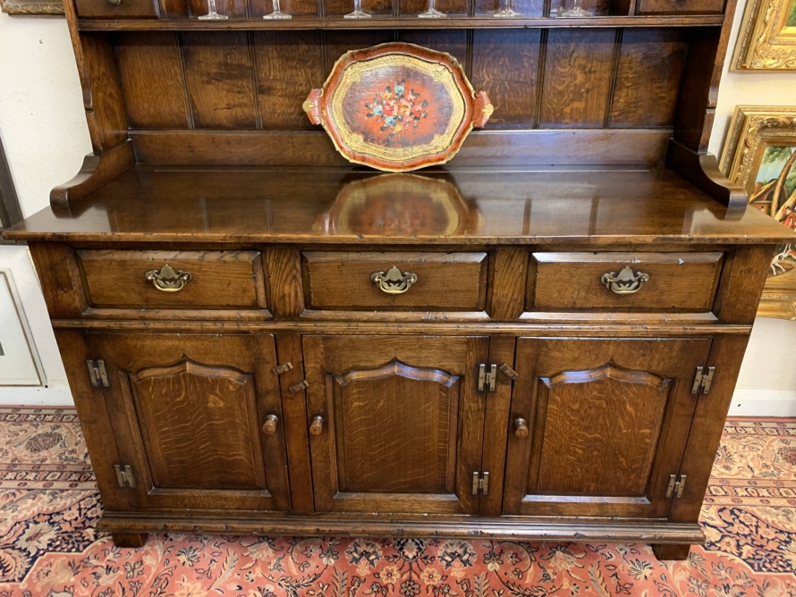 Made entirely in glorious solid oak this dresser with rack is in excellent condition. The rack has a boarded back, two shelves with two spice drawers , the base has an oversailing top which sits above three drawers, each drawer having decorative brass handle. Below are three shaped recessed panelled doors, the doors having traditional brass H hinges, turned knob handle and locking latch. The doors open to reveal a removable shelf above a boarded base. The dresser sits on traditional block feet.