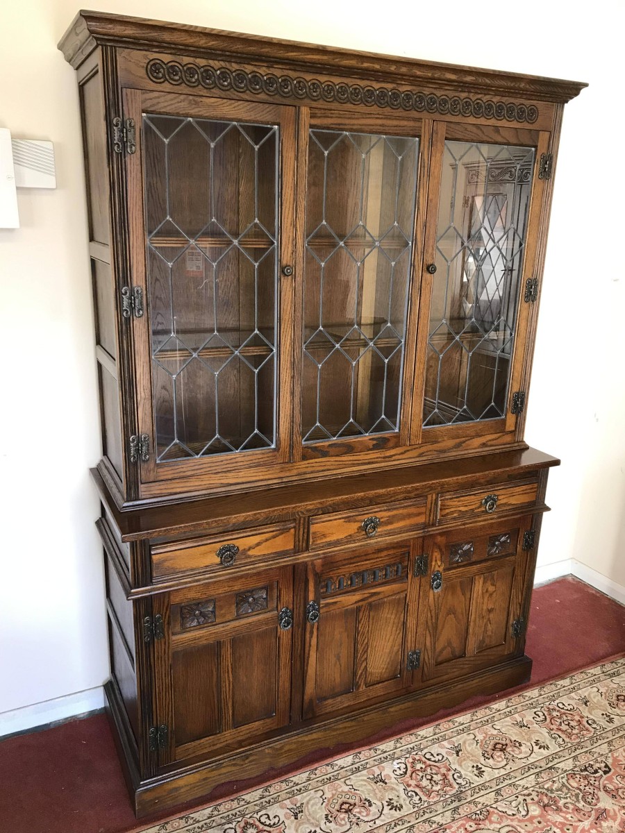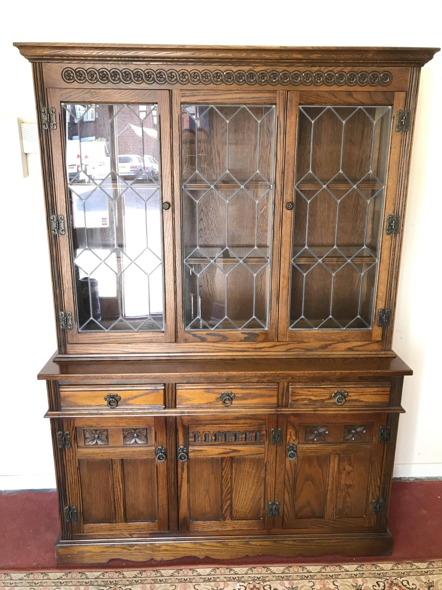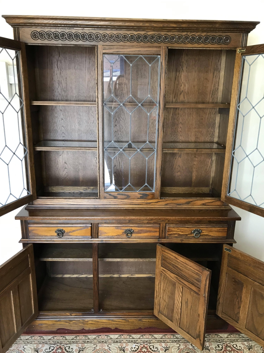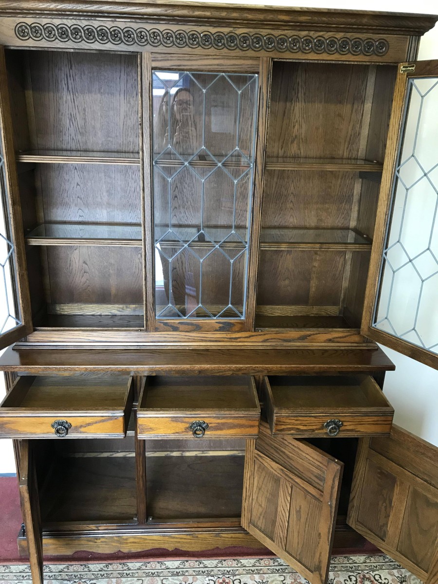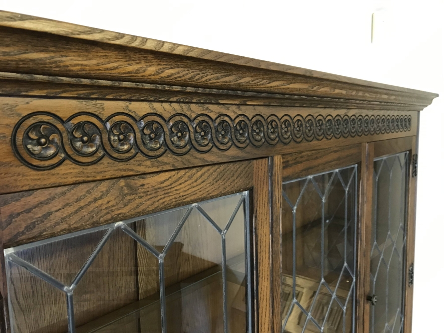 The oversailing top has decorative rose carving. Fixed central leaded window is flanked by a pair of leaded doors, each door has decorative hinges and brass knob handle. The doors open to reveal glass shelving. The base has three drawers above three recessed panelled carved oak doors. Each drawer and door has decorative ring pull handle. The doors open to reveal a fixed shelf. Recessed panelled sides and wavy apron to the front.