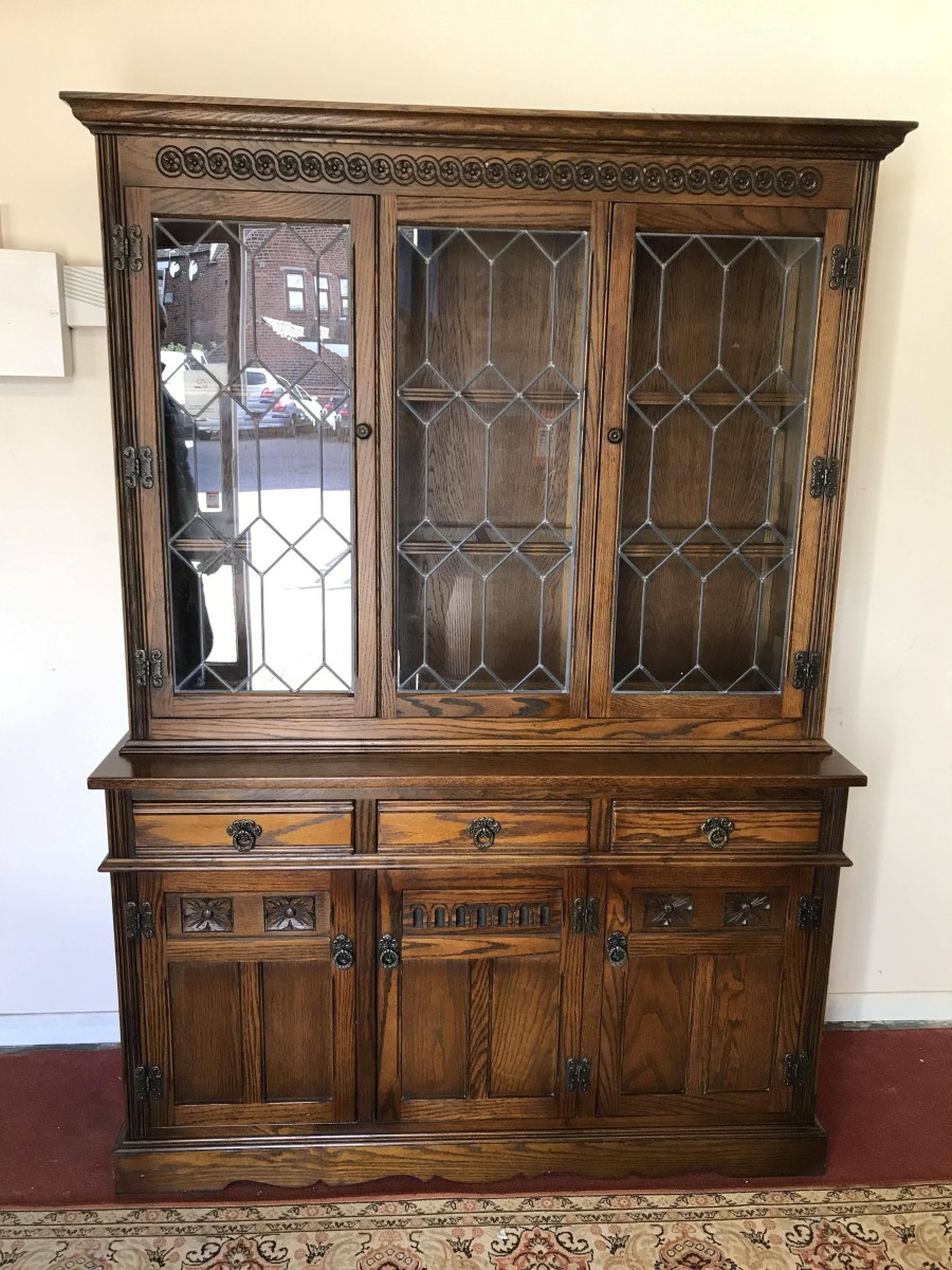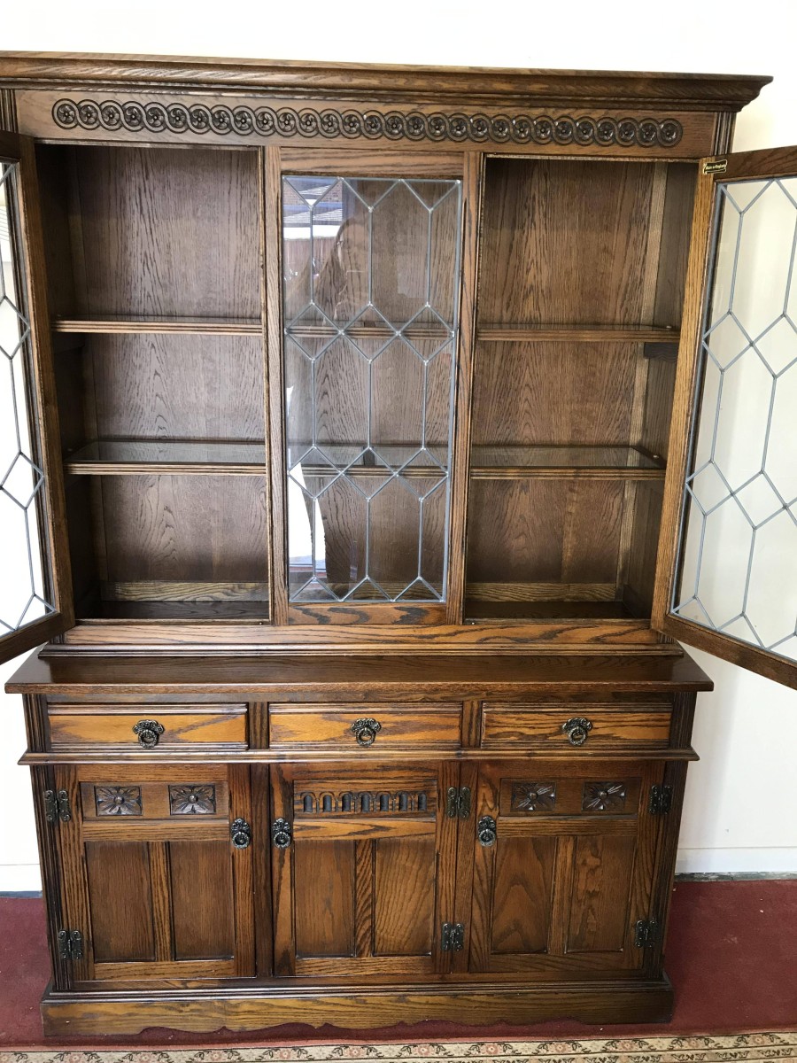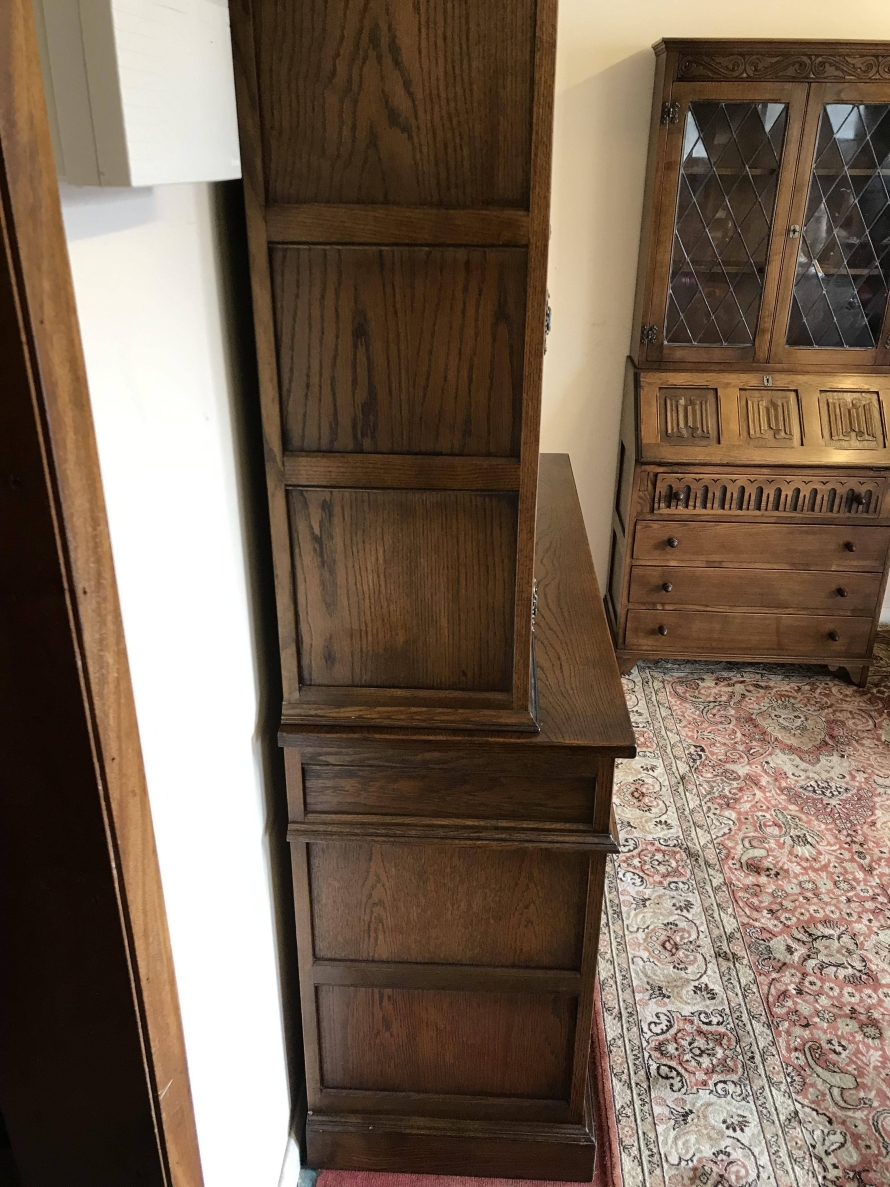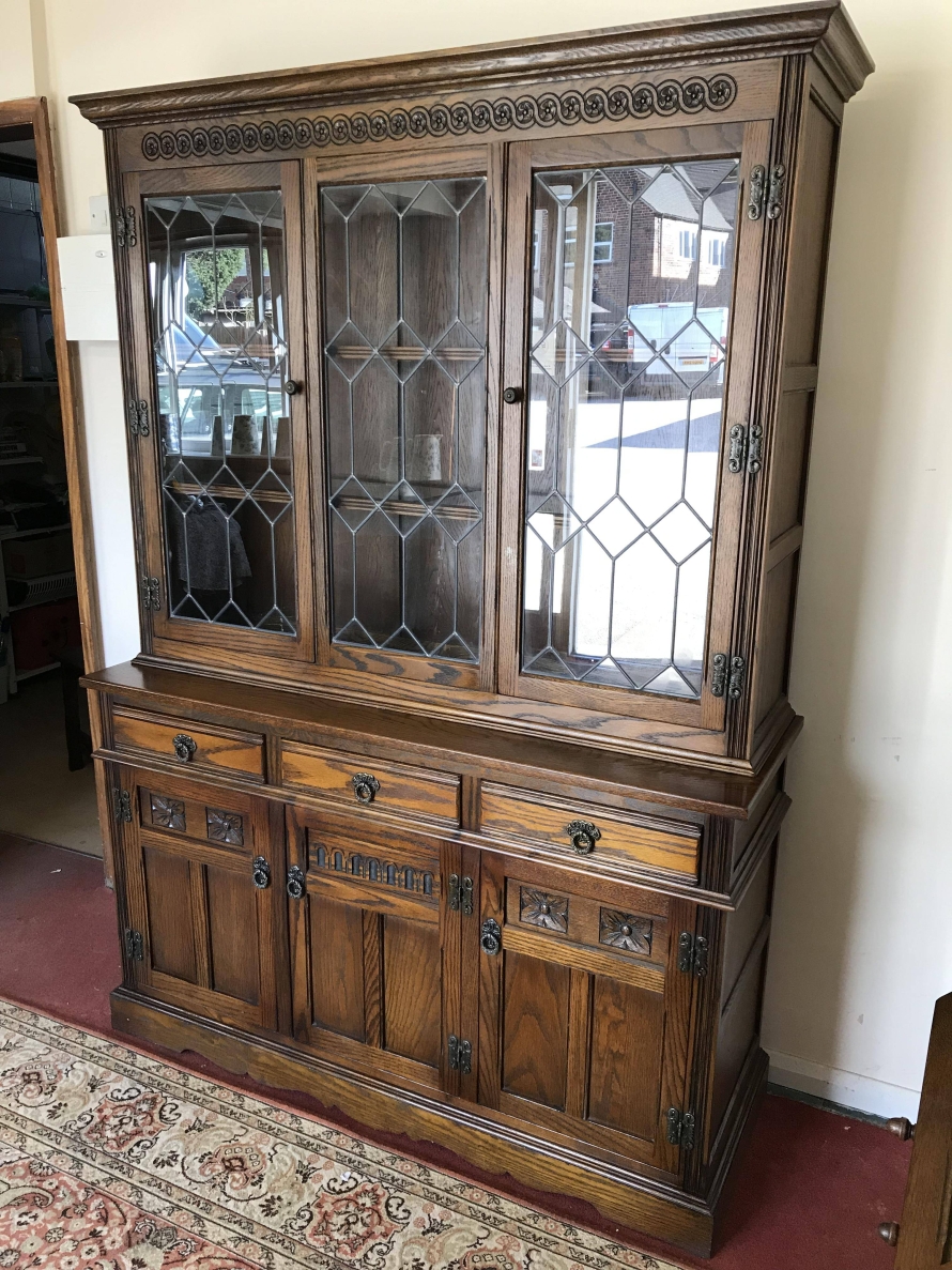 The oversailing top has decorative rose carving. Fixed central leaded window is flanked by a pair of leaded doors, each door has decorative hinges and brass knob handle. The doors open to reveal glass shelving. The base has three drawers above three recessed panelled carved oak doors. Each drawer and door has decorative ring pull handle. The doors open to reveal a fixed shelf. Recessed panelled sides and wavy apron to the front.