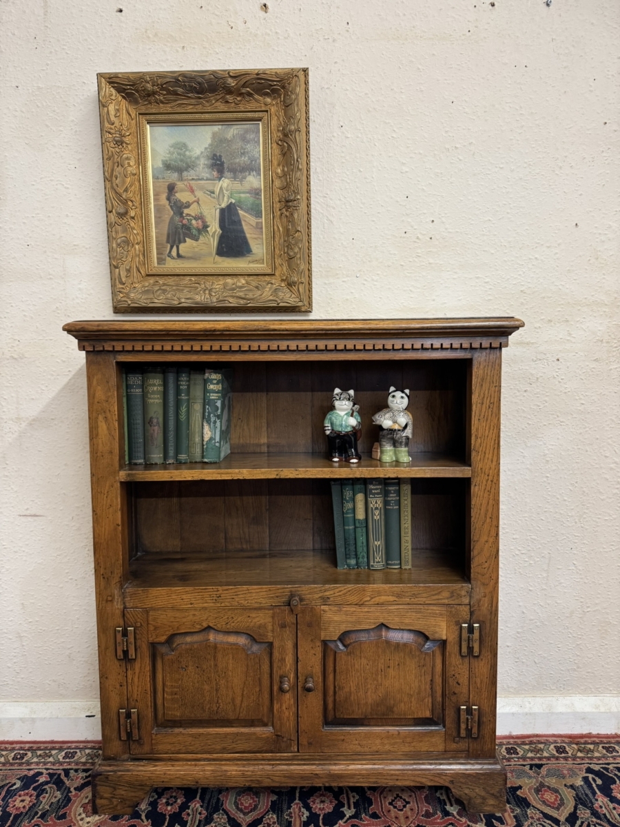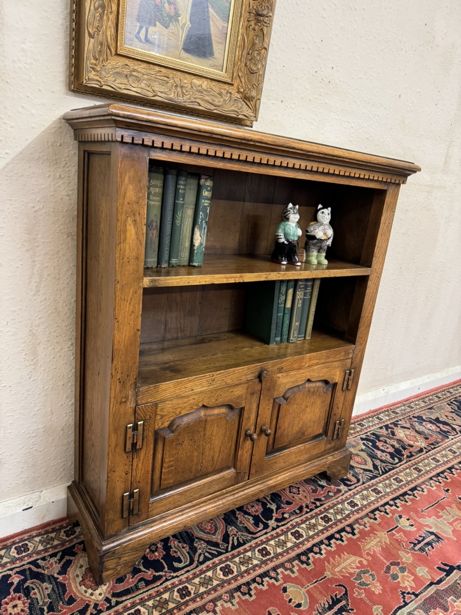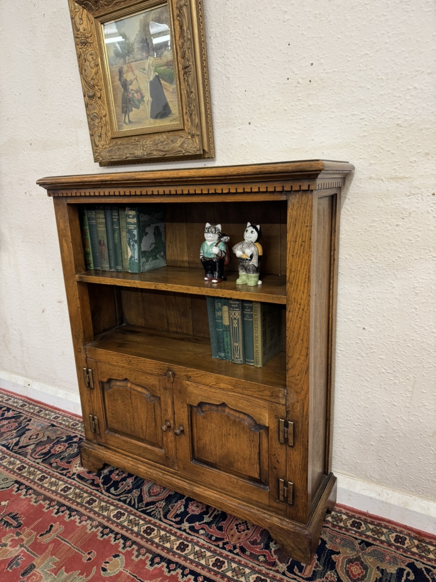 This great bookcase is made in solid oak. The over sailing top sits above an open section, boarded back and oak shelf, below are a pair of fielded panelled lockable doors, each door having brass H hinges, wooden handle and wooden locking latch. The doors open to reveal storage space. The bookcase stands on bracket feet.