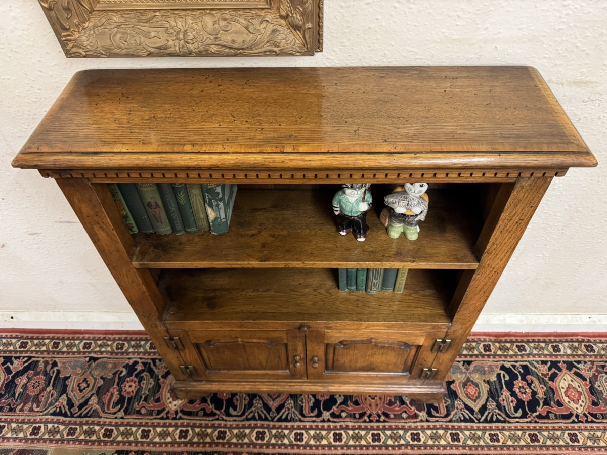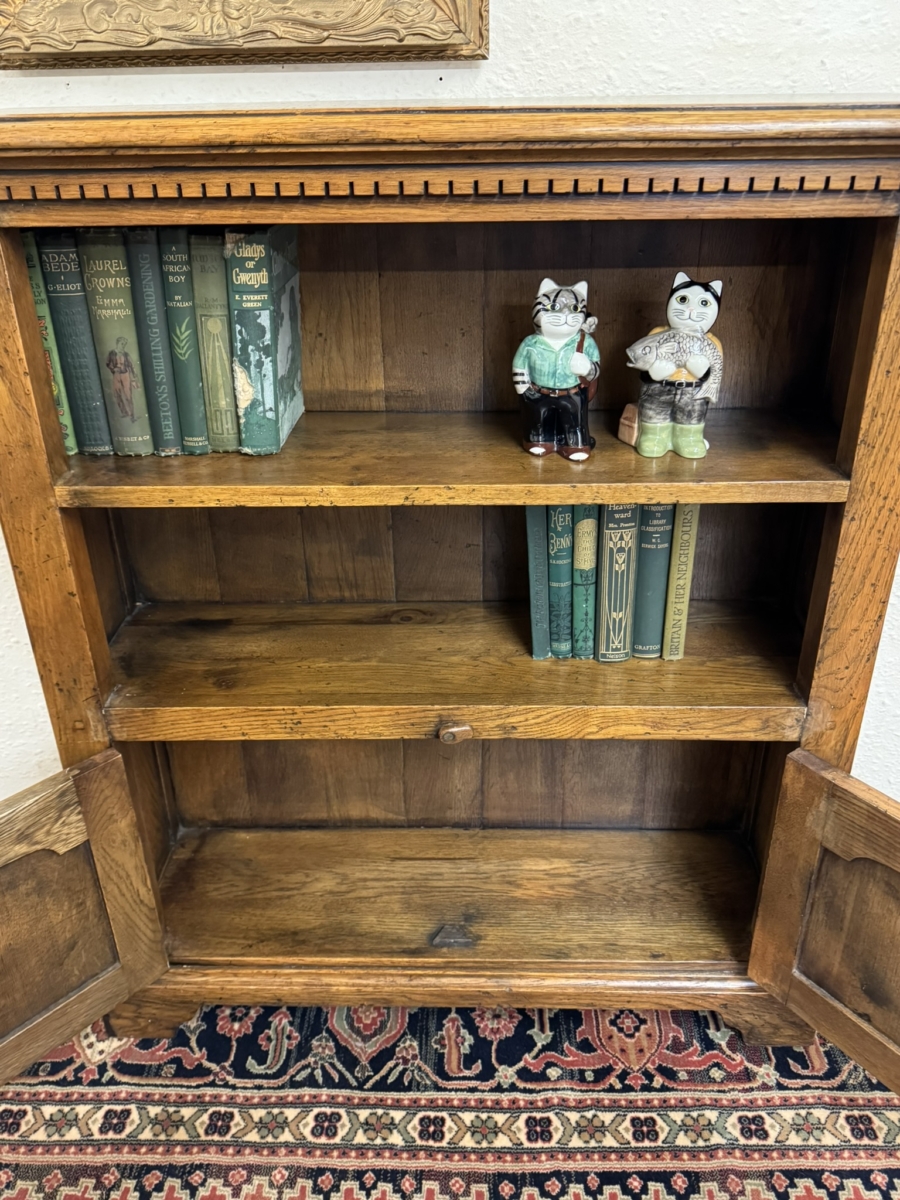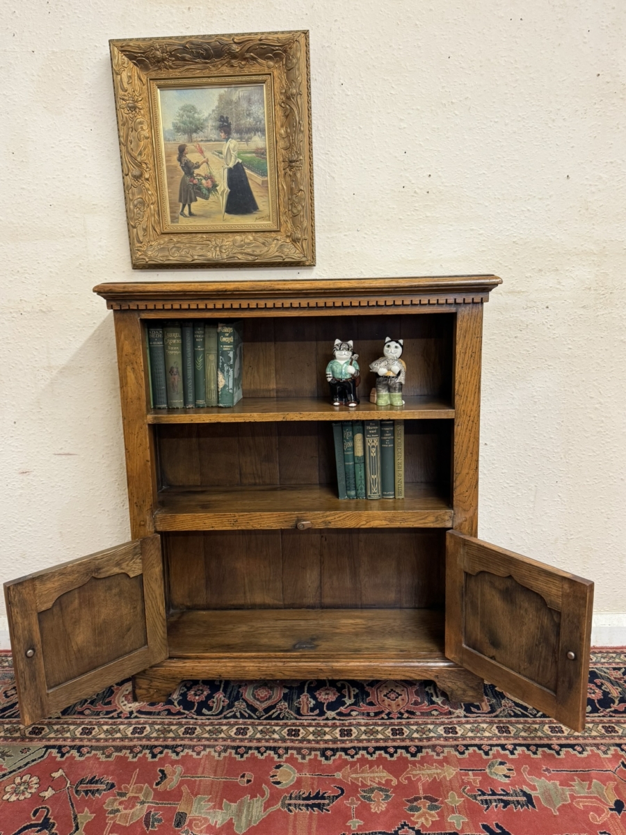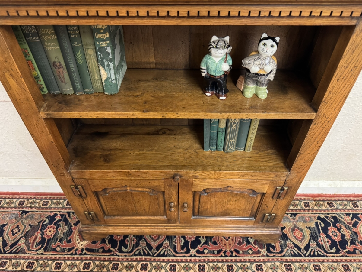 This great bookcase is made in solid oak. The over sailing top sits above an open section, boarded back and oak shelf, below are a pair of fielded panelled lockable doors, each door having brass H hinges, wooden handle and wooden locking latch. The doors open to reveal storage space. The bookcase stands on bracket feet.
