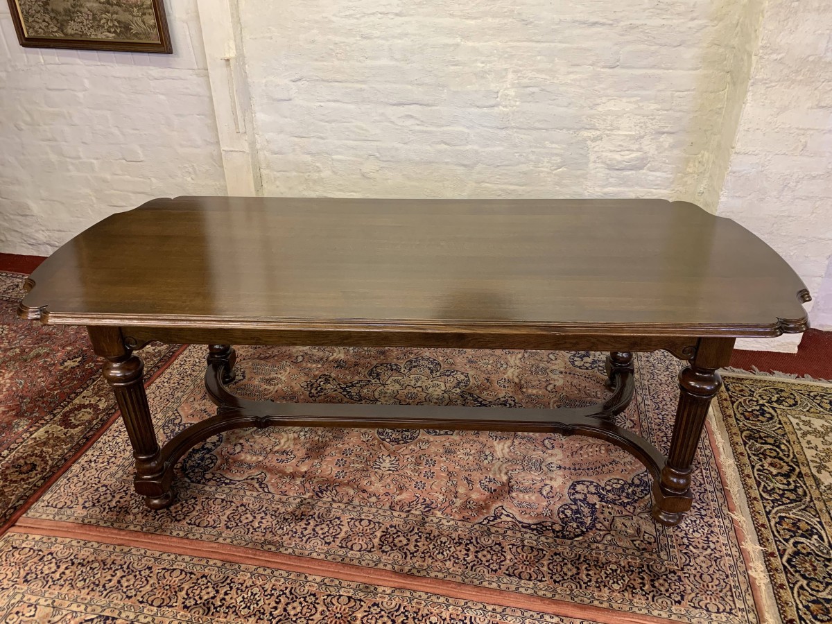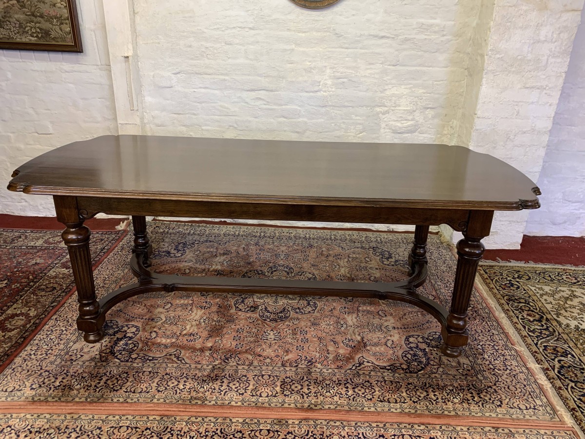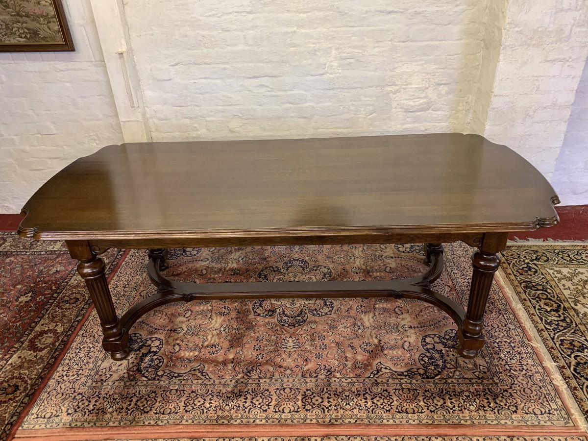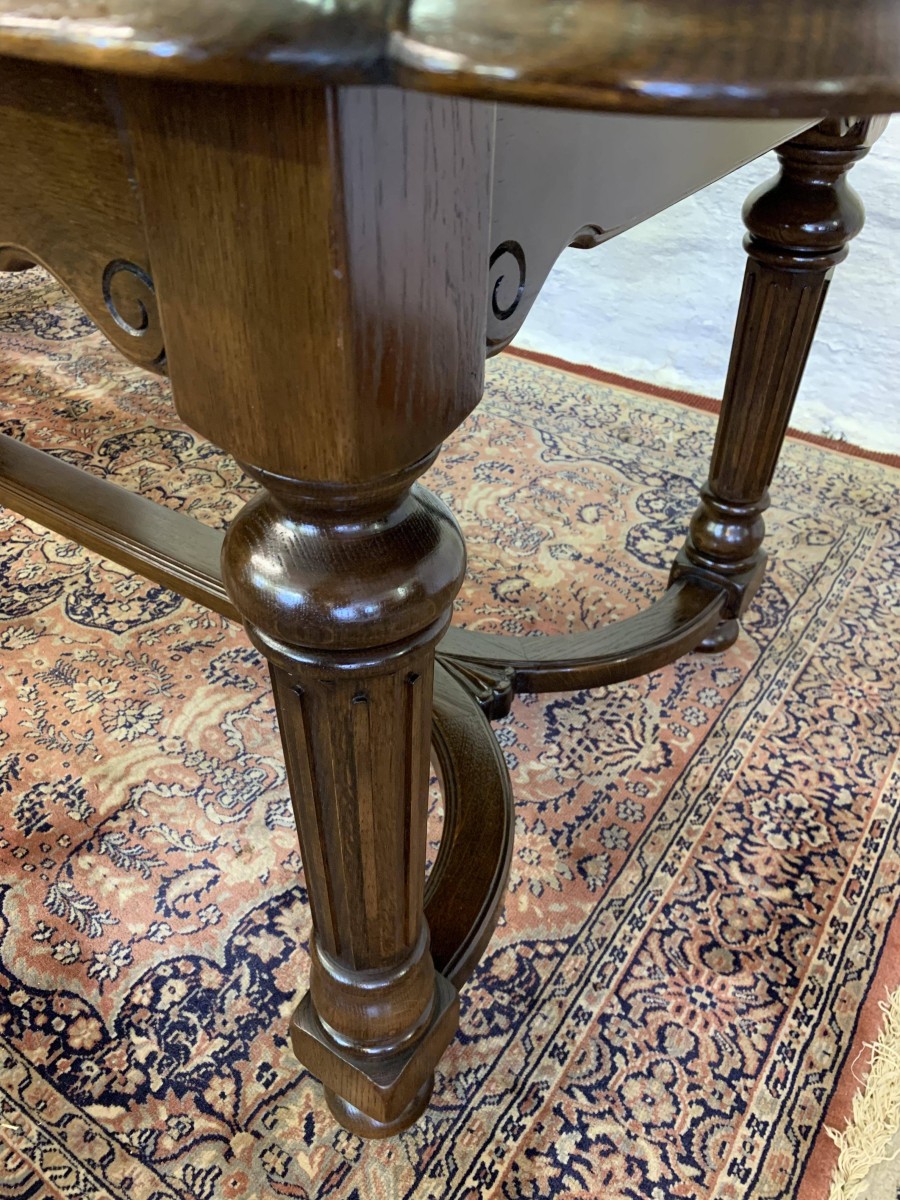 Table is made in solid oak. The top is shaped at both ends, with four turned and reeded legs, shaped carved supports this fabulous quality table stands on four turned bun feet.
