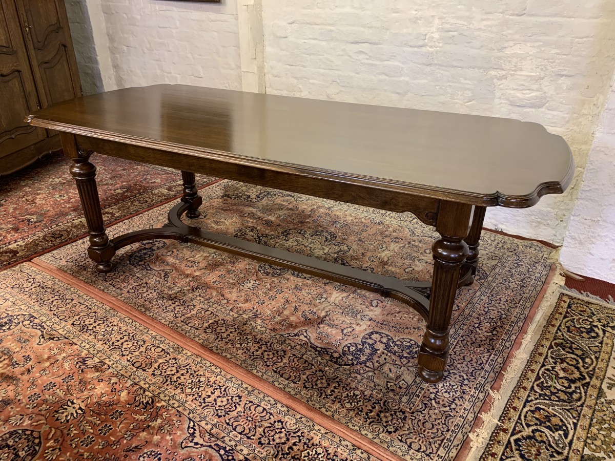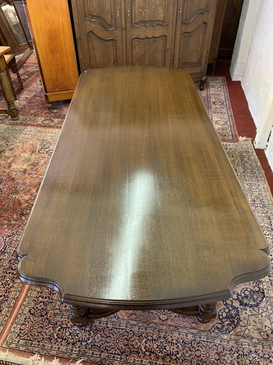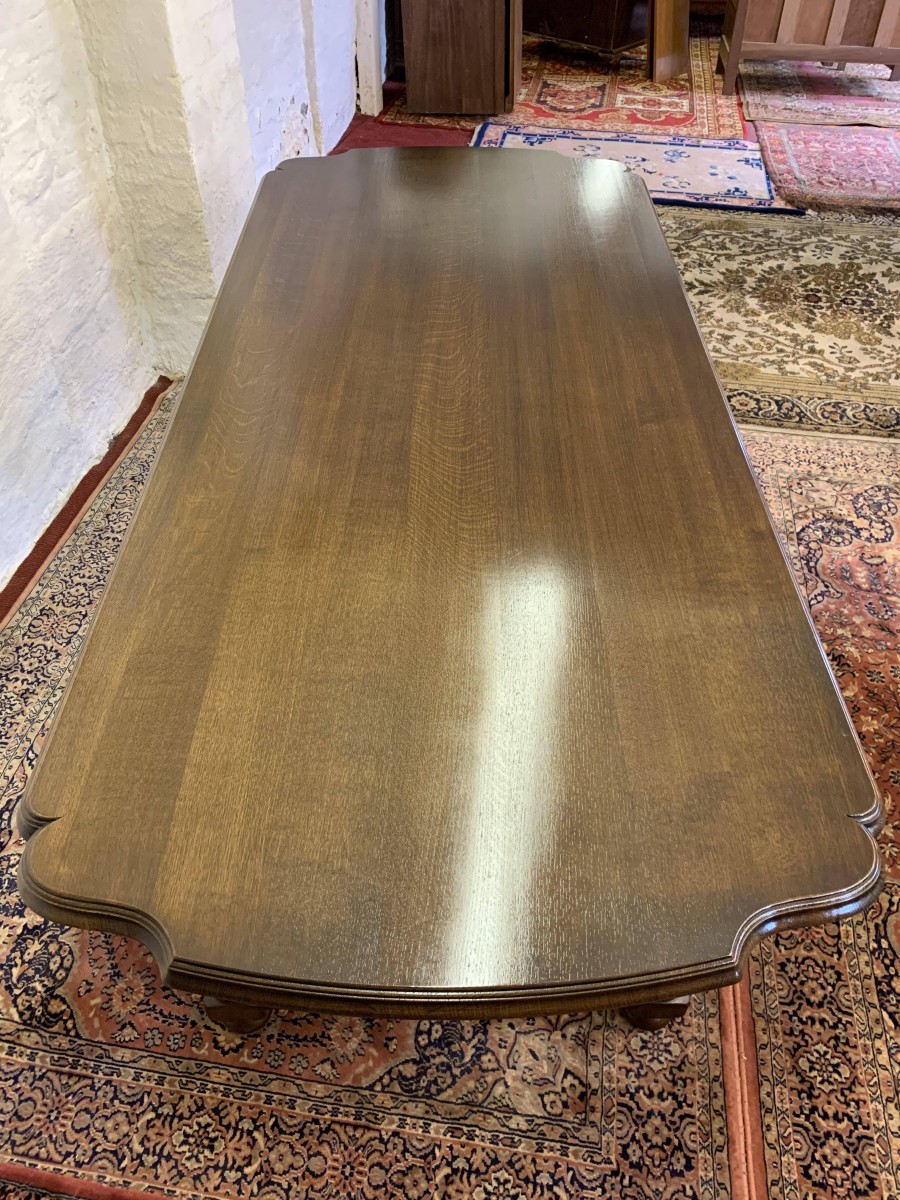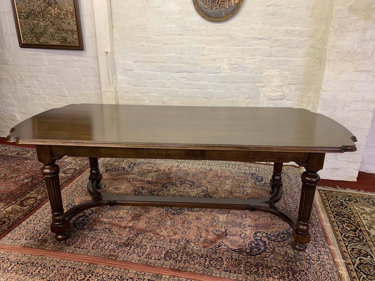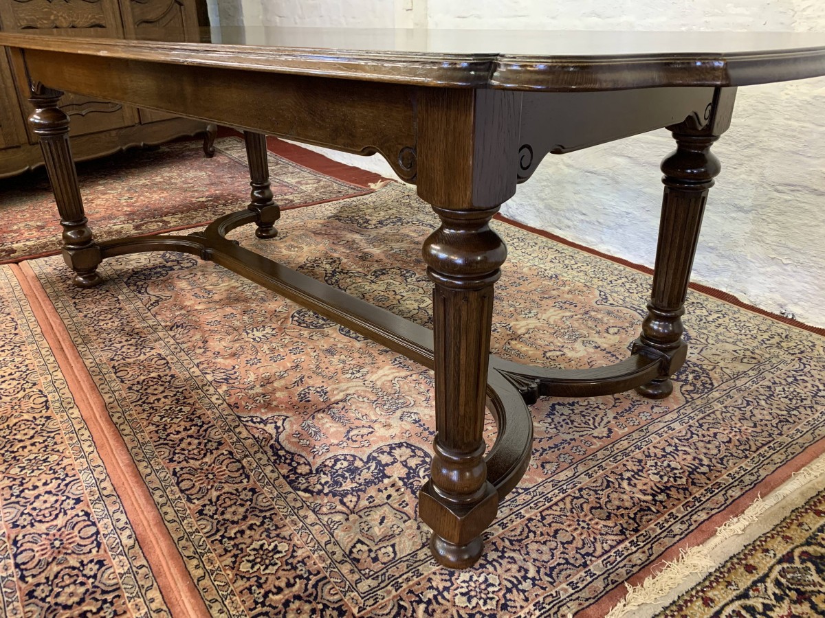 Table is made in solid oak. The top is shaped at both ends, with four turned and reeded legs, shaped carved supports this fabulous quality table stands on four turned bun feet.