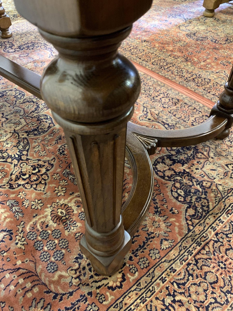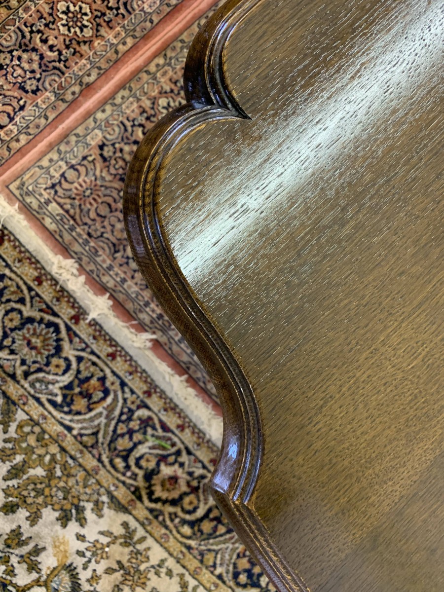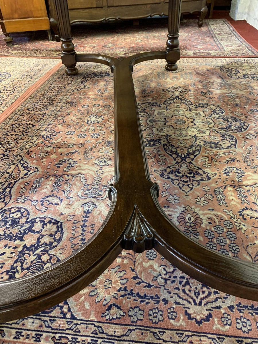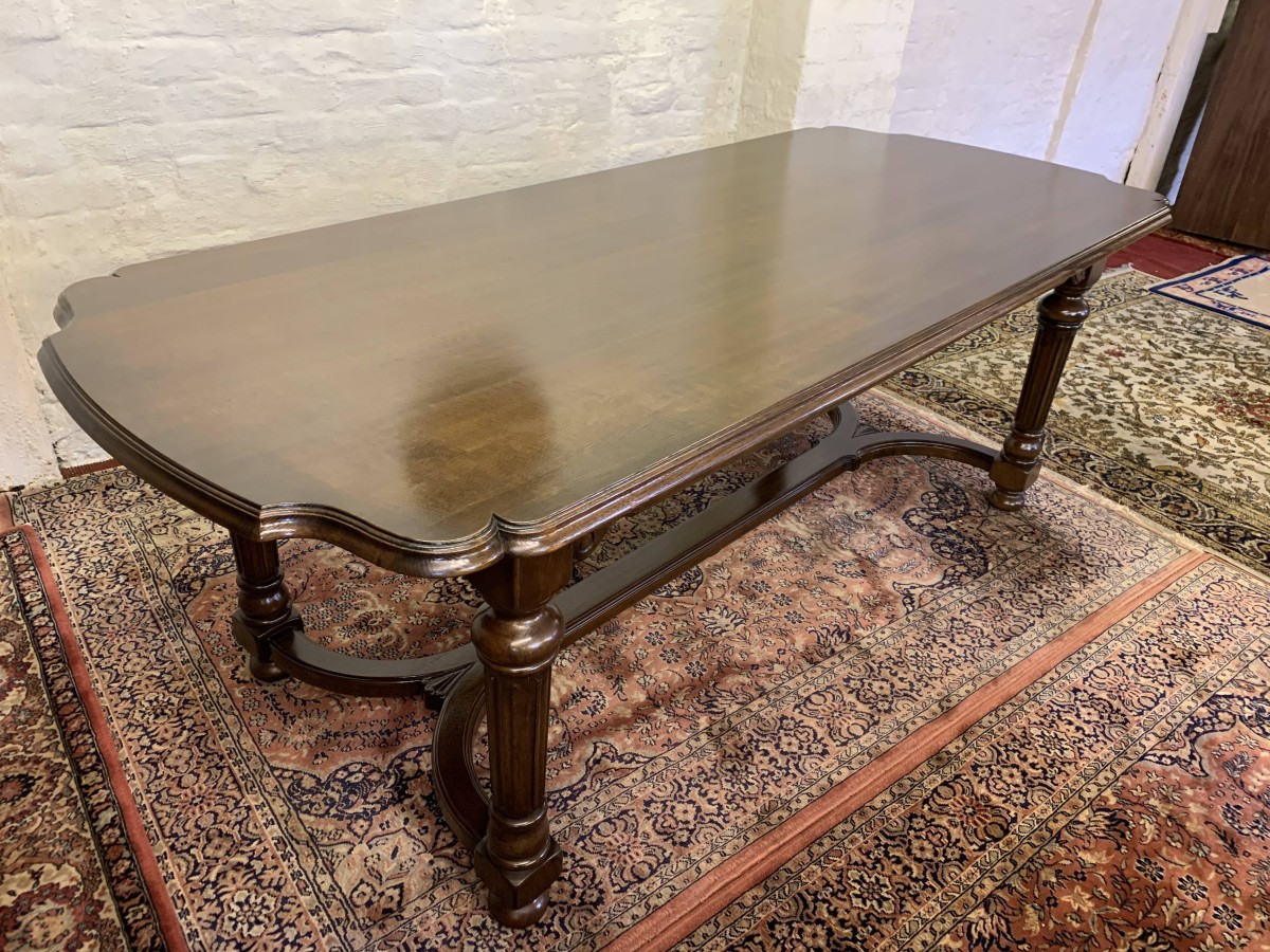 Table is made in solid oak. The top is shaped at both ends, with four turned and reeded legs, shaped carved supports this fabulous quality table stands on four turned bun feet.