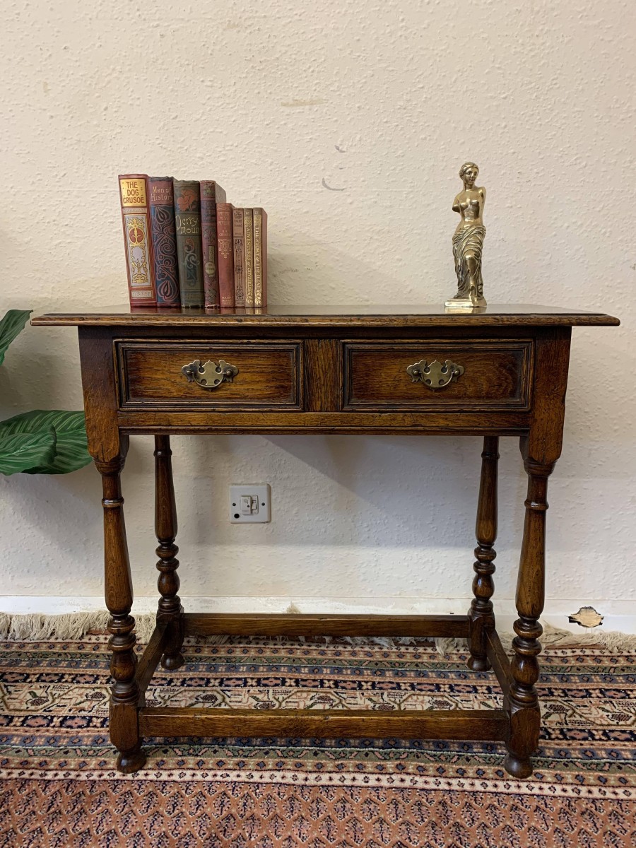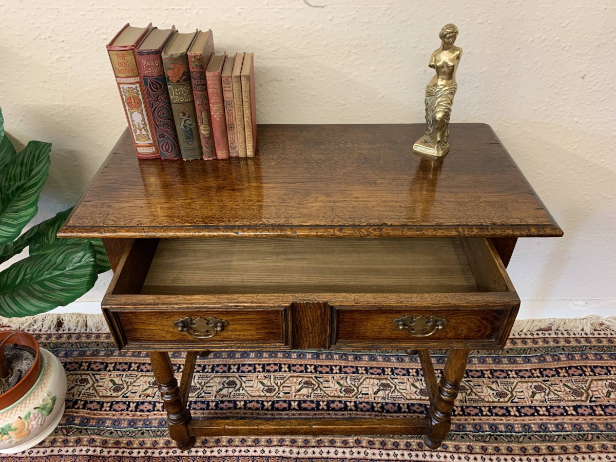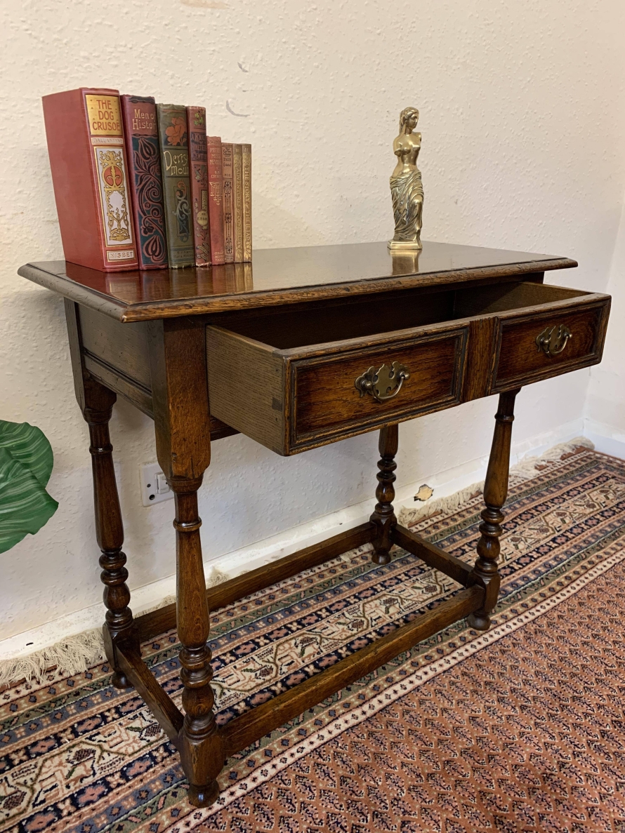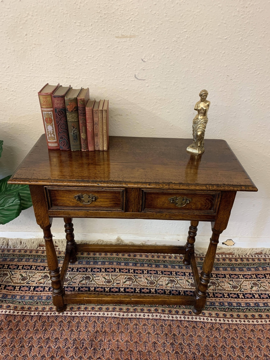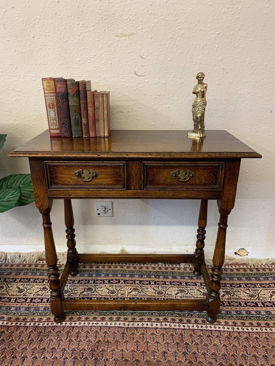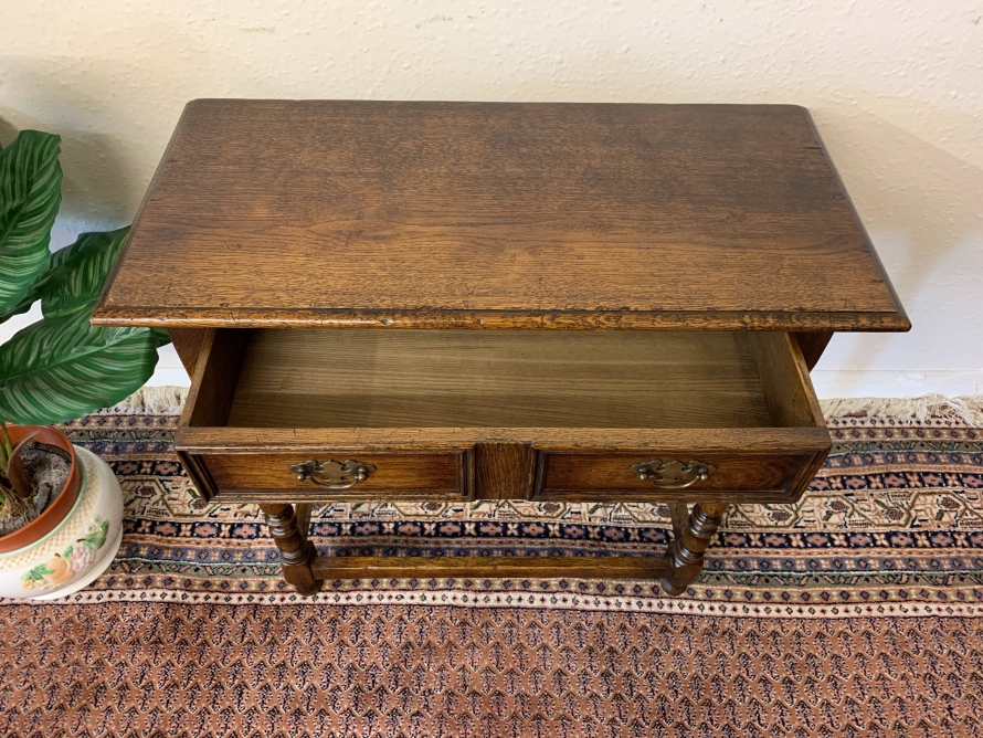 This gorgeous side table is made entirely of solid oak, the patina of the oak is striking. The oversailing top sits above a single drawer, the drawer having a pair of brass handles. Four fabulous turned legs supported by wonderful stretchers.