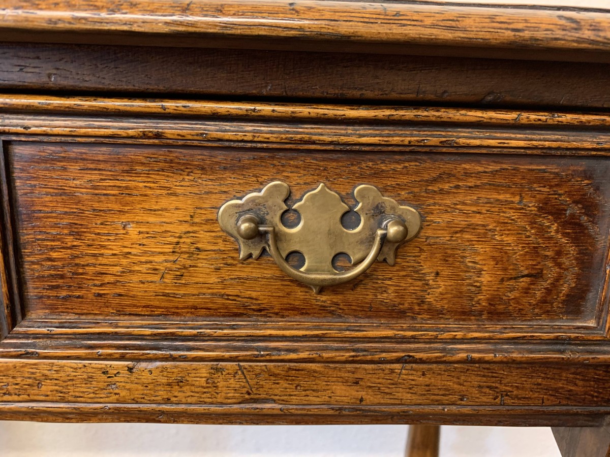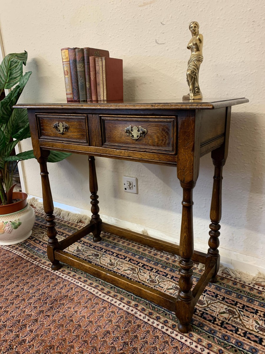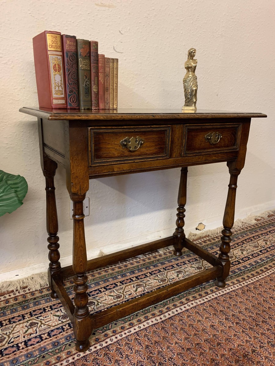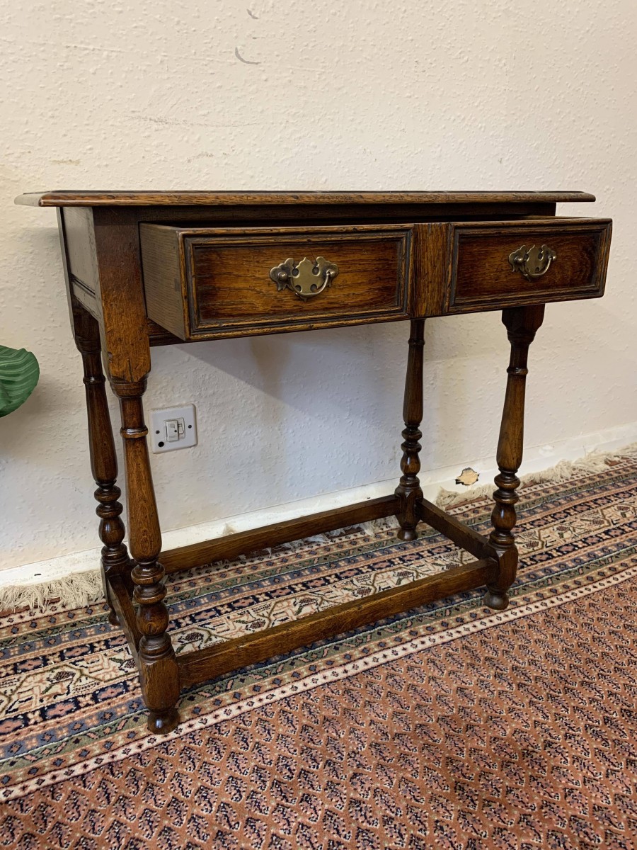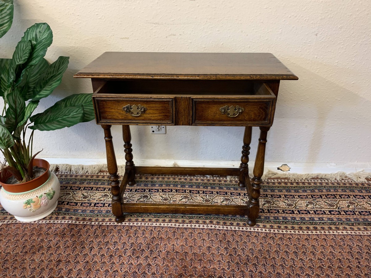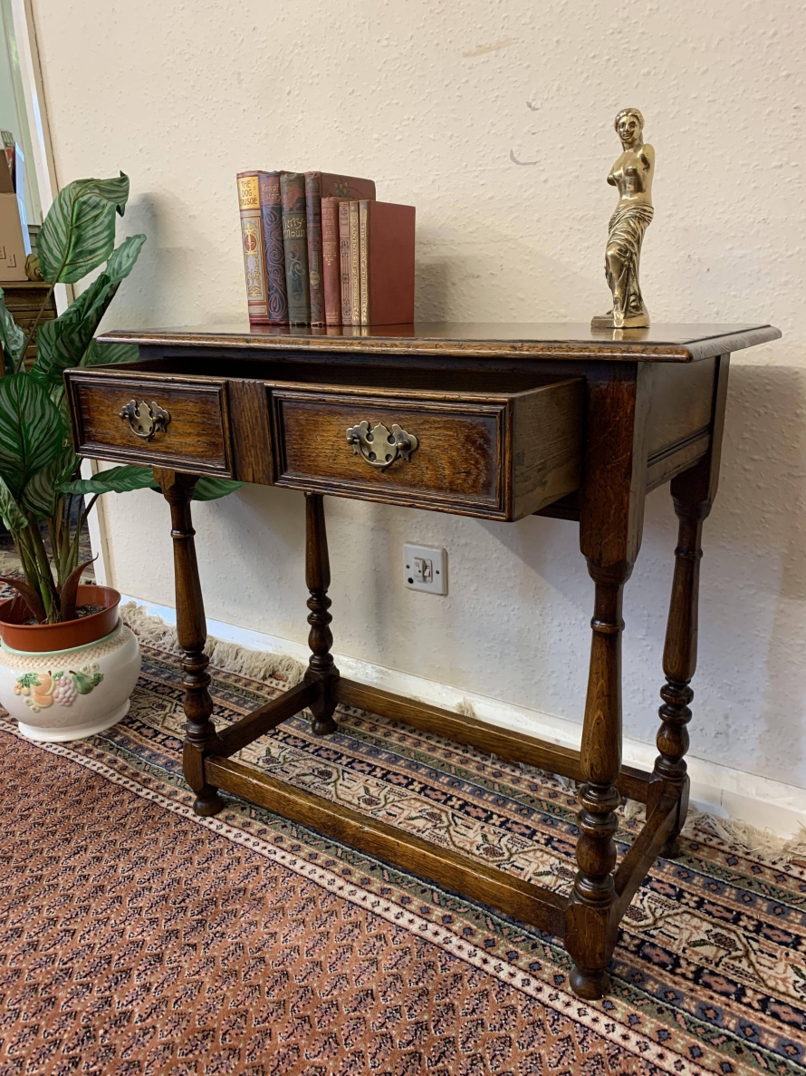 This gorgeous side table is made entirely of solid oak, the patina of the oak is striking. The oversailing top sits above a single drawer, the drawer having a pair of brass handles. Four fabulous turned legs supported by wonderful stretchers.