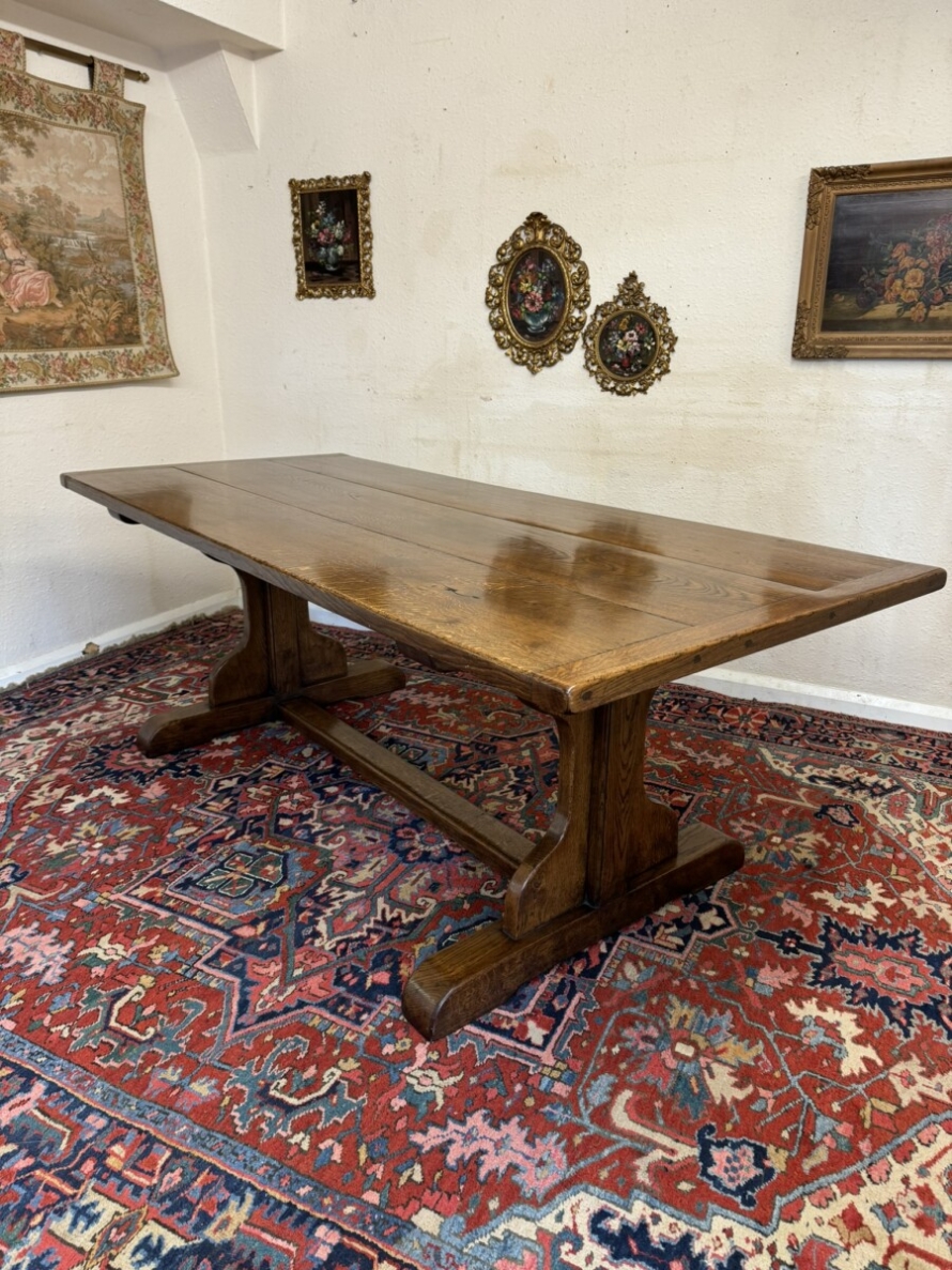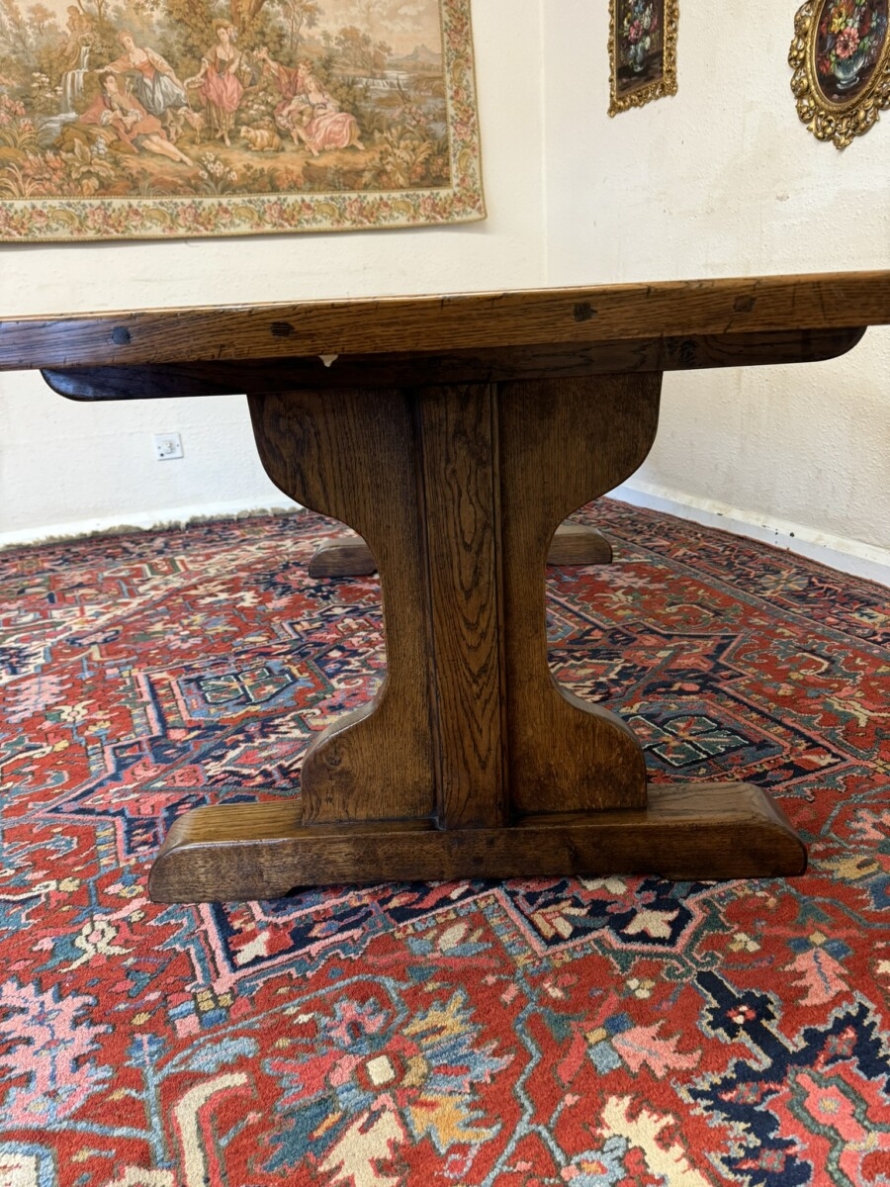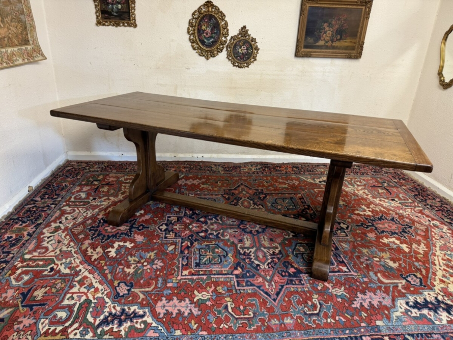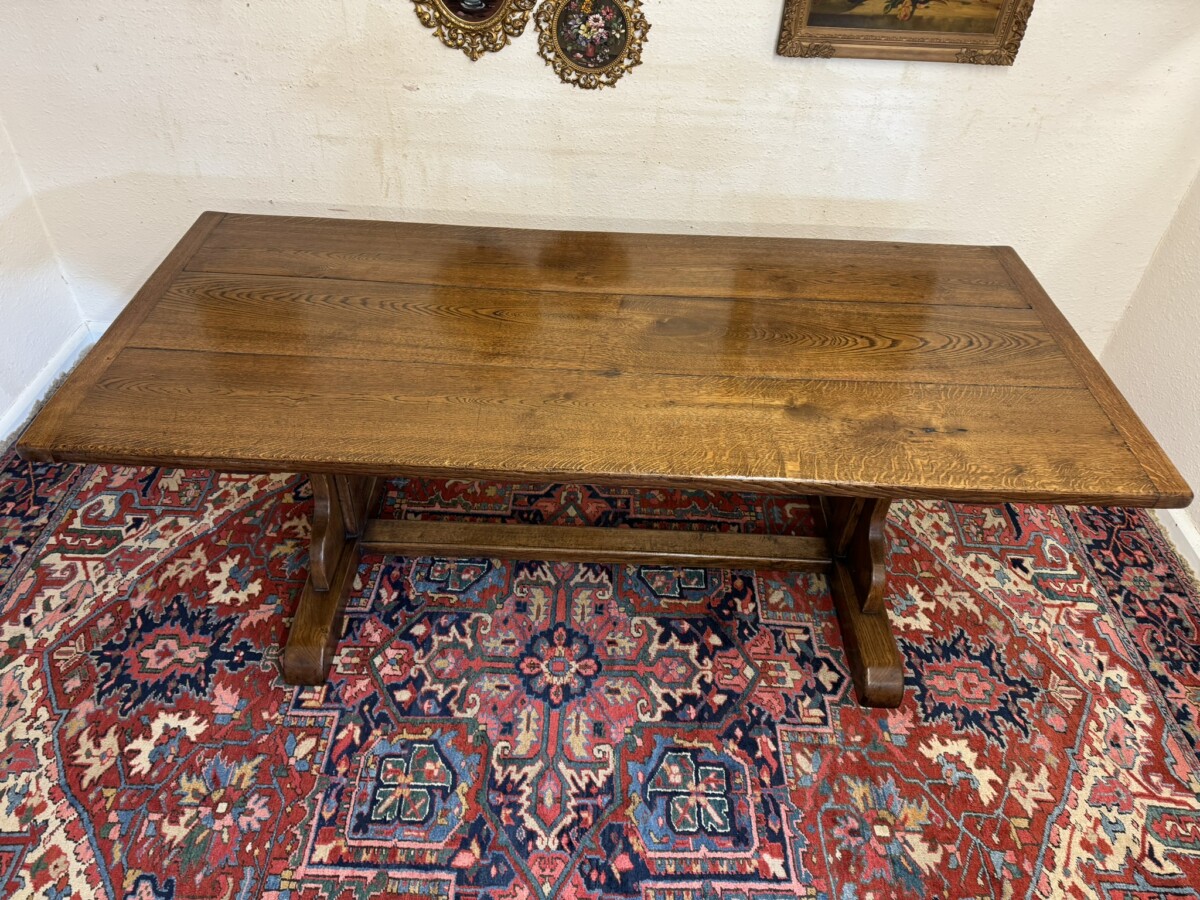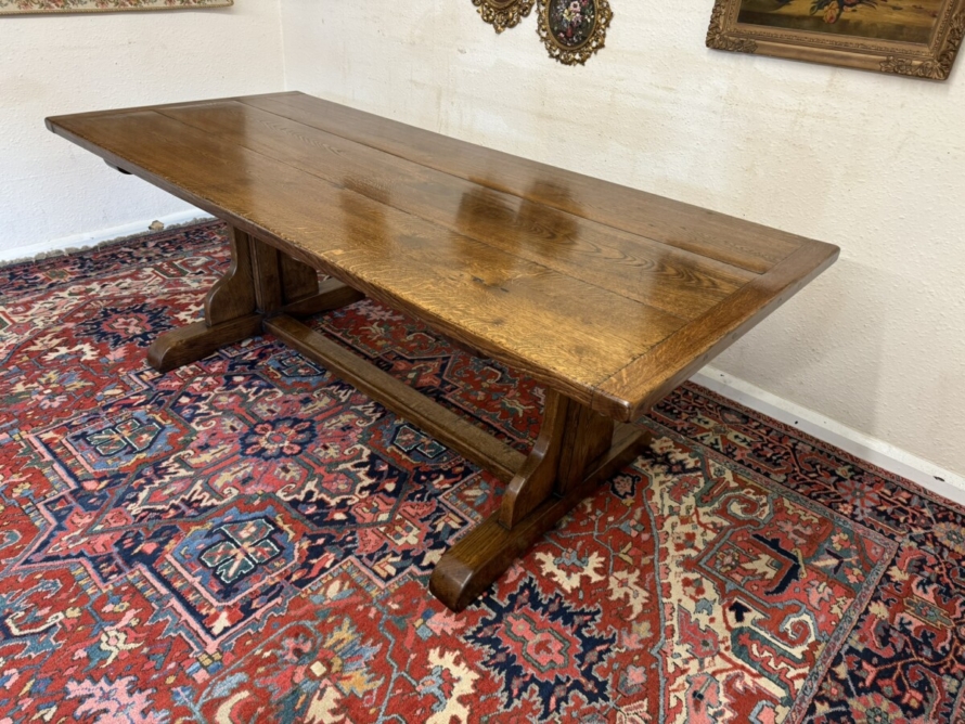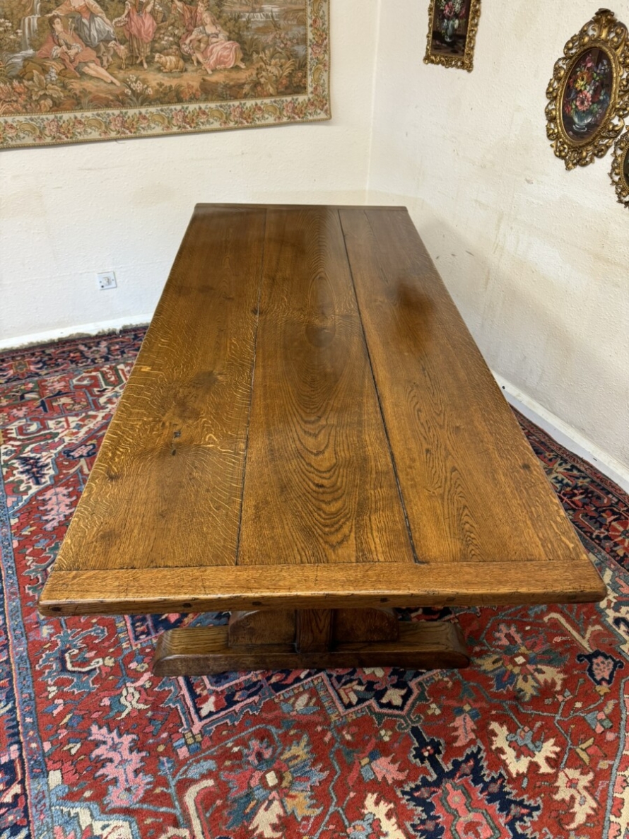 The table is made entirely in solid oak. The three planked thick top sits on a slab ended base with stretcher support.