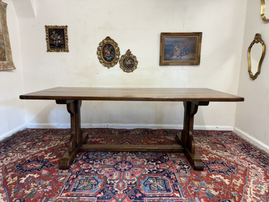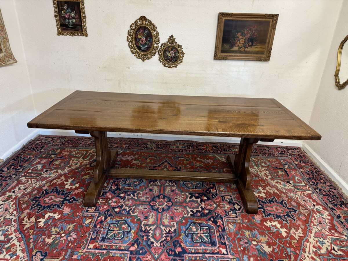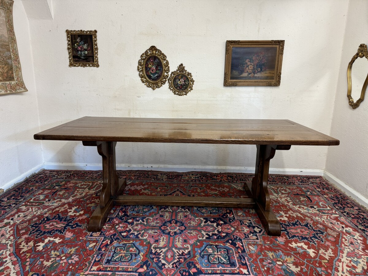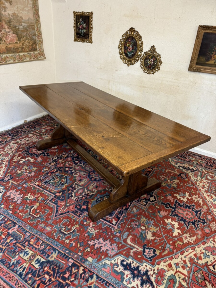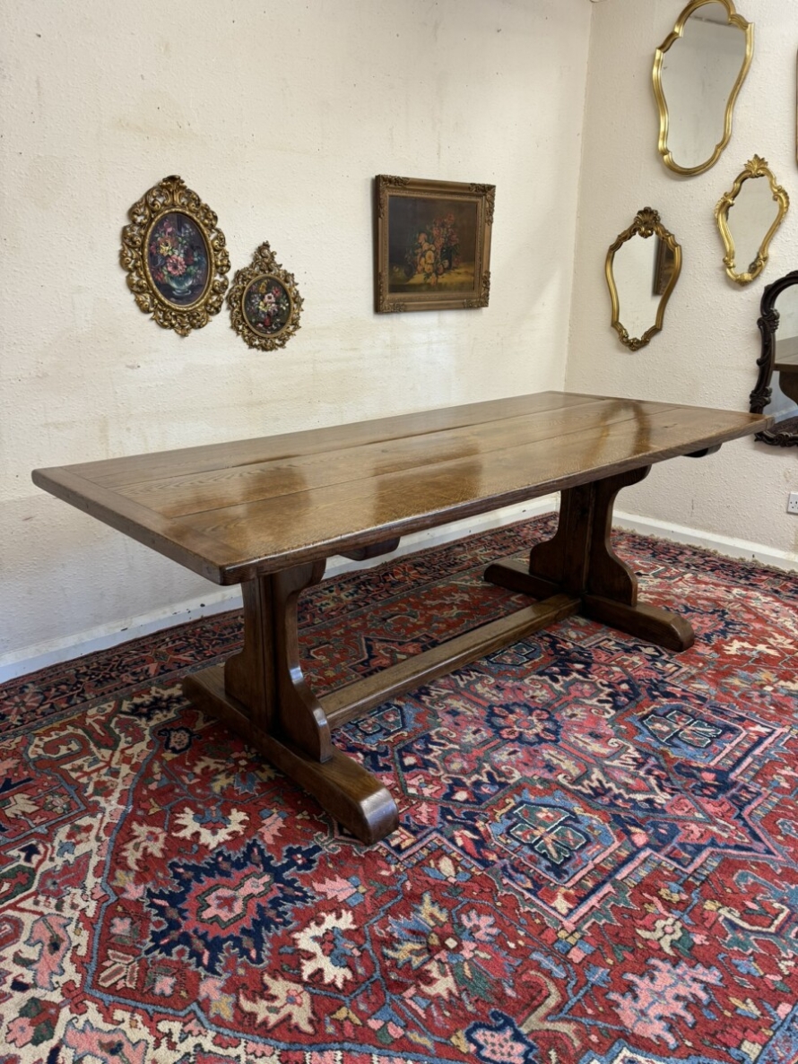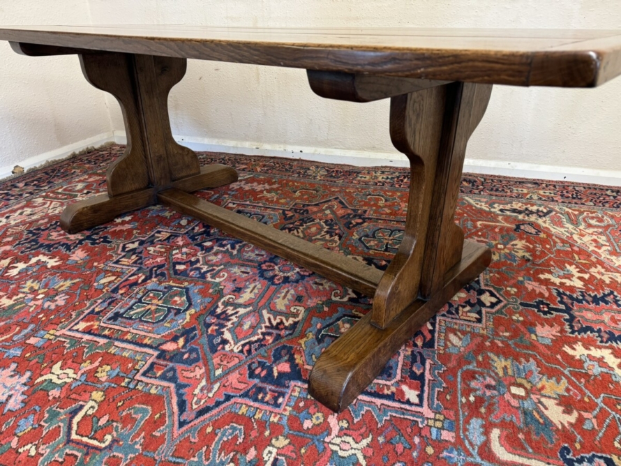 The table is made entirely in solid oak. The three planked thick top sits on a slab ended base with stretcher support.