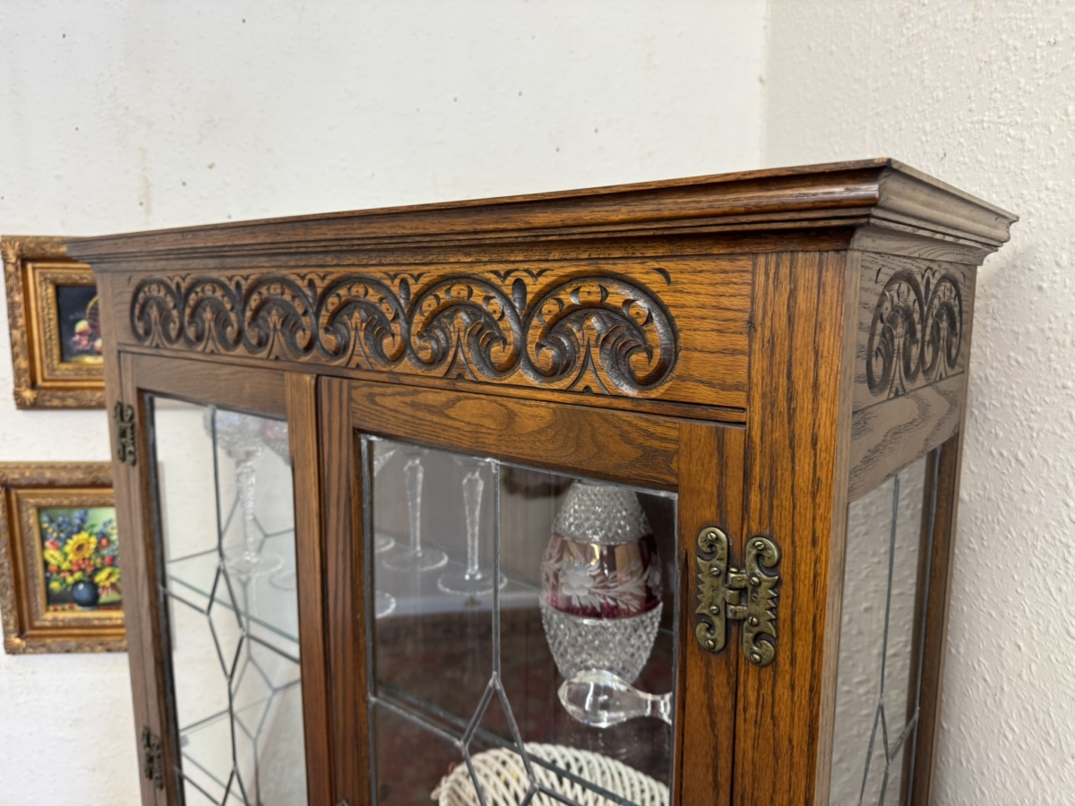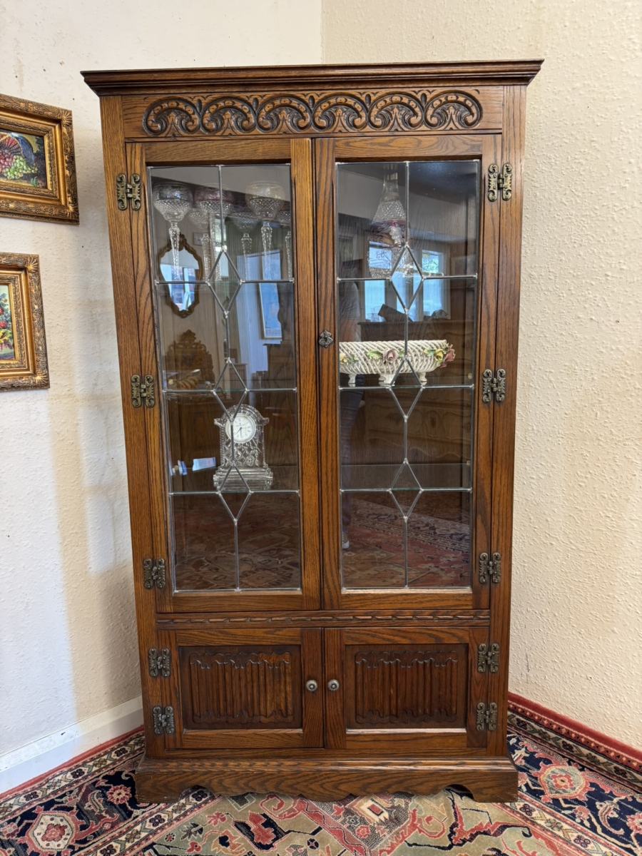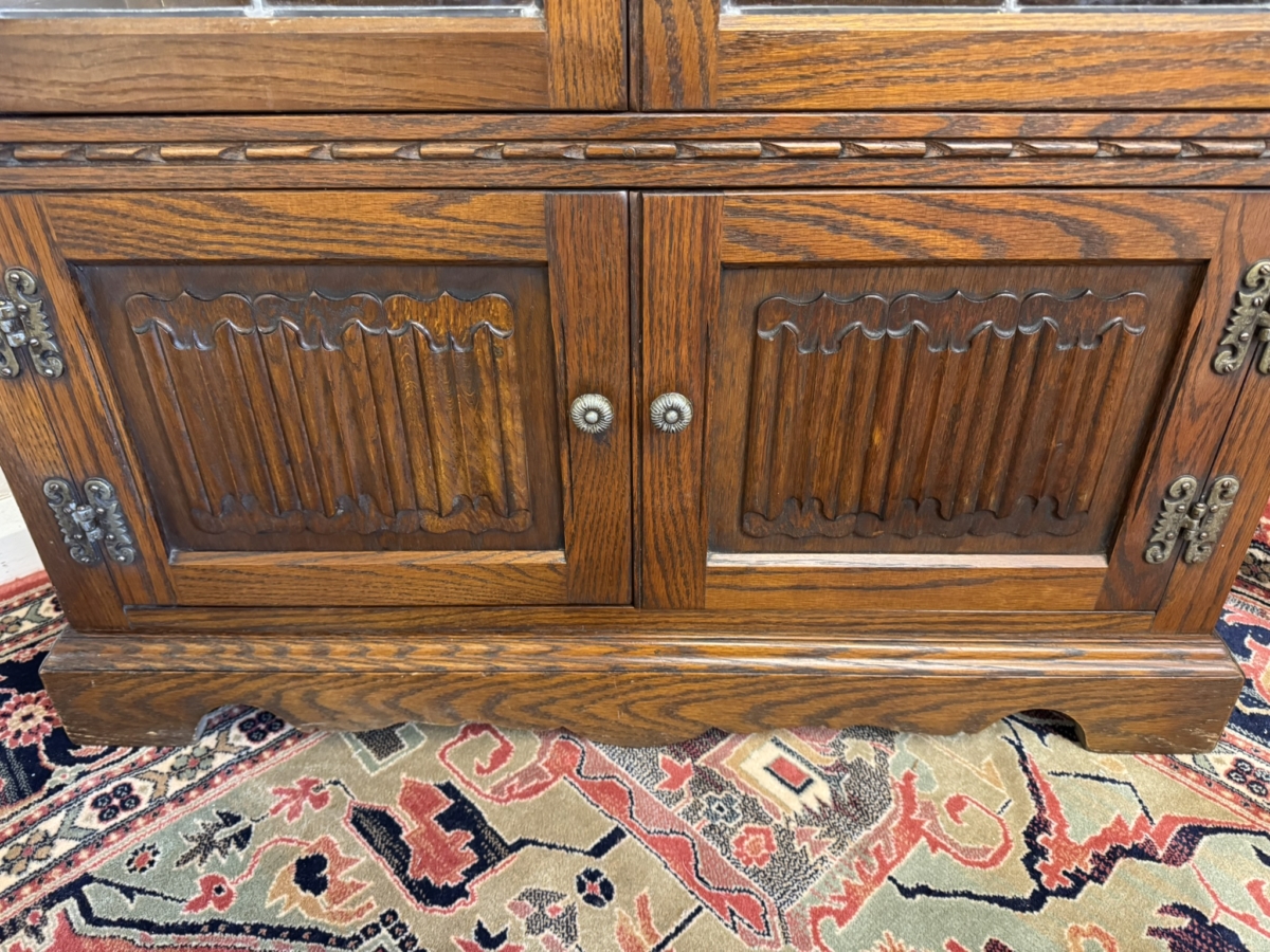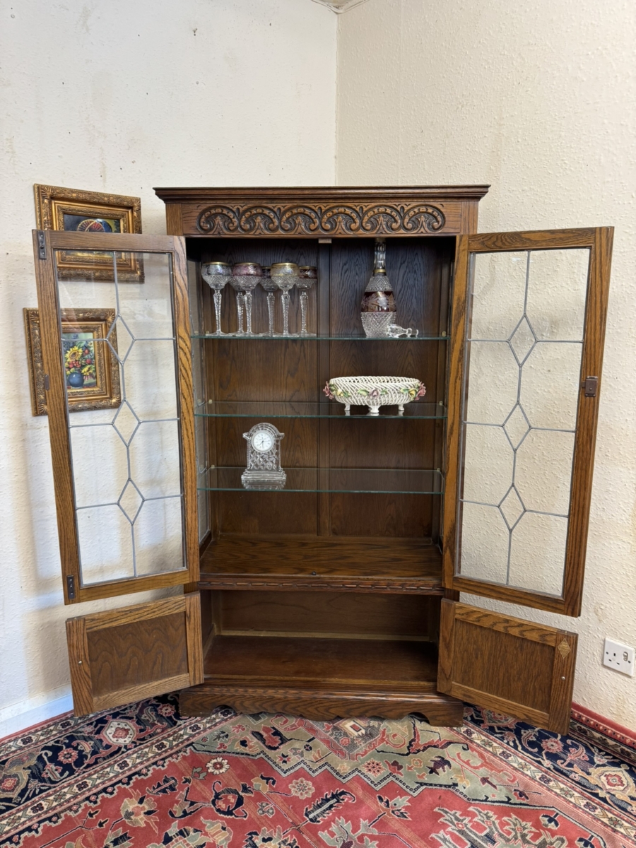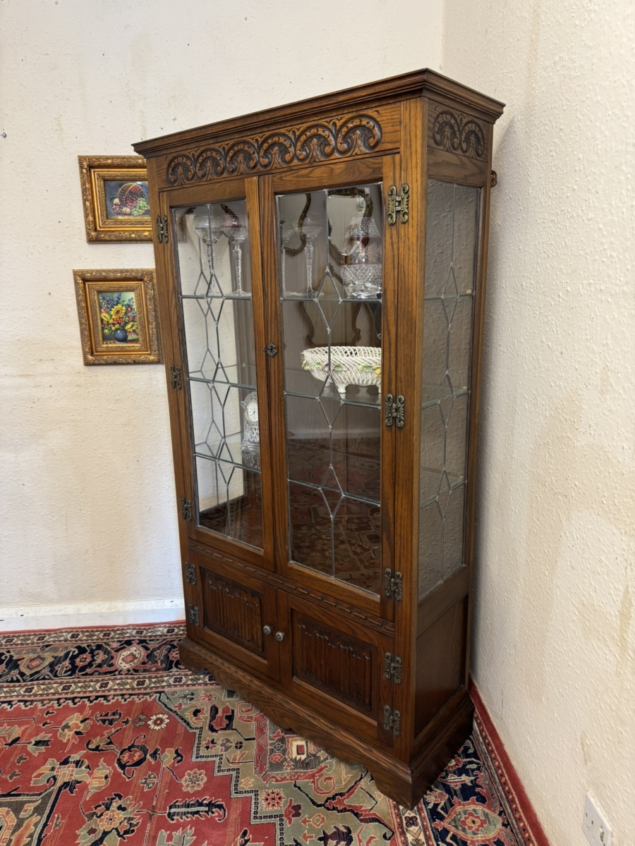 This super quality cabinet was made by the renowned old charm furniture makers. The carved top sits above a pair of lockable glazed doors, the doors open to reveal three removable glass shelves, below are a pair of linen fold decorated cupboard doors, the doors open to reveal storage area. The cabinet sits on a plinth base.