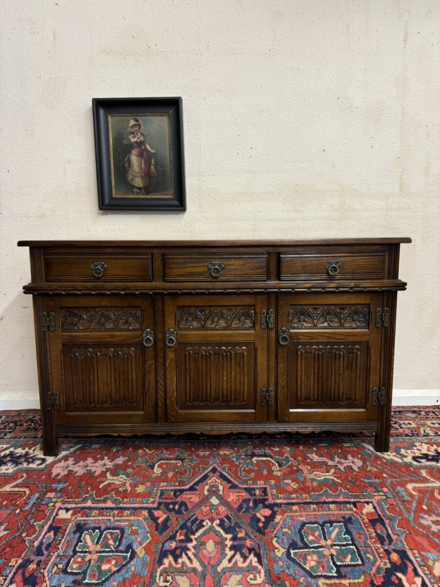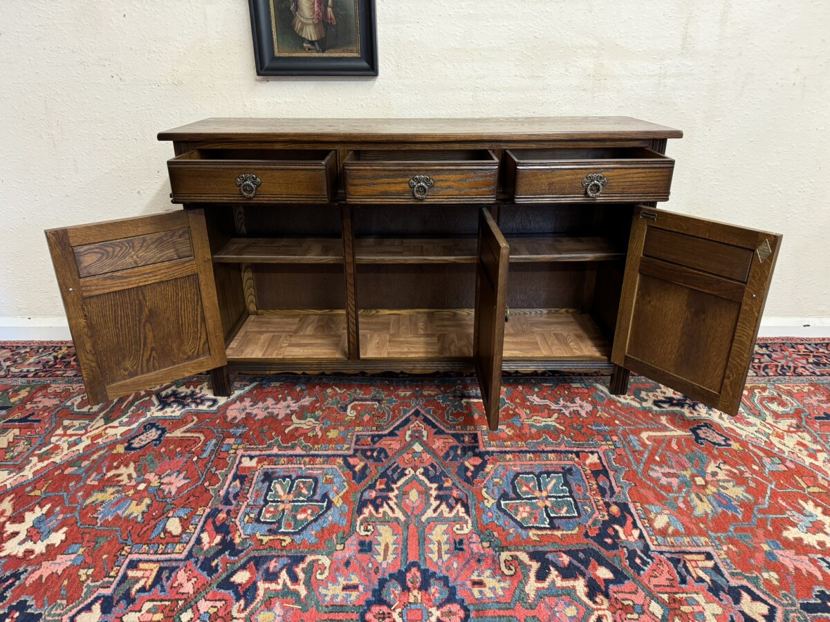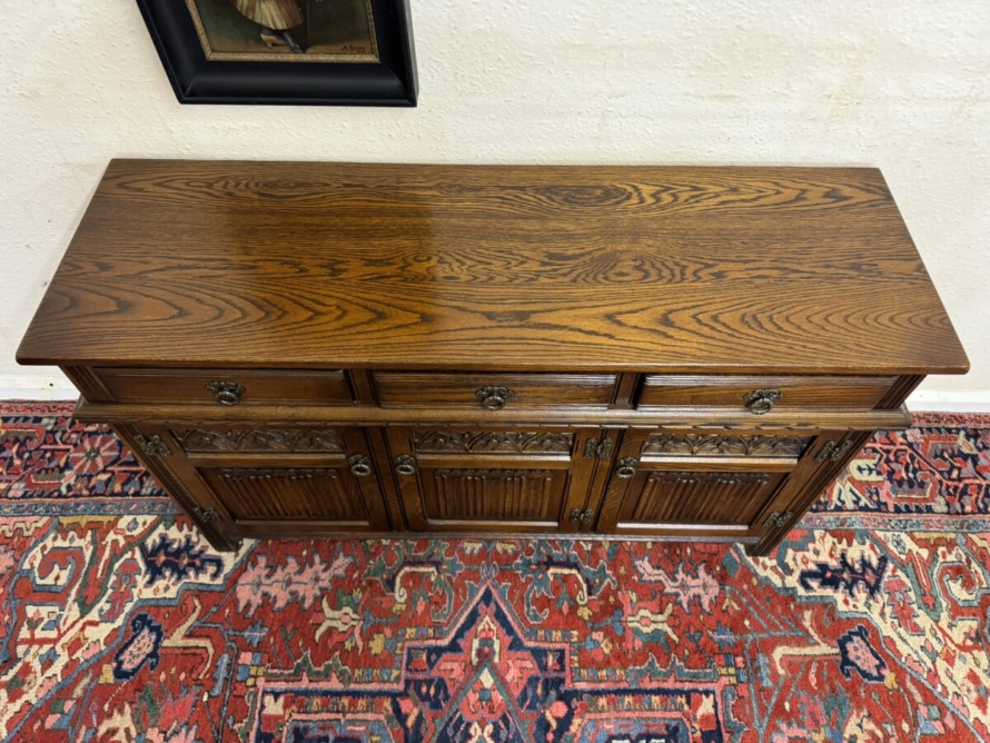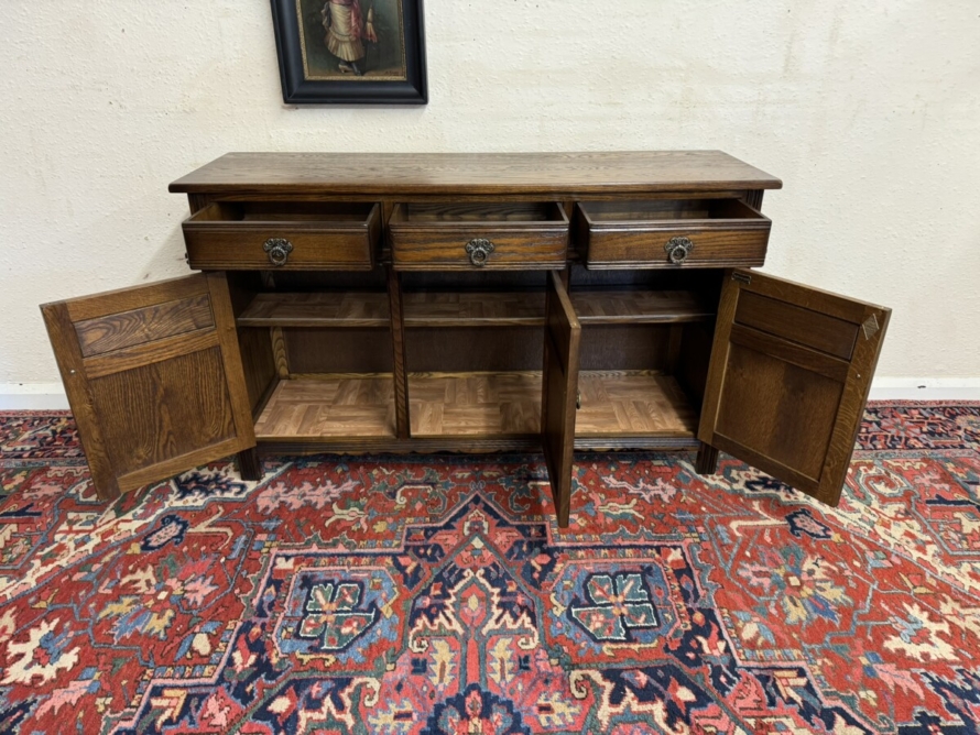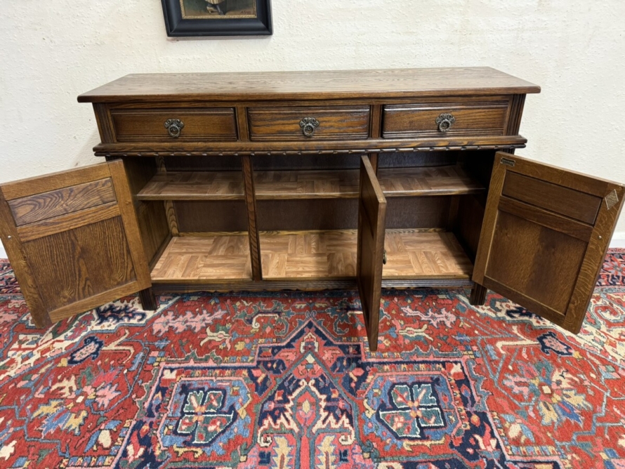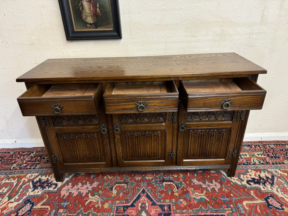 This fabulous sideboard is made by the renowned Old Charm furniture manufactures. The oversailing top sits above three drawers, each drawer having a carved metal handle, below are three carved cupboard doors, each door having H hinges and carved metal handles. The doors open to reveal a shelf. Recessed panelled sides shaped skirt and standing on traditional block feet.