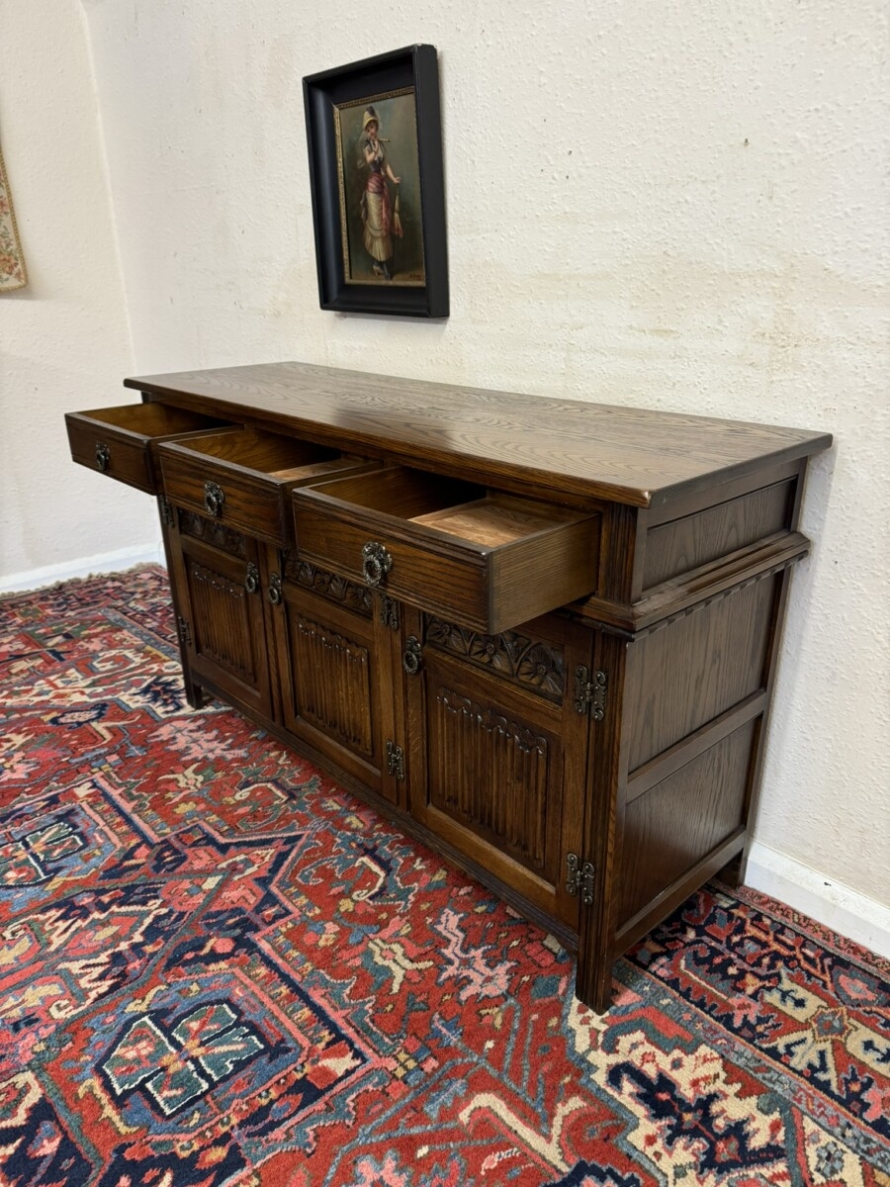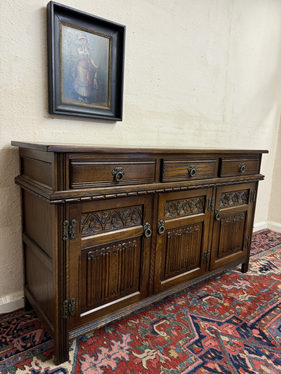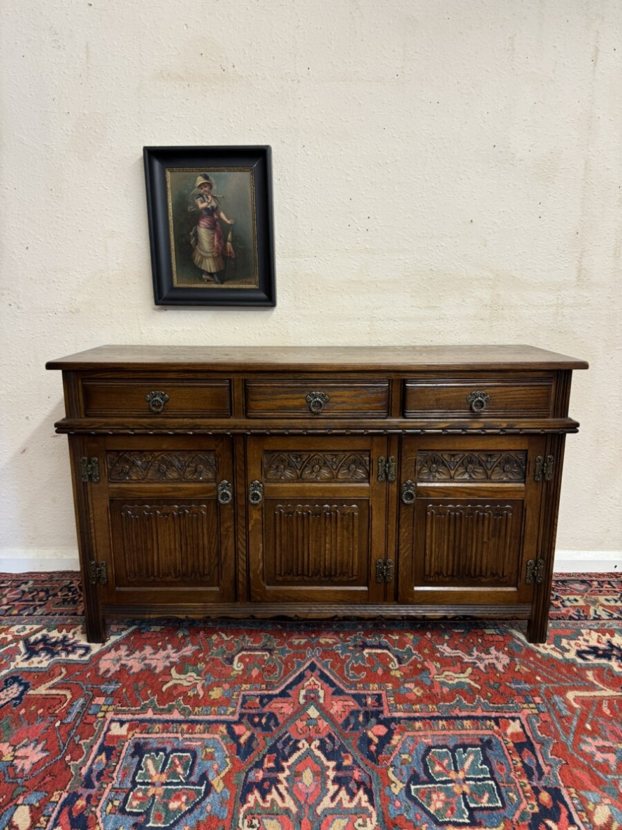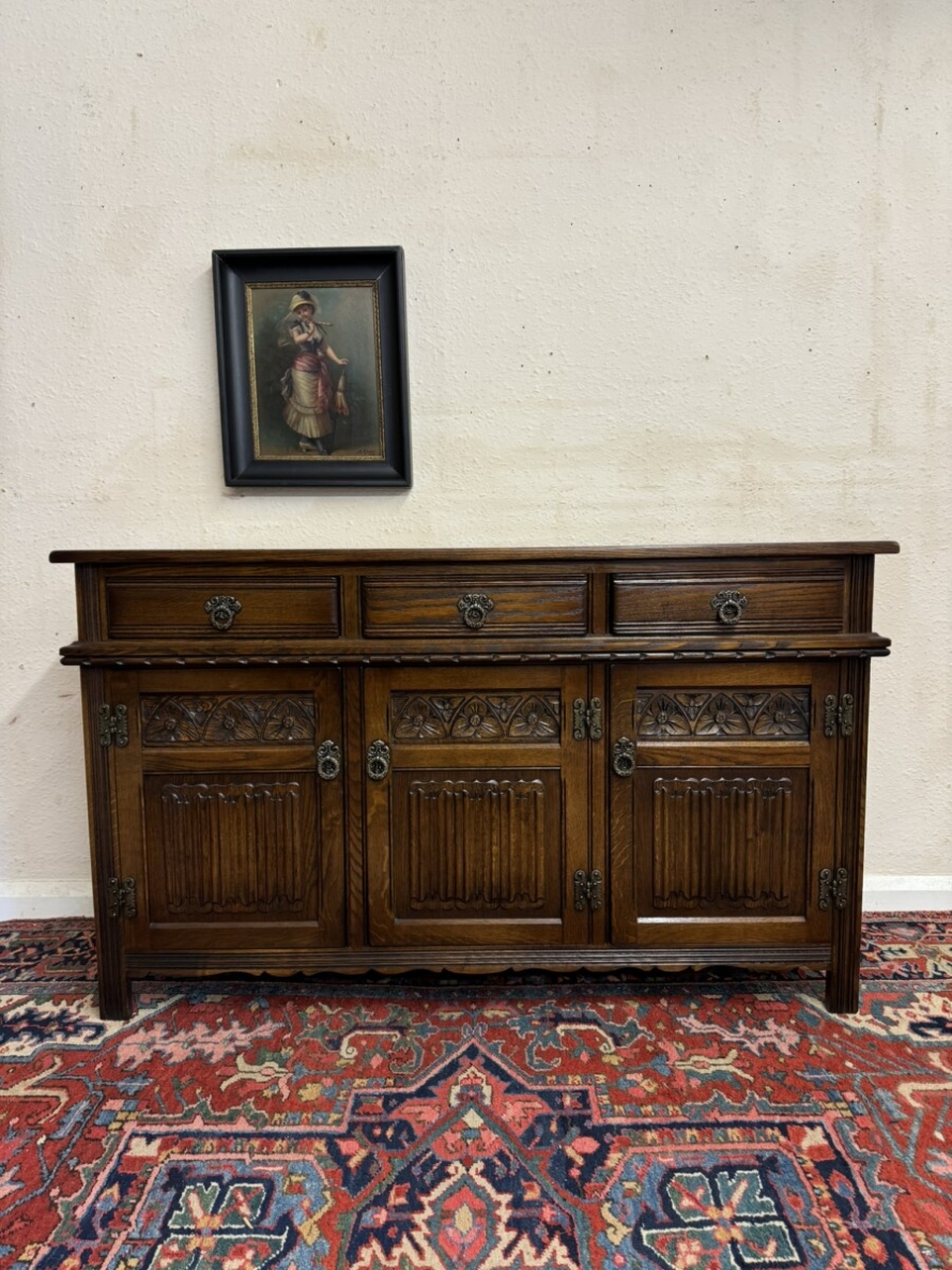 This fabulous sideboard is made by the renowned Old Charm furniture manufactures. The oversailing top sits above three drawers, each drawer having a carved metal handle, below are three carved cupboard doors, each door having H hinges and carved metal handles. The doors open to reveal a shelf. Recessed panelled sides shaped skirt and standing on traditional block feet.