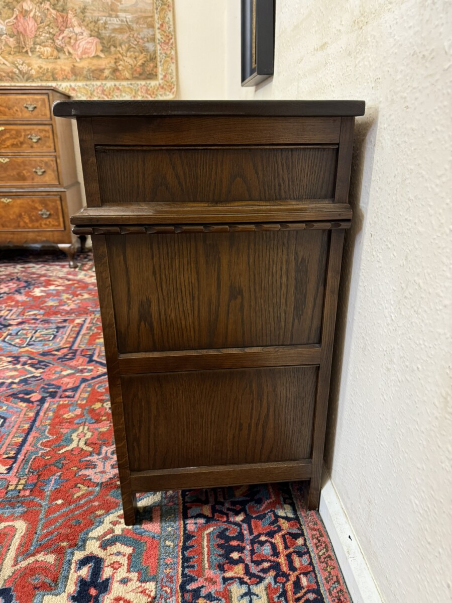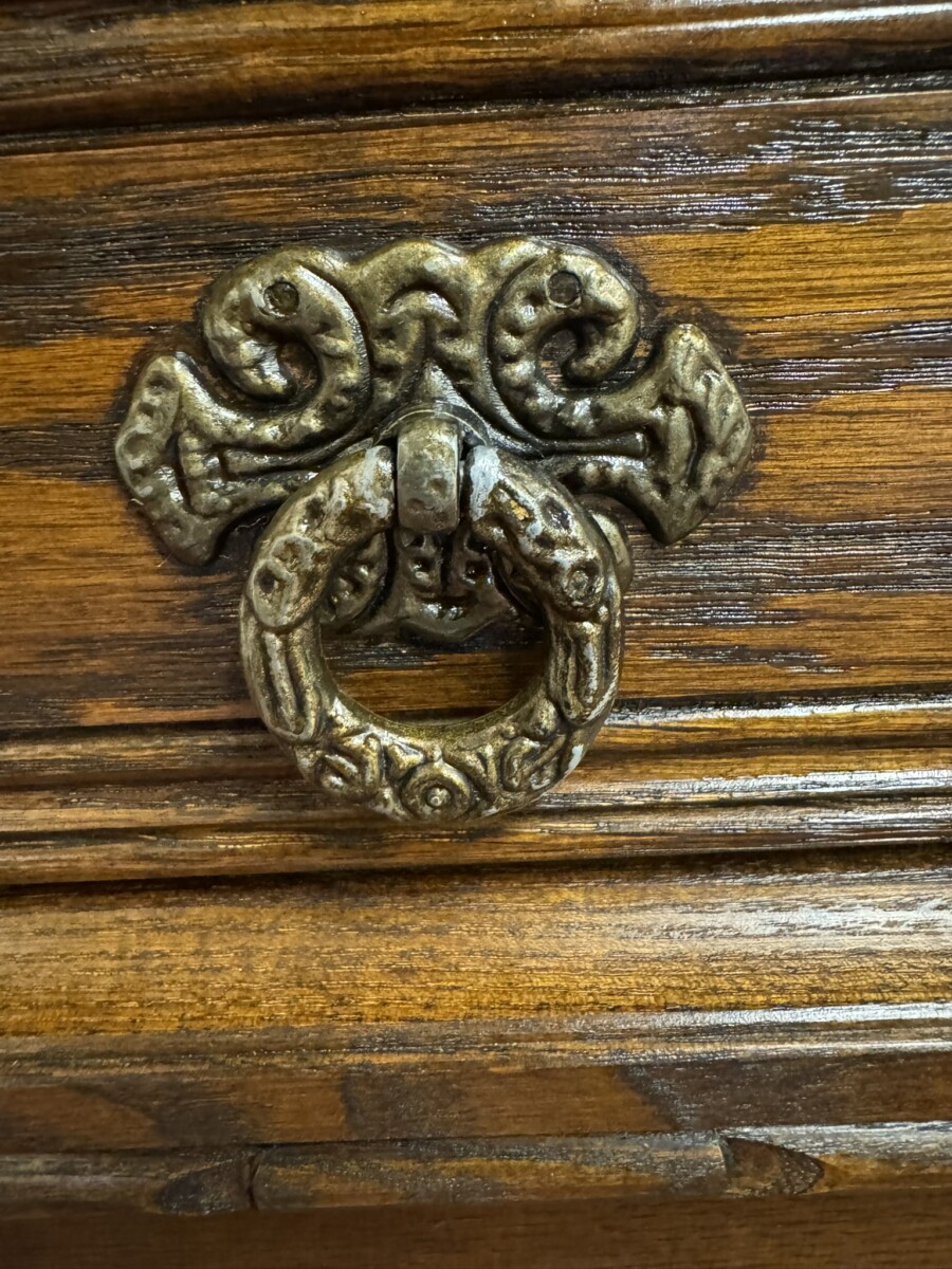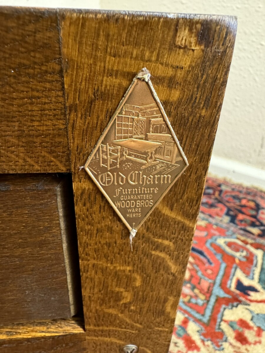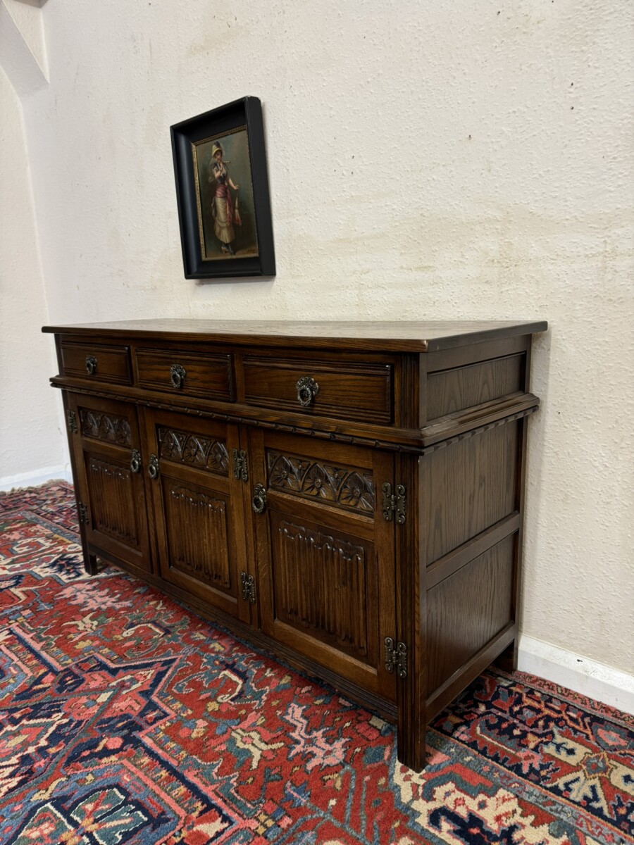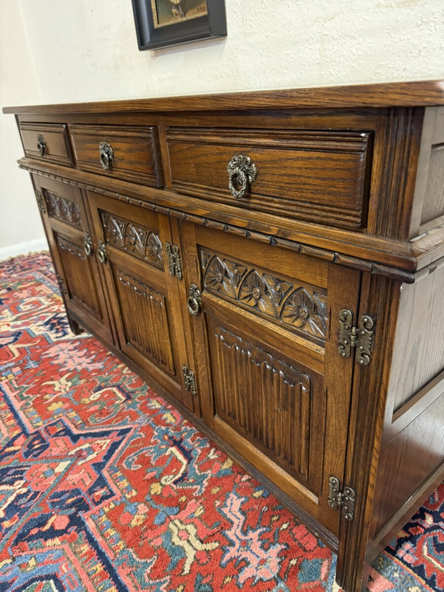 This fabulous sideboard is made by the renowned Old Charm furniture manufactures. The oversailing top sits above three drawers, each drawer having a carved metal handle, below are three carved cupboard doors, each door having H hinges and carved metal handles. The doors open to reveal a shelf. Recessed panelled sides shaped skirt and standing on traditional block feet.