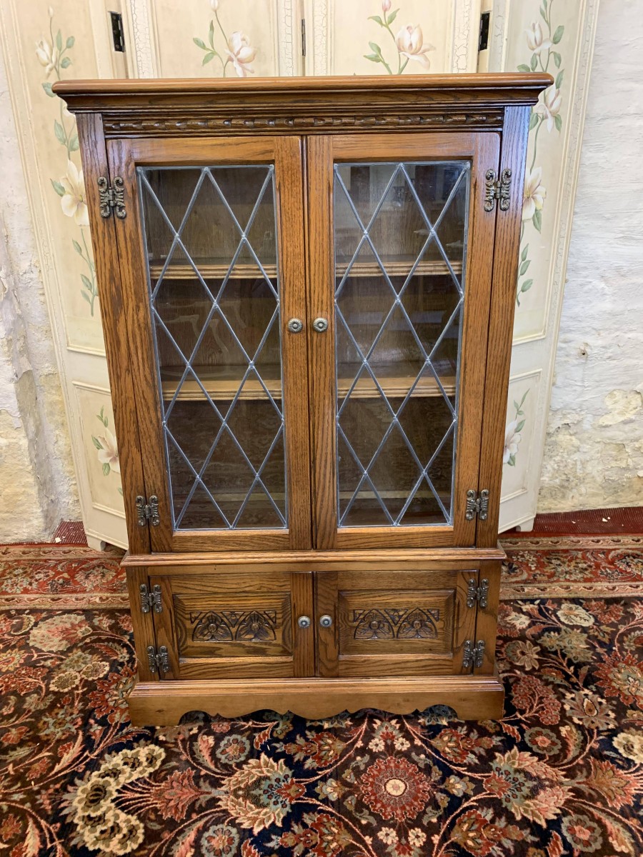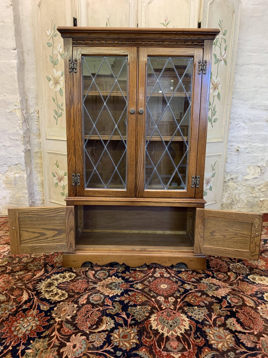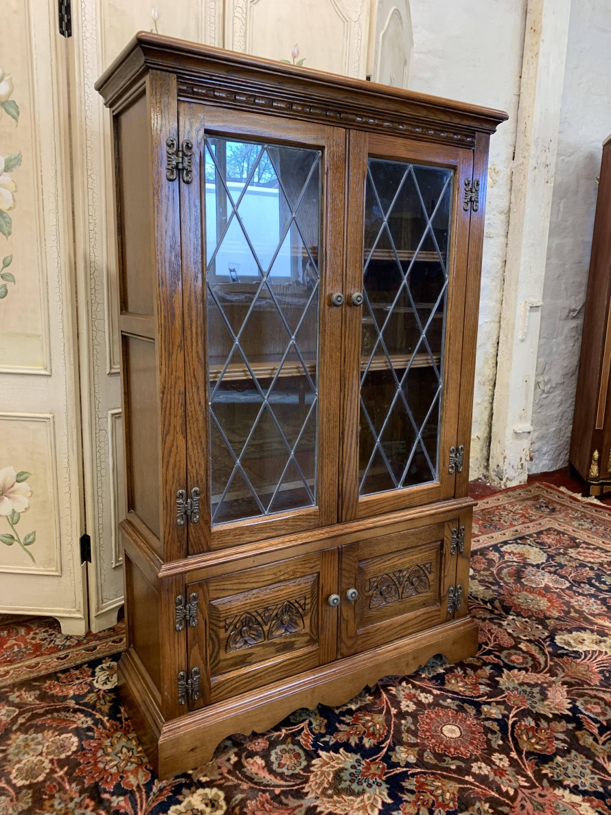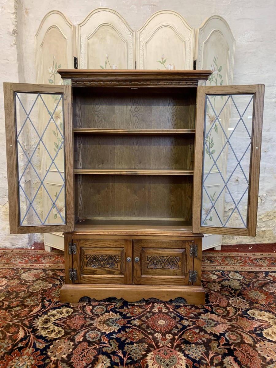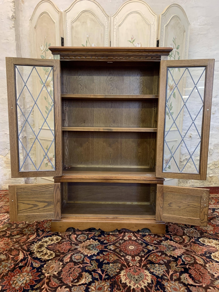 This super bookcase is in excellent condition and was made by the renowned Old Charm furniture company. The oversailing top sits above two glazed doors, the doors having leaded decoration, decorative hinges and turned handle. The doors open to reveal two adjustable and removable shelves. Below are a pair of carved recessed panelled doors, each door having decorative hinges and turned handle. The doors open to reveal a good sized storage space. Shaped skirt to the front, this super bookcase stands on bracket feet.